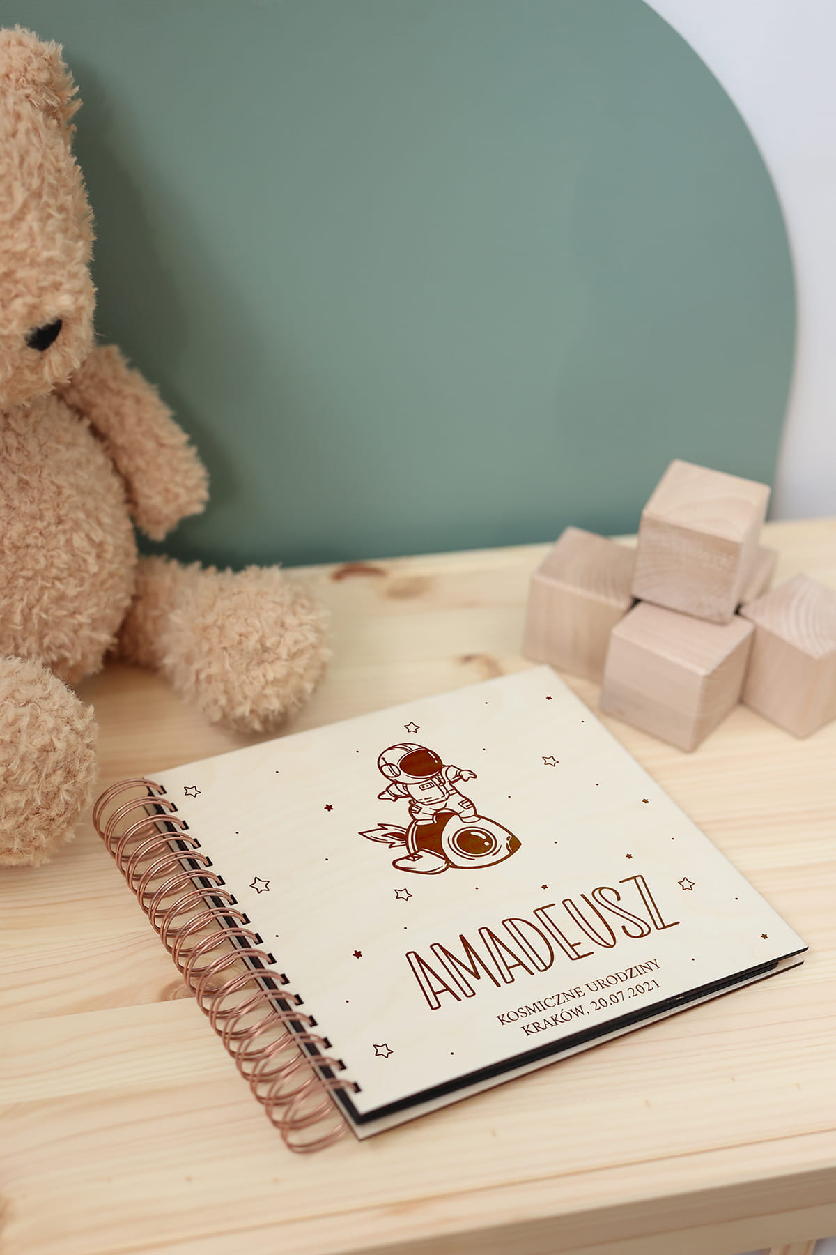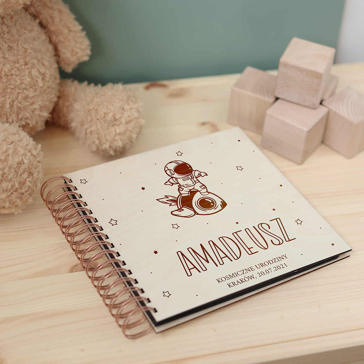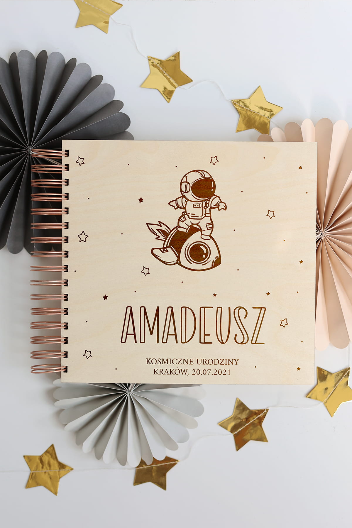 Album z drewnianą okładką z motywem astronauty. Idealnie sprawdzi się jako księga gości na przyjęciu urodzinowym lub jako pamiątkowy album wielbiciela kosmicznych przygód.