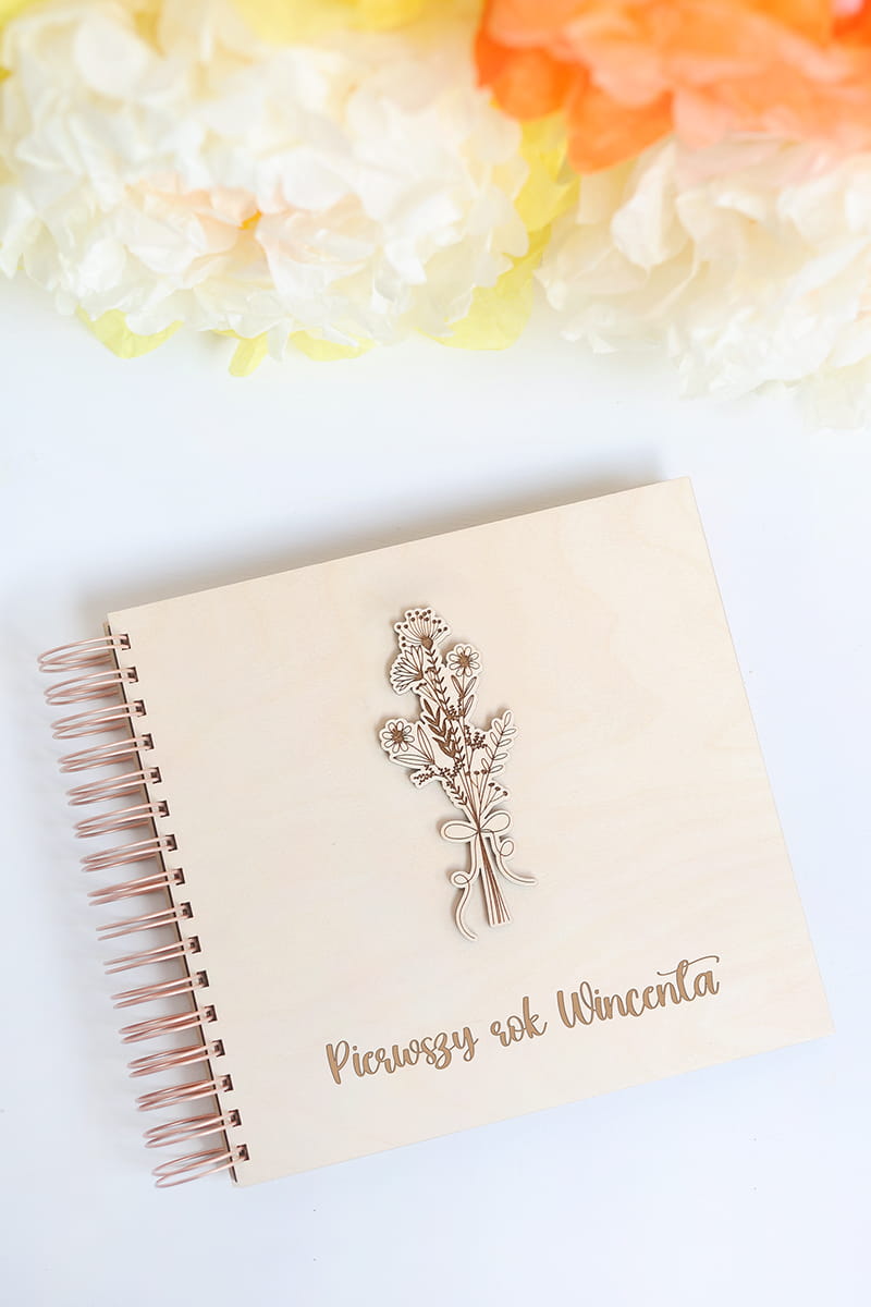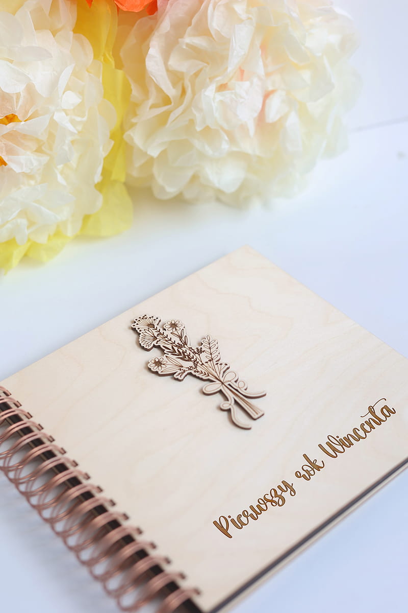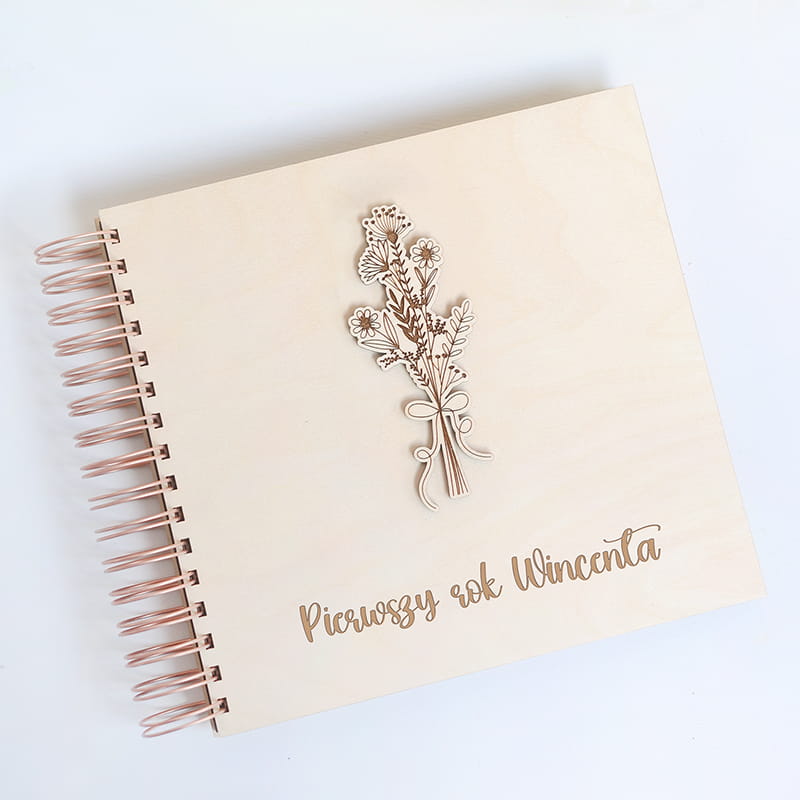 Album z drewnianą okładką z motywem bukietu polnych kwiatów.