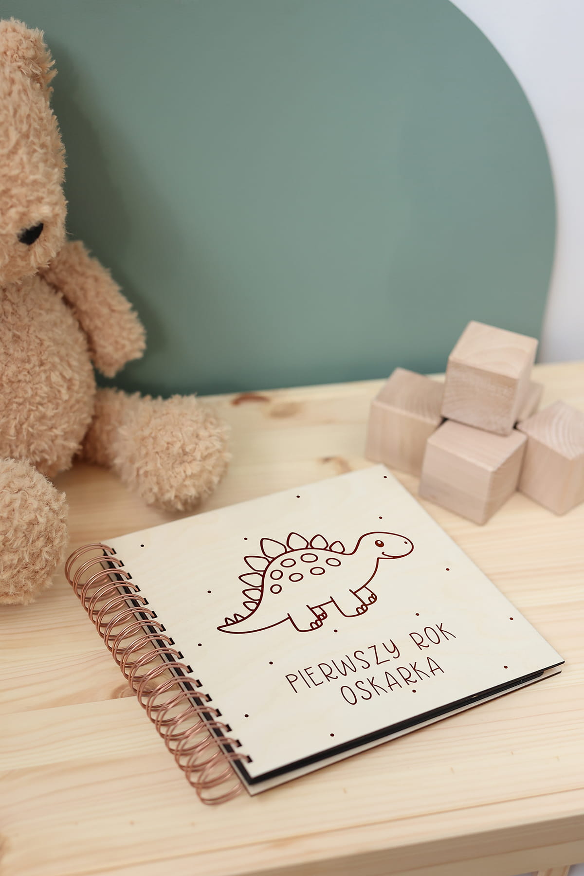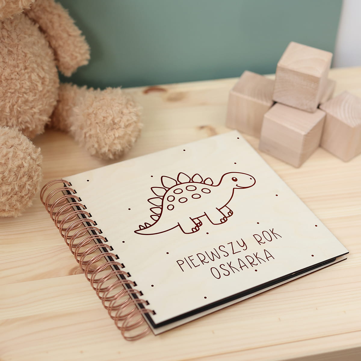 Album z drewnianą okładką z motywem dinozaura. Idealnie sprawdzi się jako księga gości na przyjęciu urodzinowym lub jako pamiątkowy album dla fanów parku jurajskiego.