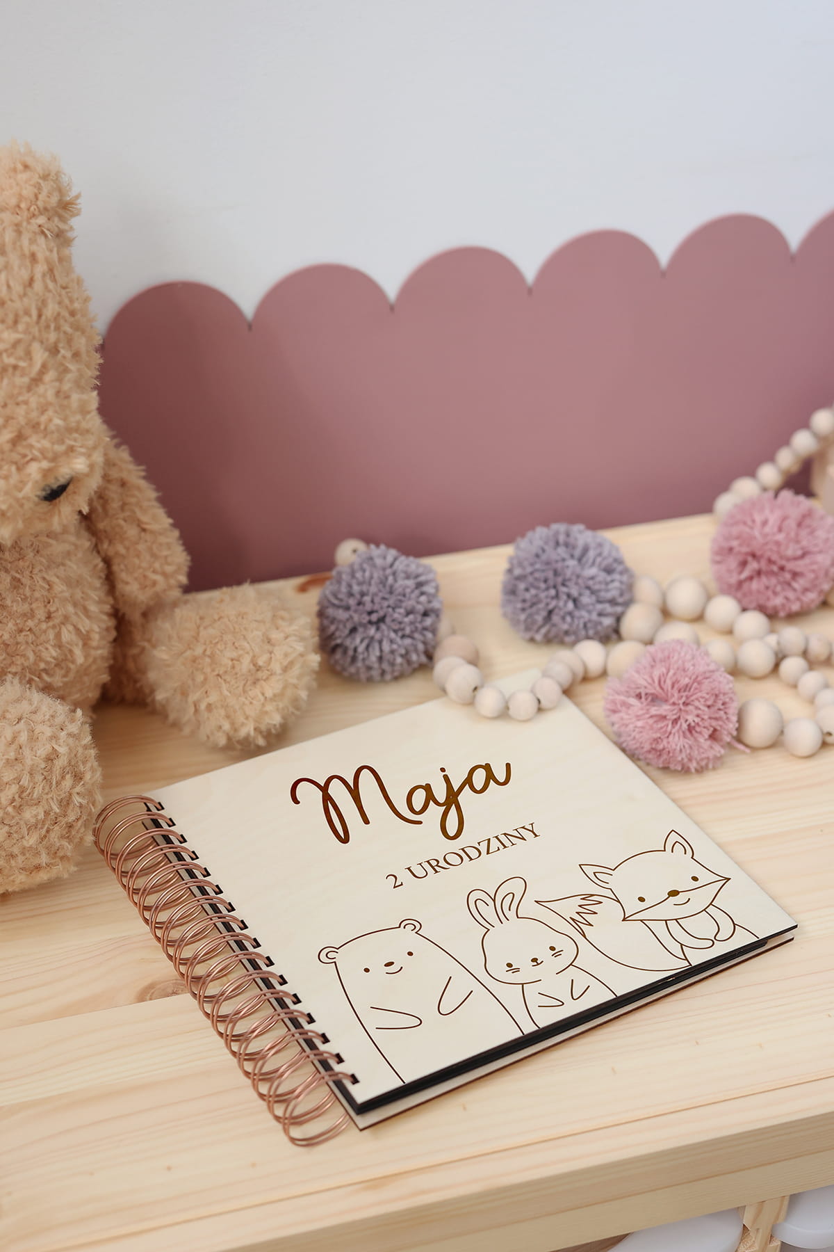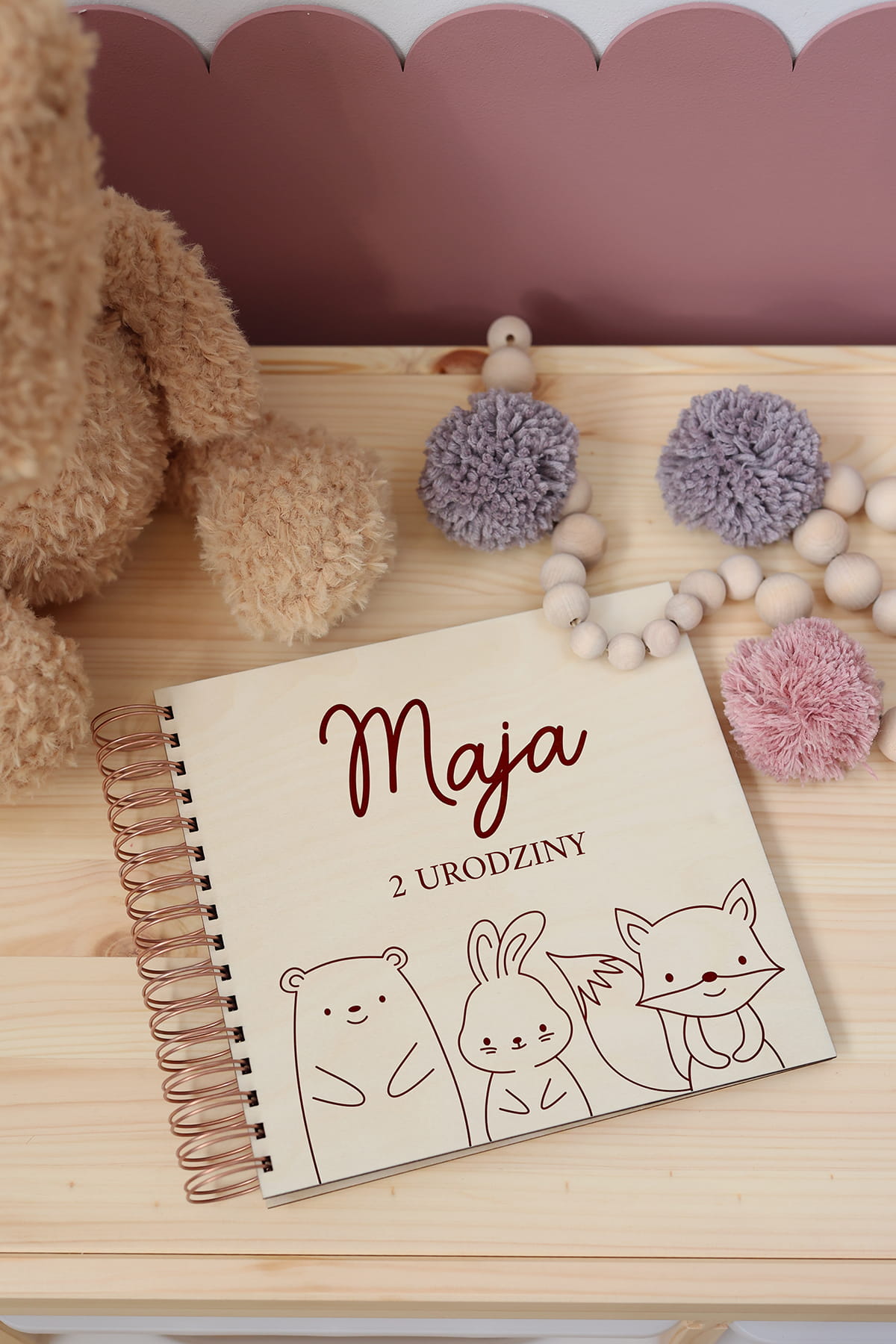 Album z drewnianą okładką z motywem leśnych zwierząt. Idealnie sprawdzi się jako księga gości na przyjęciu urodzinowym lub jako pamiątkowy album dla wielbicieli zwierzątek.