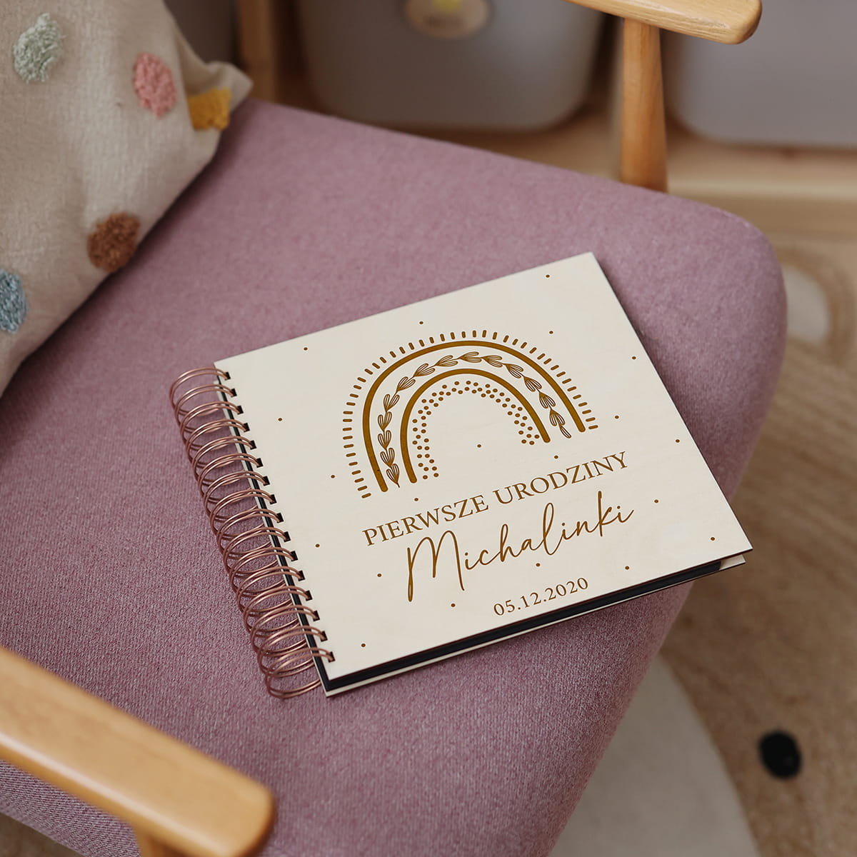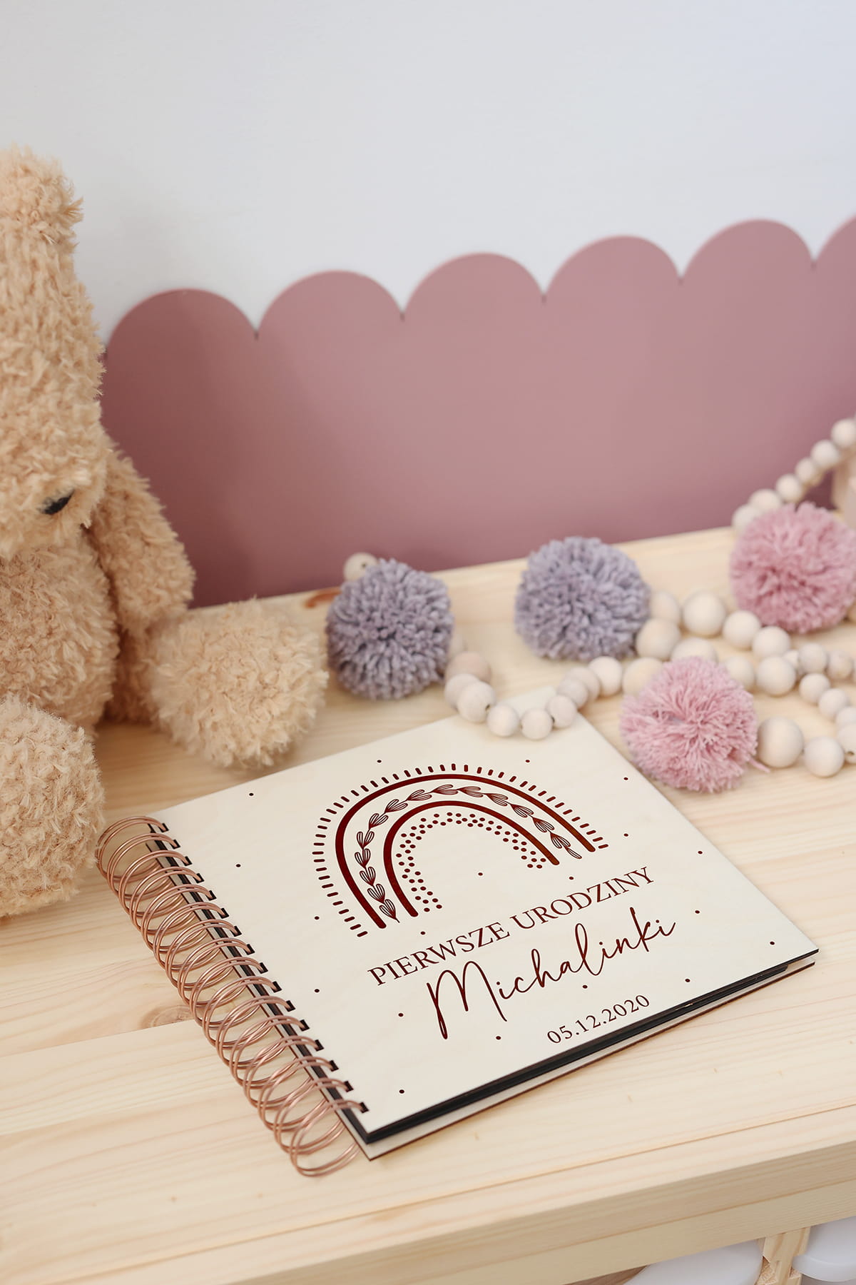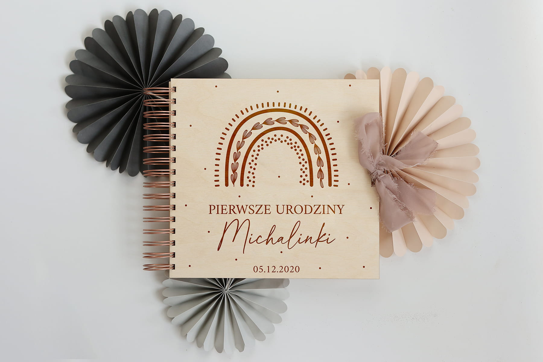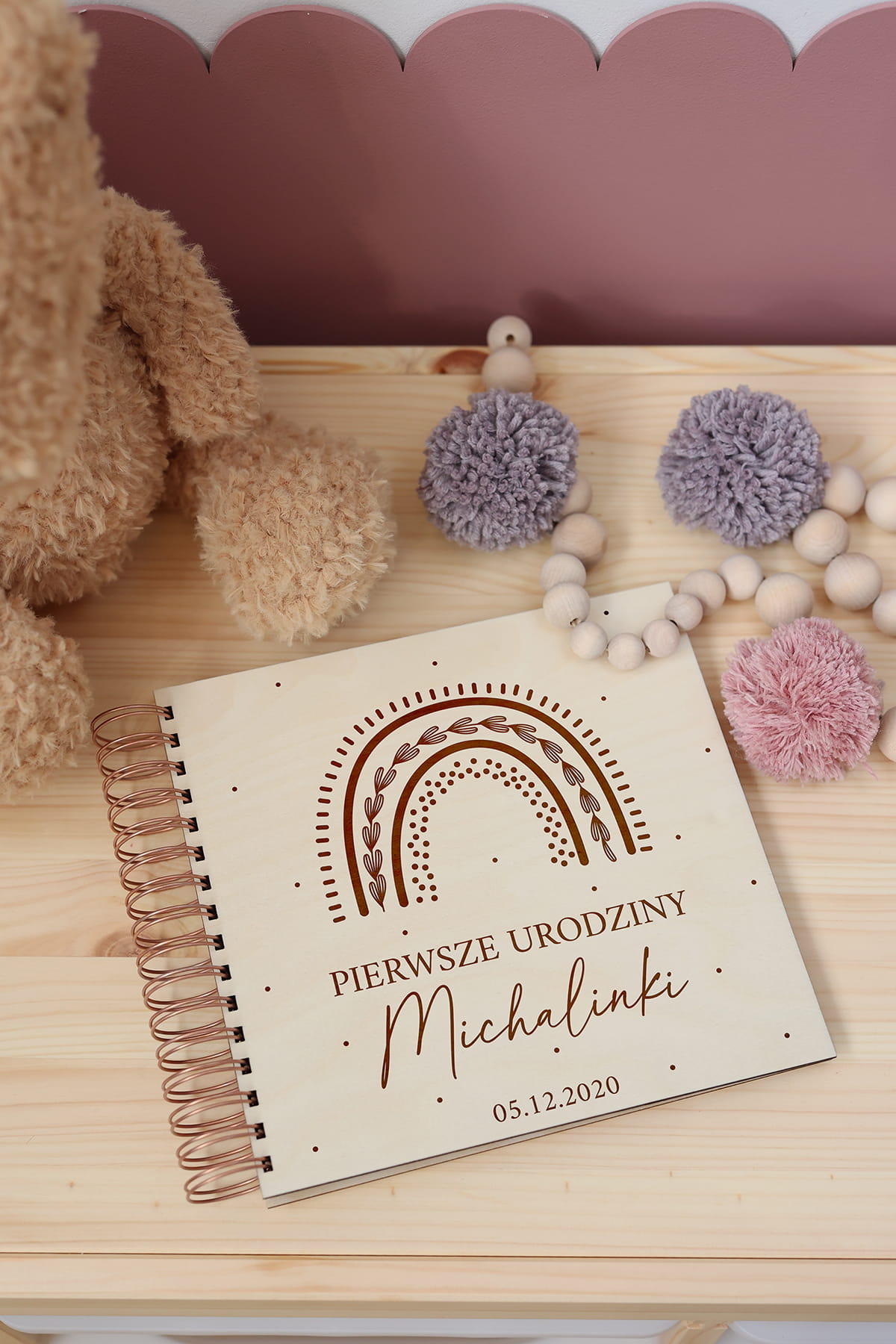 Album z drewnianą okładką z motywem tęczy. Idealnie sprawdzi się jako księga gości na przyjęciu urodzinowym lub jako pamiątkowy album.