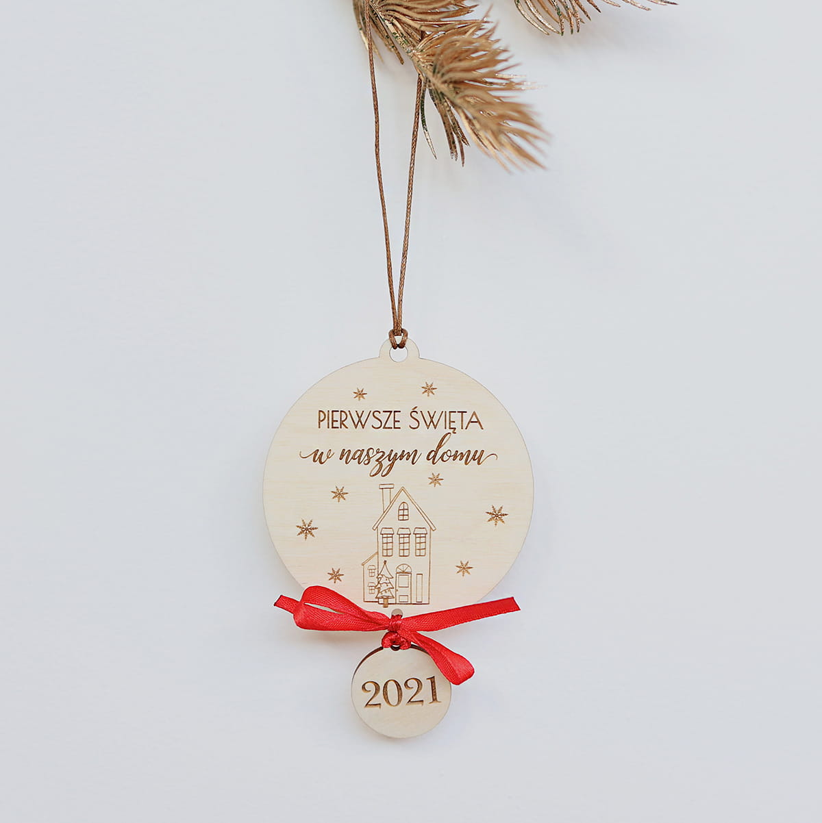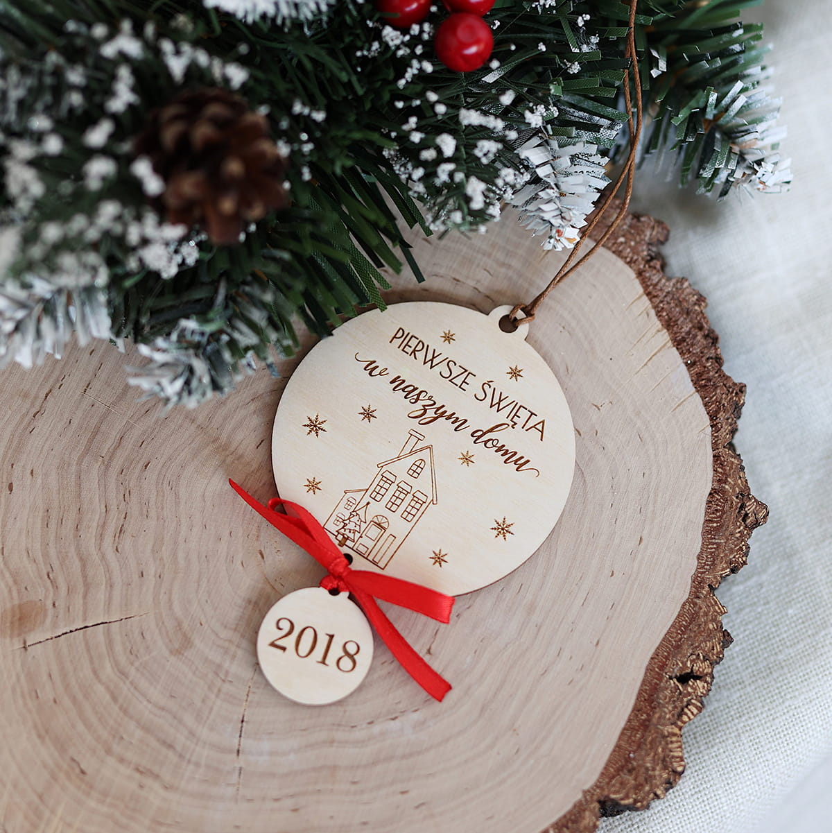 Drewniana bombka z napisem "Pierwsze Święta w naszym domu" i zawieszką z rokiem.