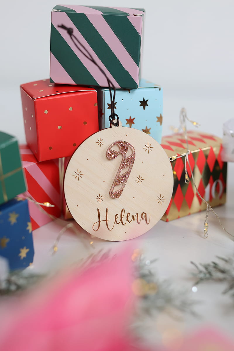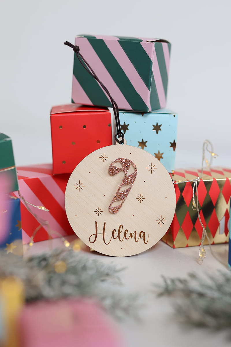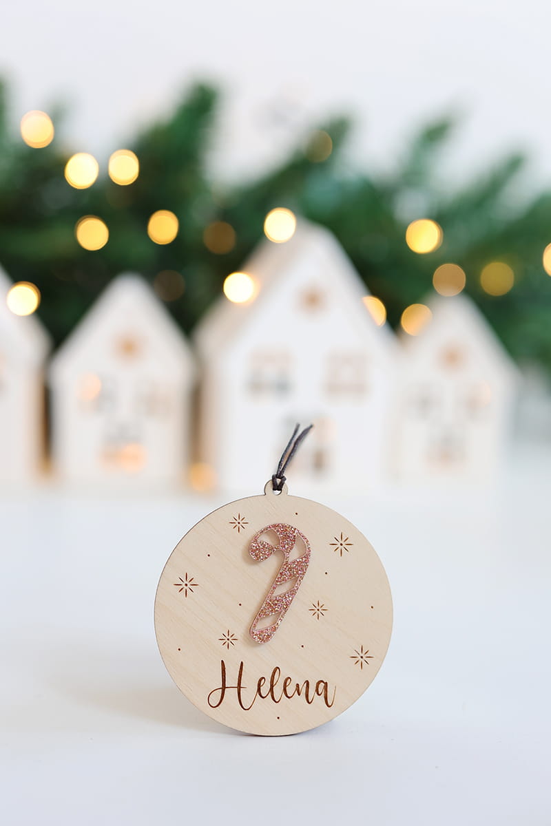 Drewniana, personalizowana bombka z motywem brokatowej laski świątecznej i dowolnym imieniem.