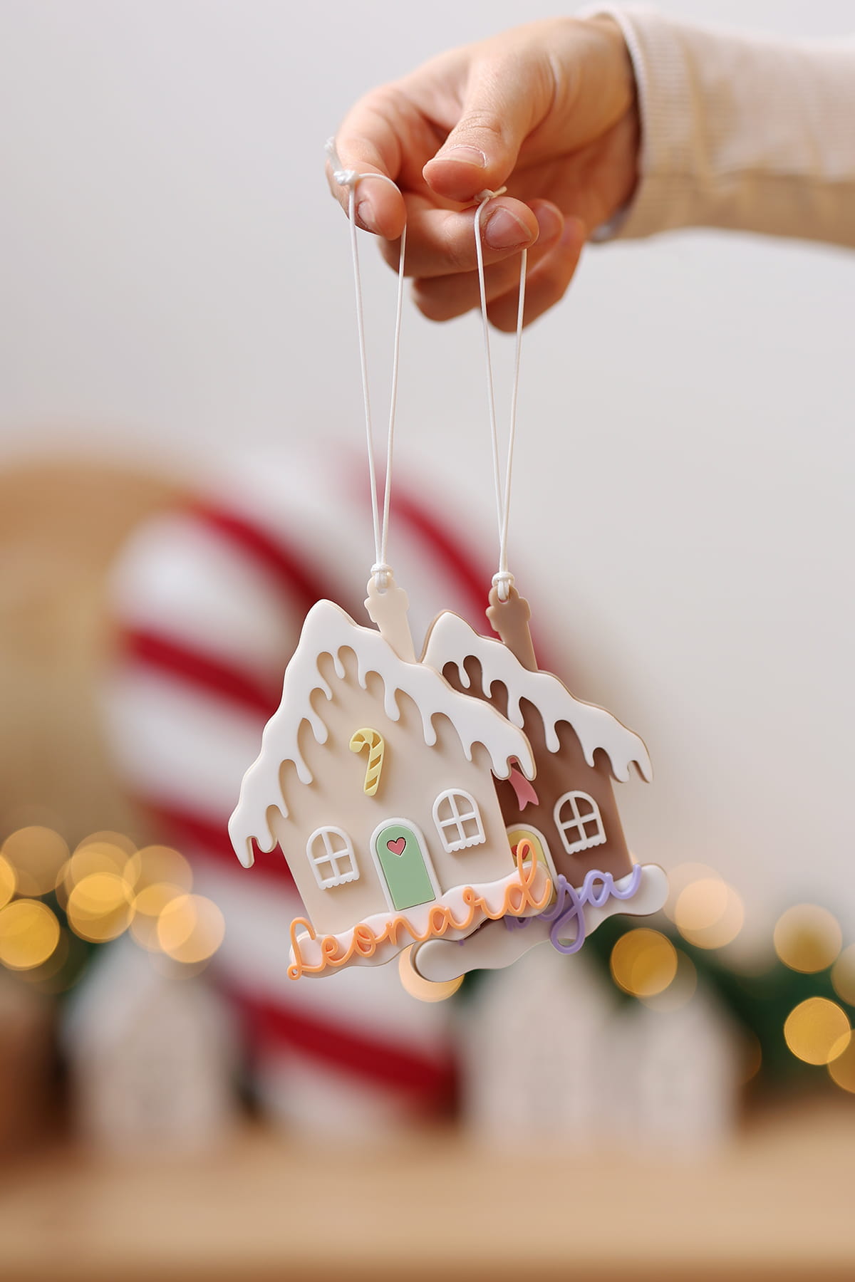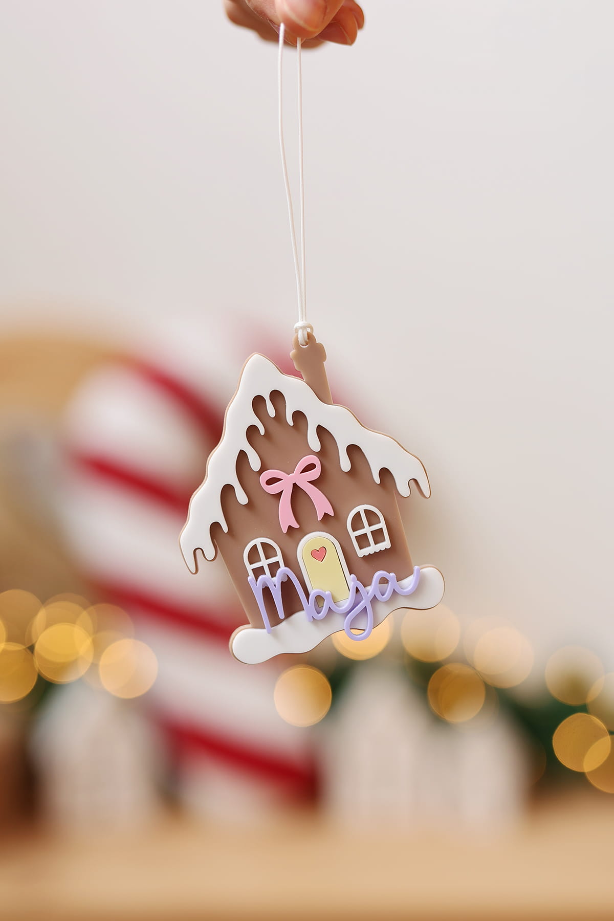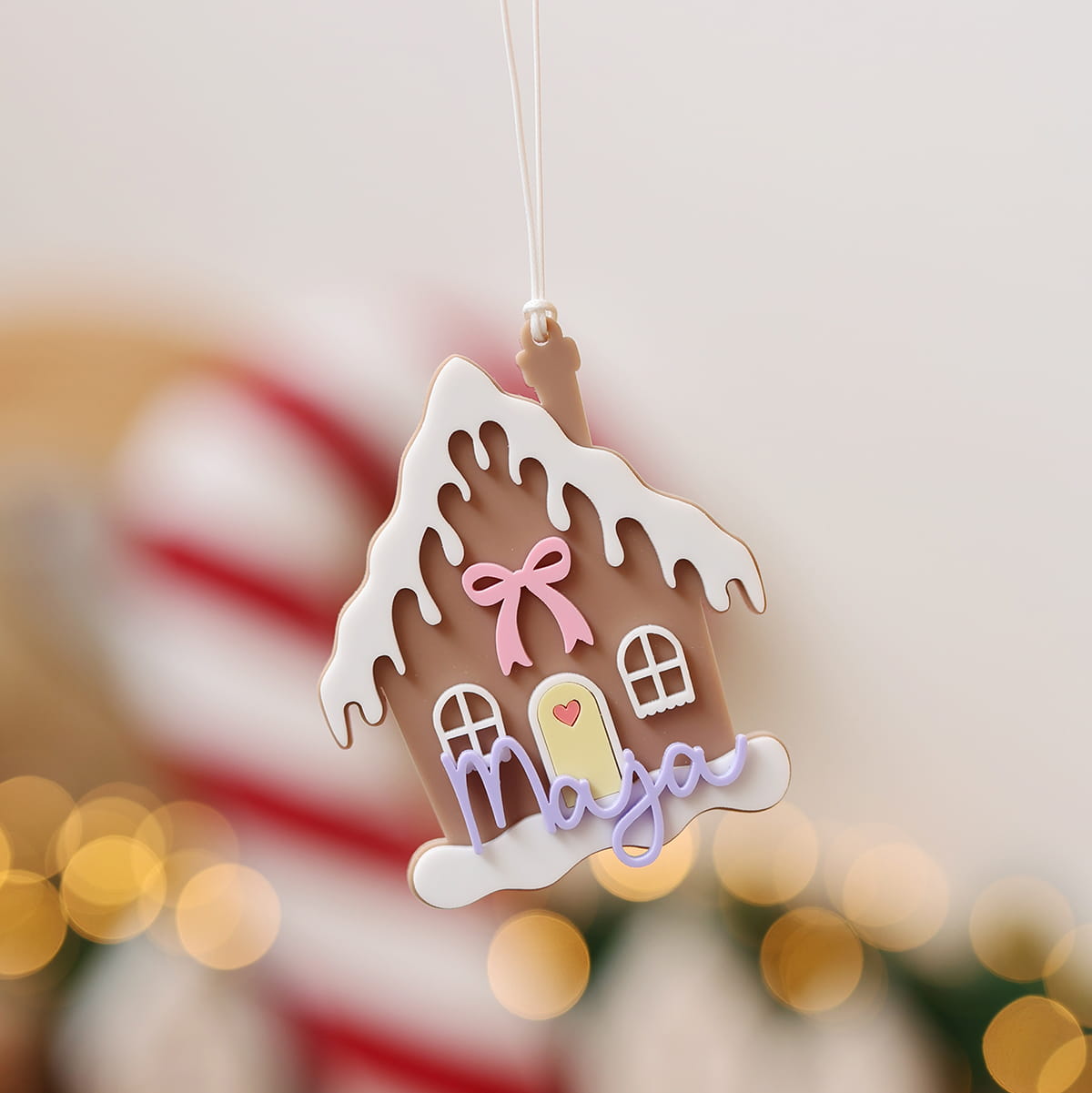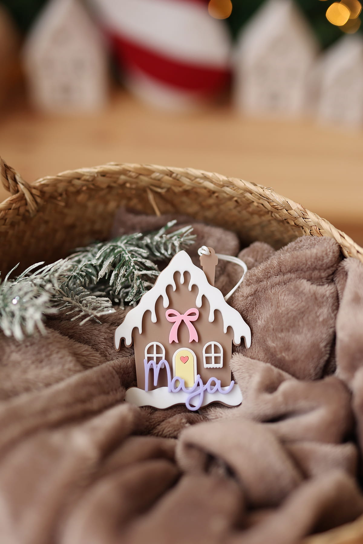 Kolorowa, personalizowana bombka w kształcie piernikowego domku z dowolnym imieniem.