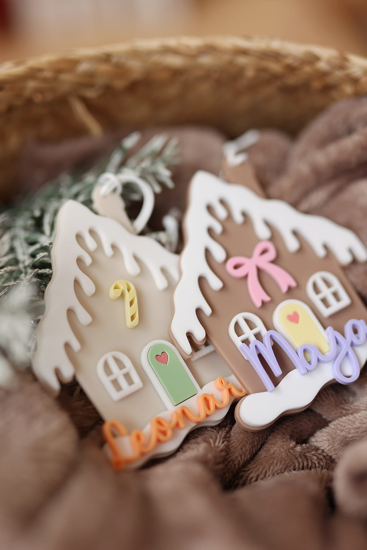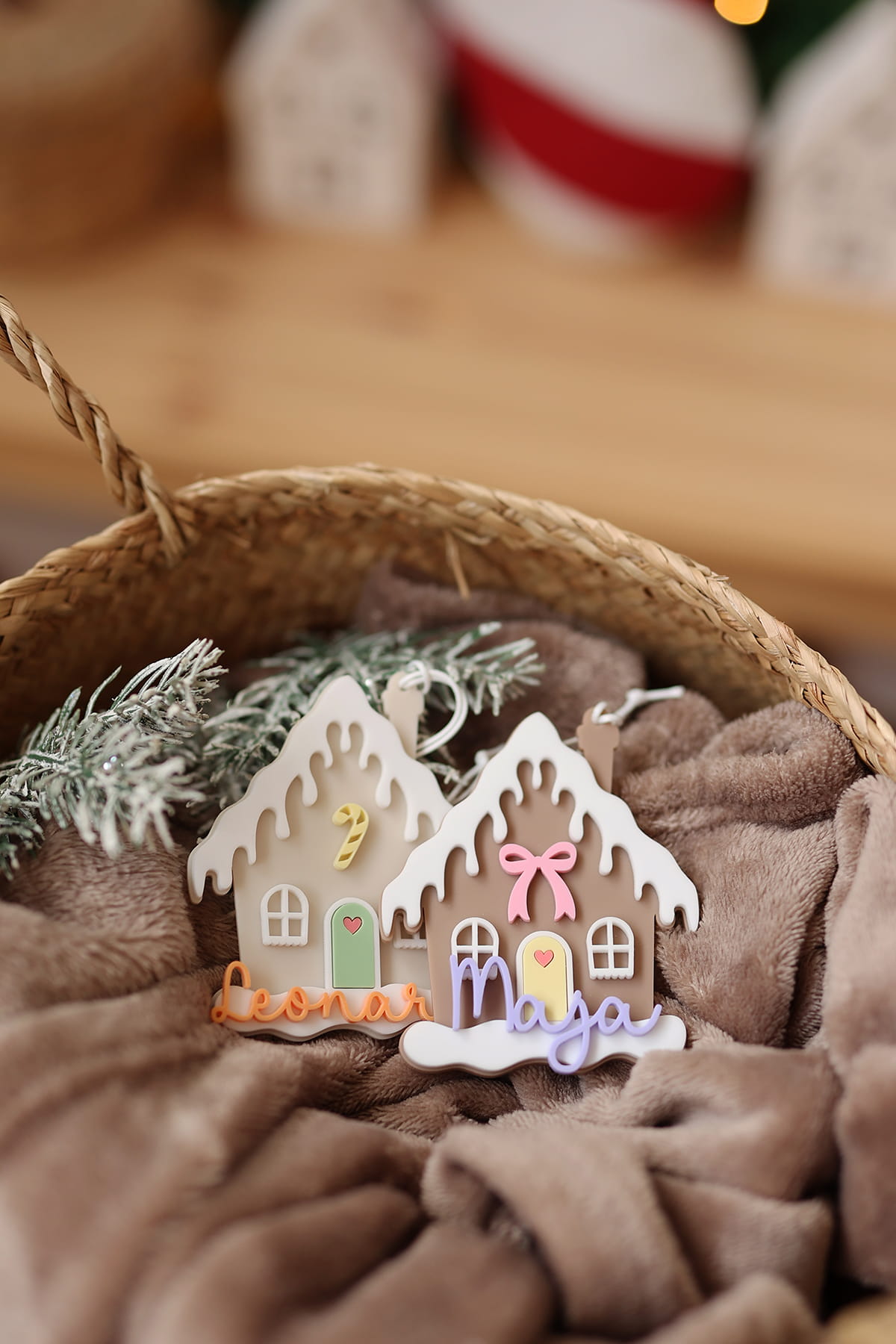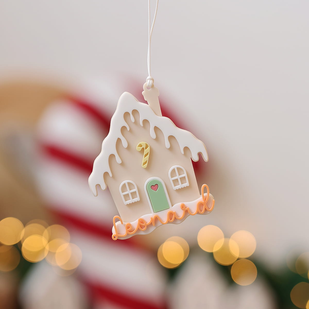 Kolorowa, personalizowana bombka w kształcie piernikowego domku z dowolnym imieniem.