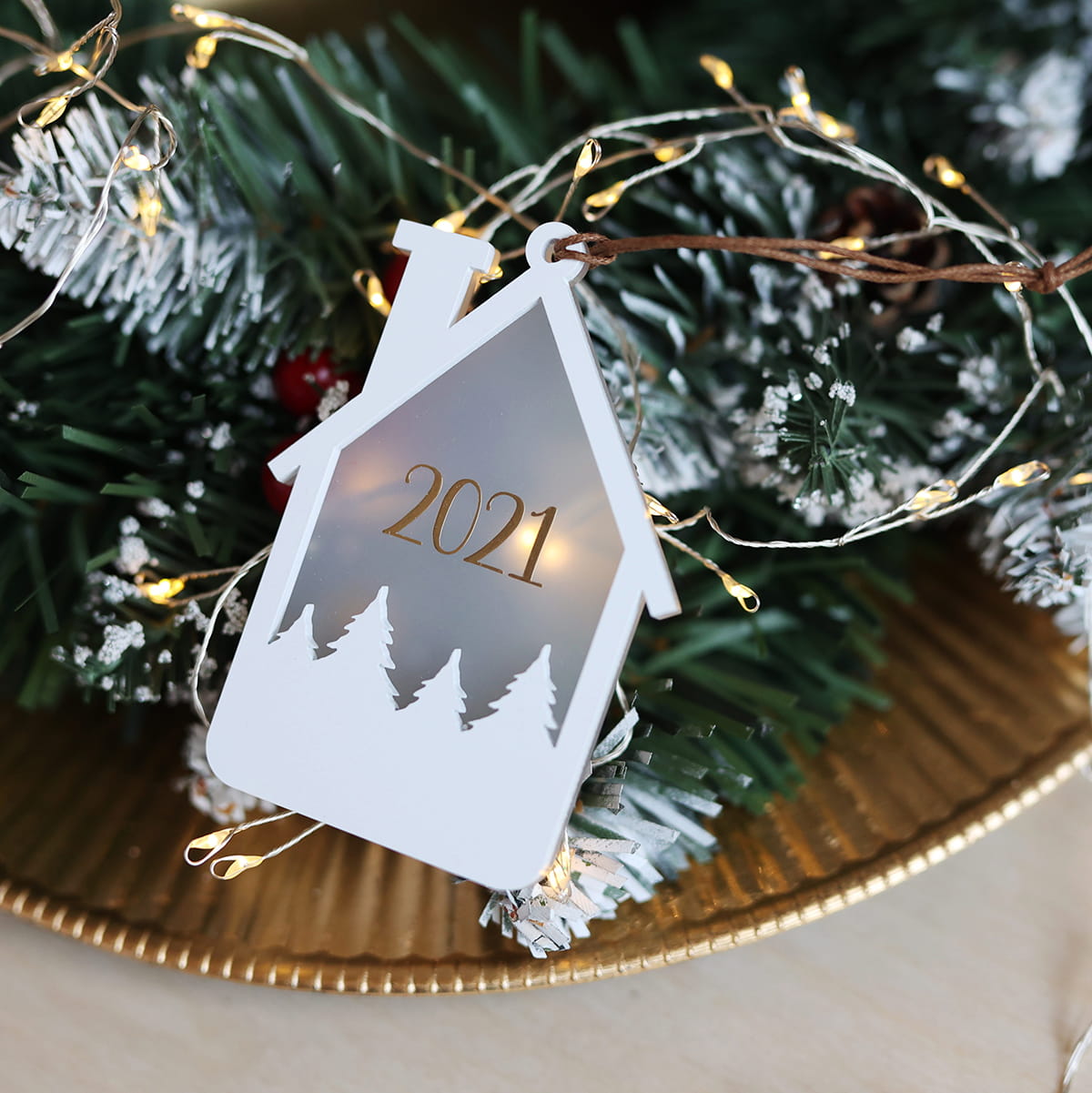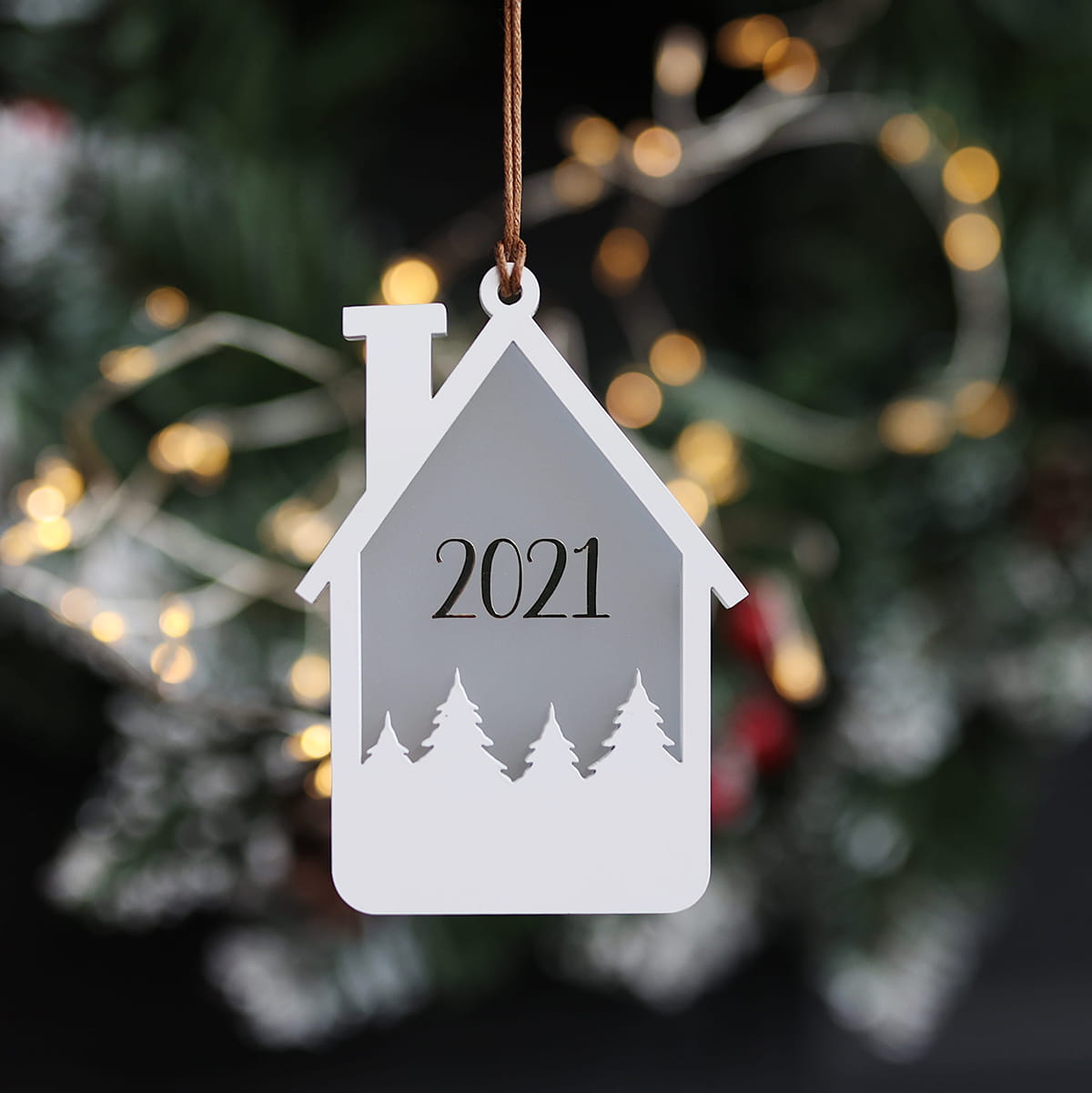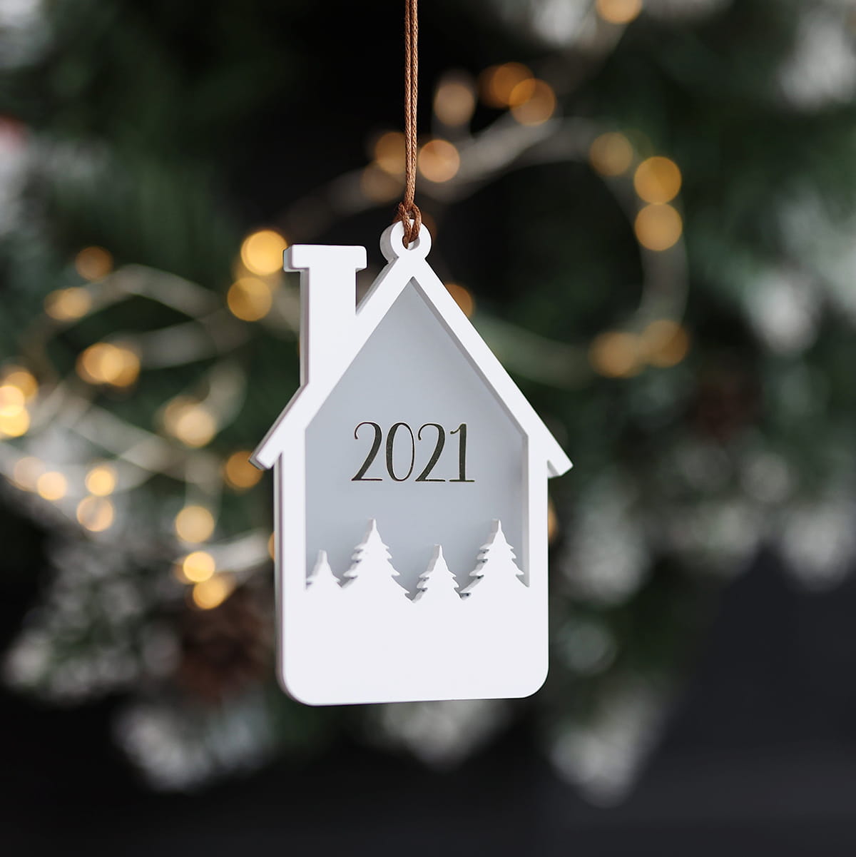 Dwuwarstwowa bombka w kształcie domku ozdobiona złotym napisem z rokiem. Idealna pamiątka pierwszych Świąt w nowym domu.