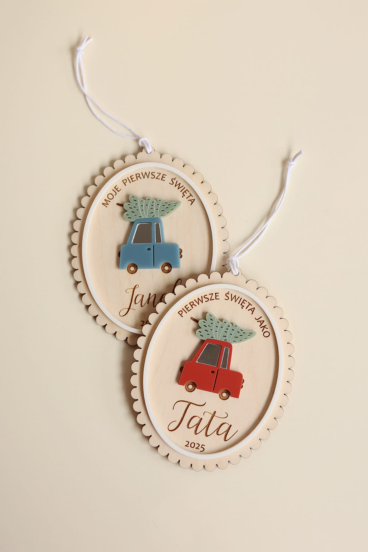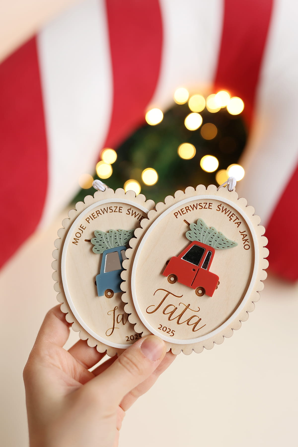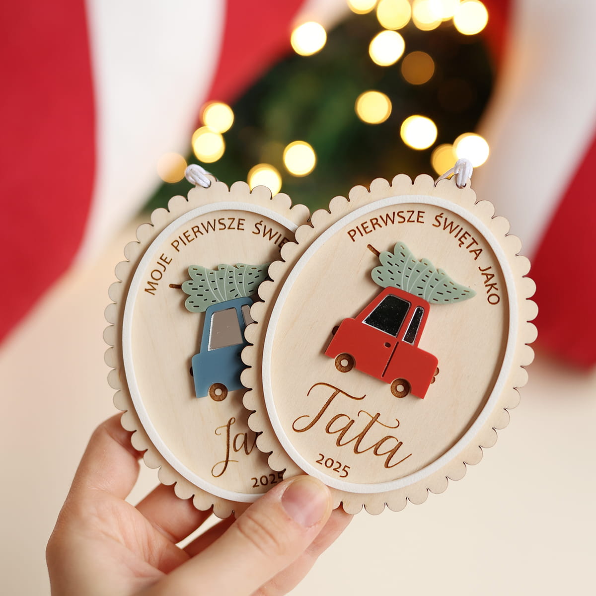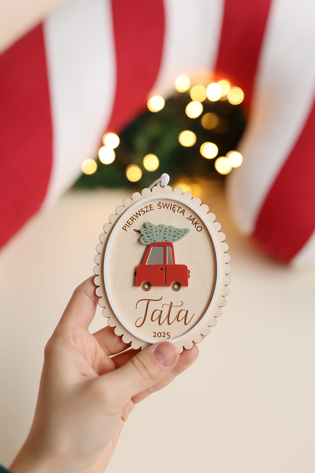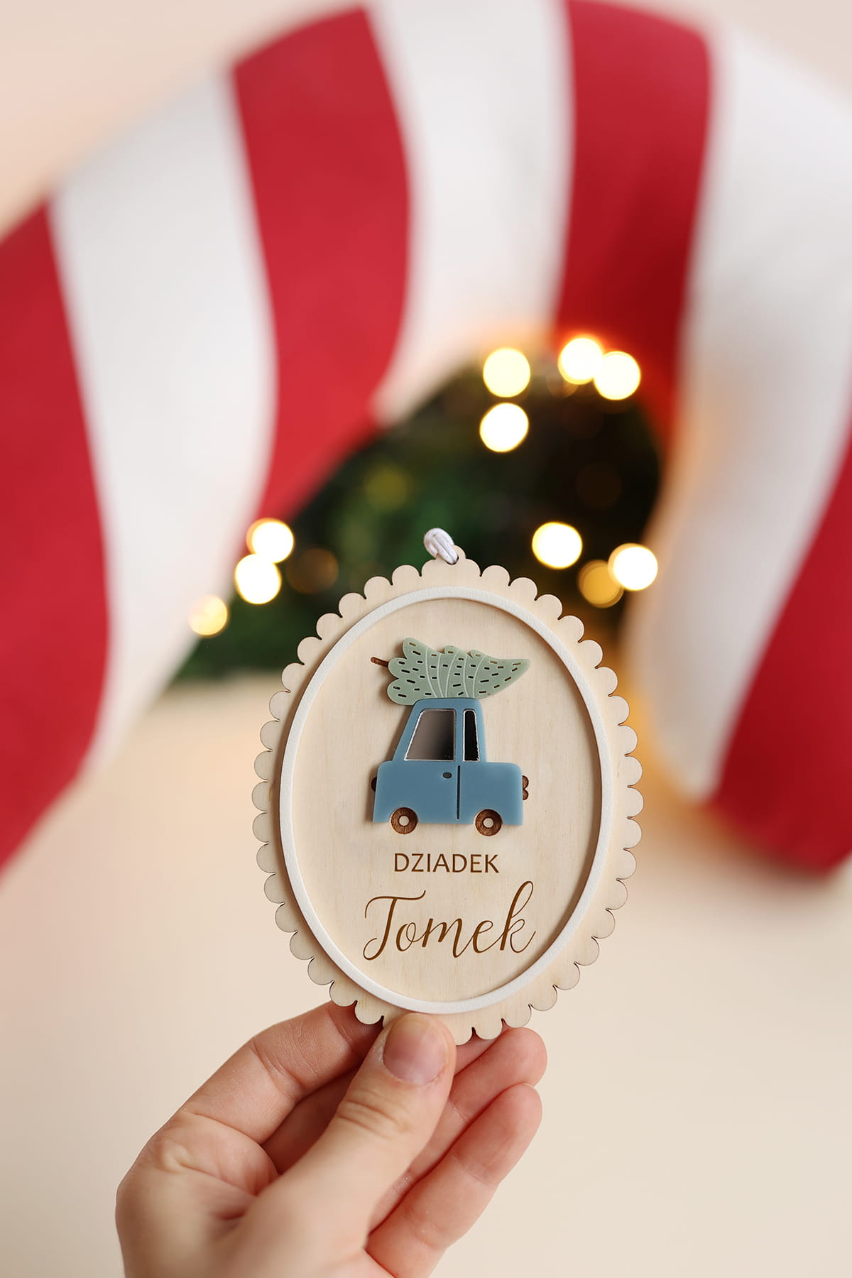 Urocza, delikatna bombka z falbanką i motywem świątecznego samochodu w wybranym kolorze.