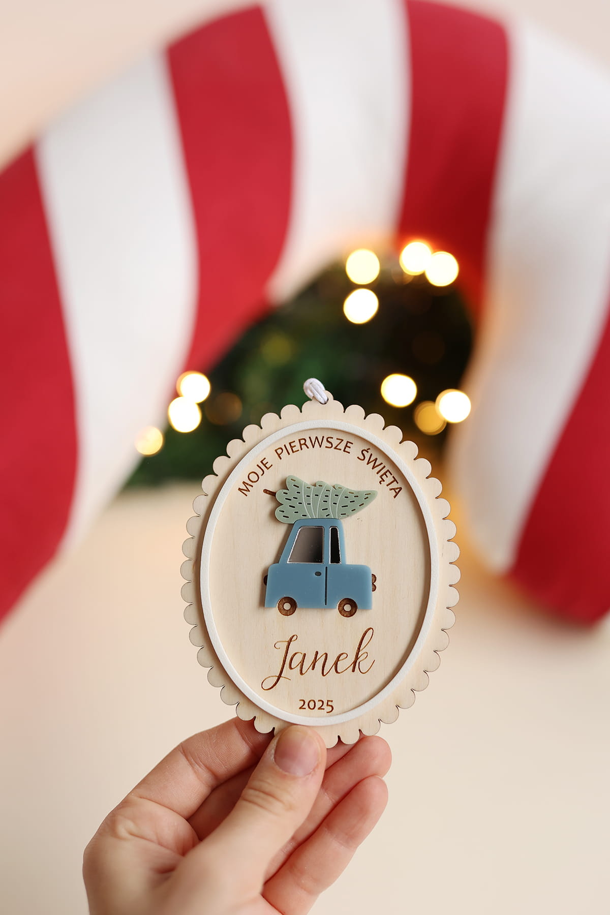 - wpisz w okienku personalizację, która ma się znaleźć na bombce, na przykład: "Moje pierwsze święta / Lilianna" lub "Pierwsze Święta Luizy, 2024" lub samo imię.