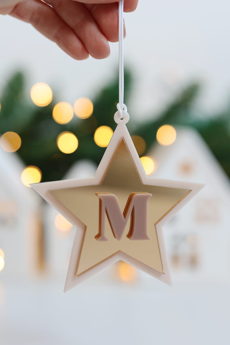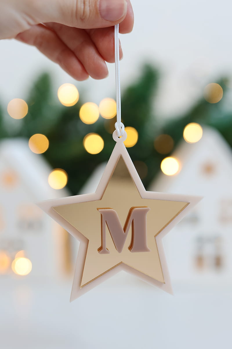 Elegancka bombka w formie gwiazdki stworzona z 3 warstw - bazy w wybranym kolorze, złotego lustra oraz literki.