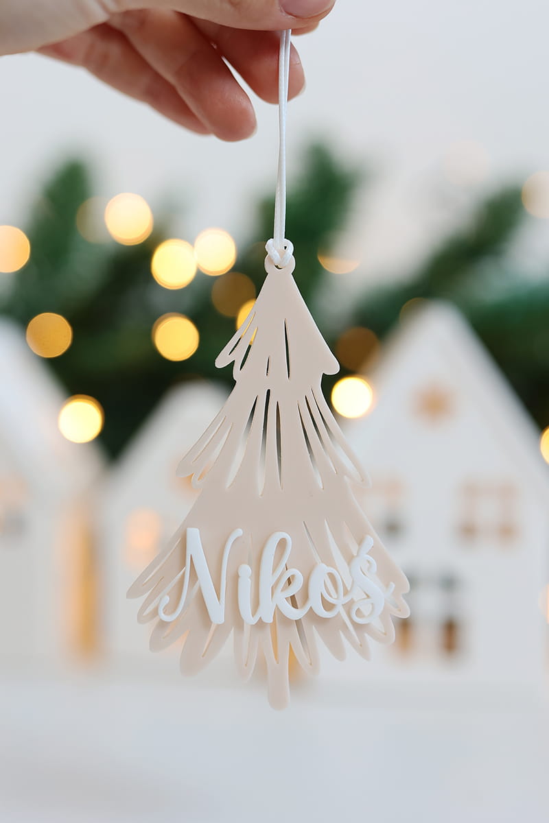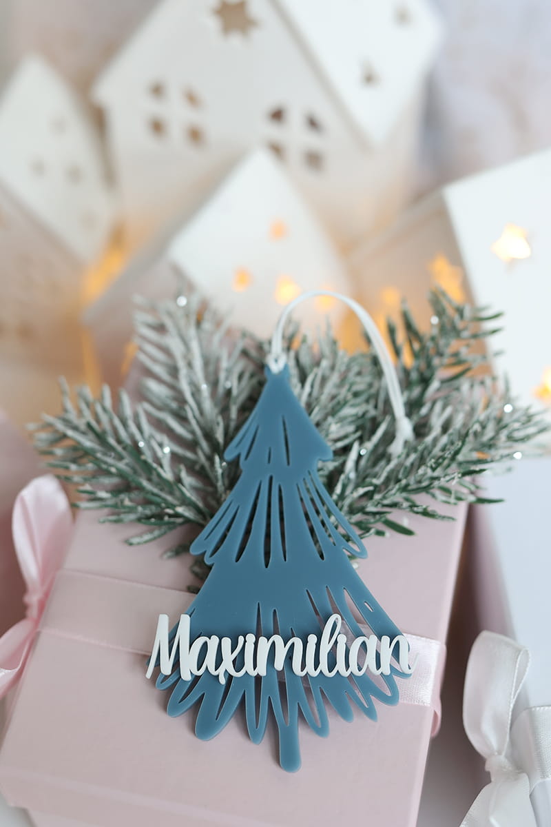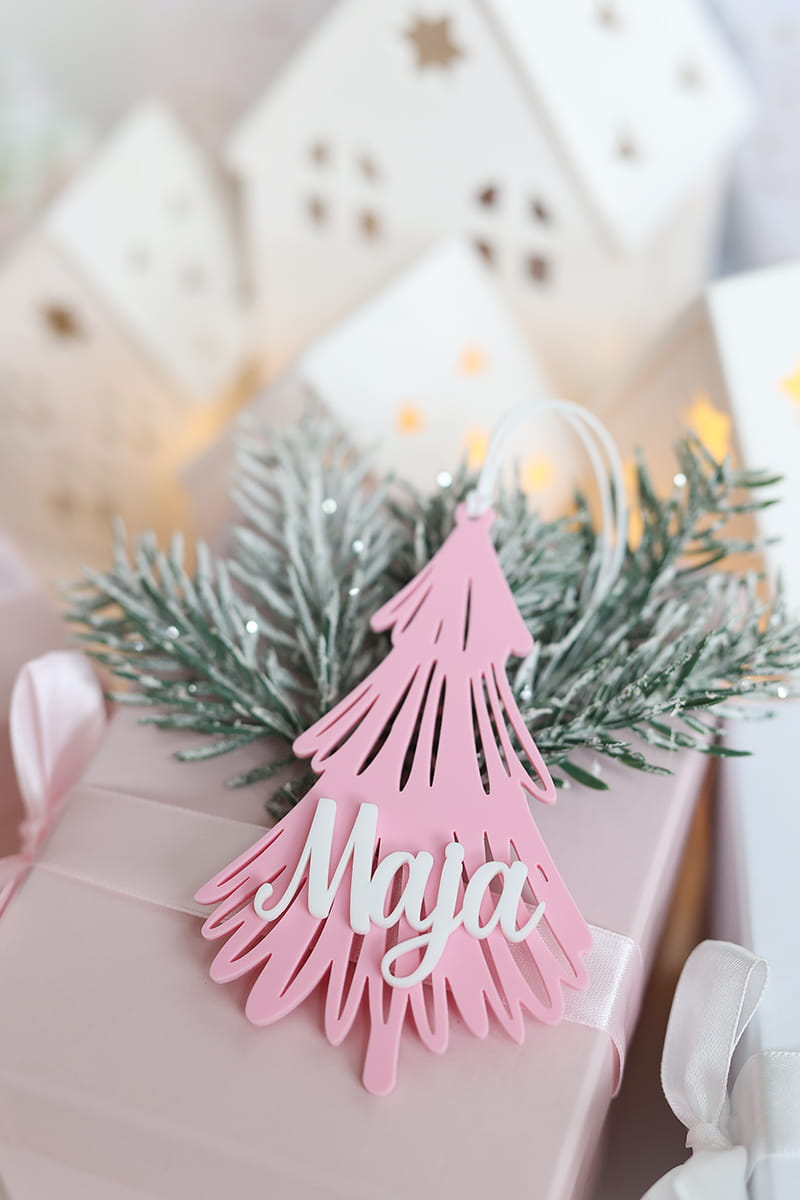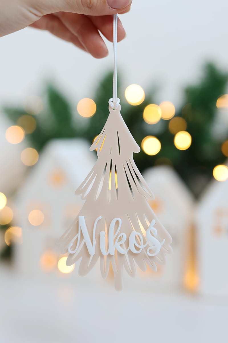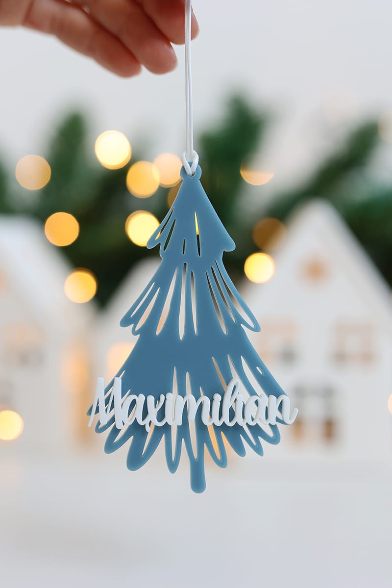 Bombka w kształcie kolorowej choinki z dowolnym, jednym imieniem w białym kolorze.