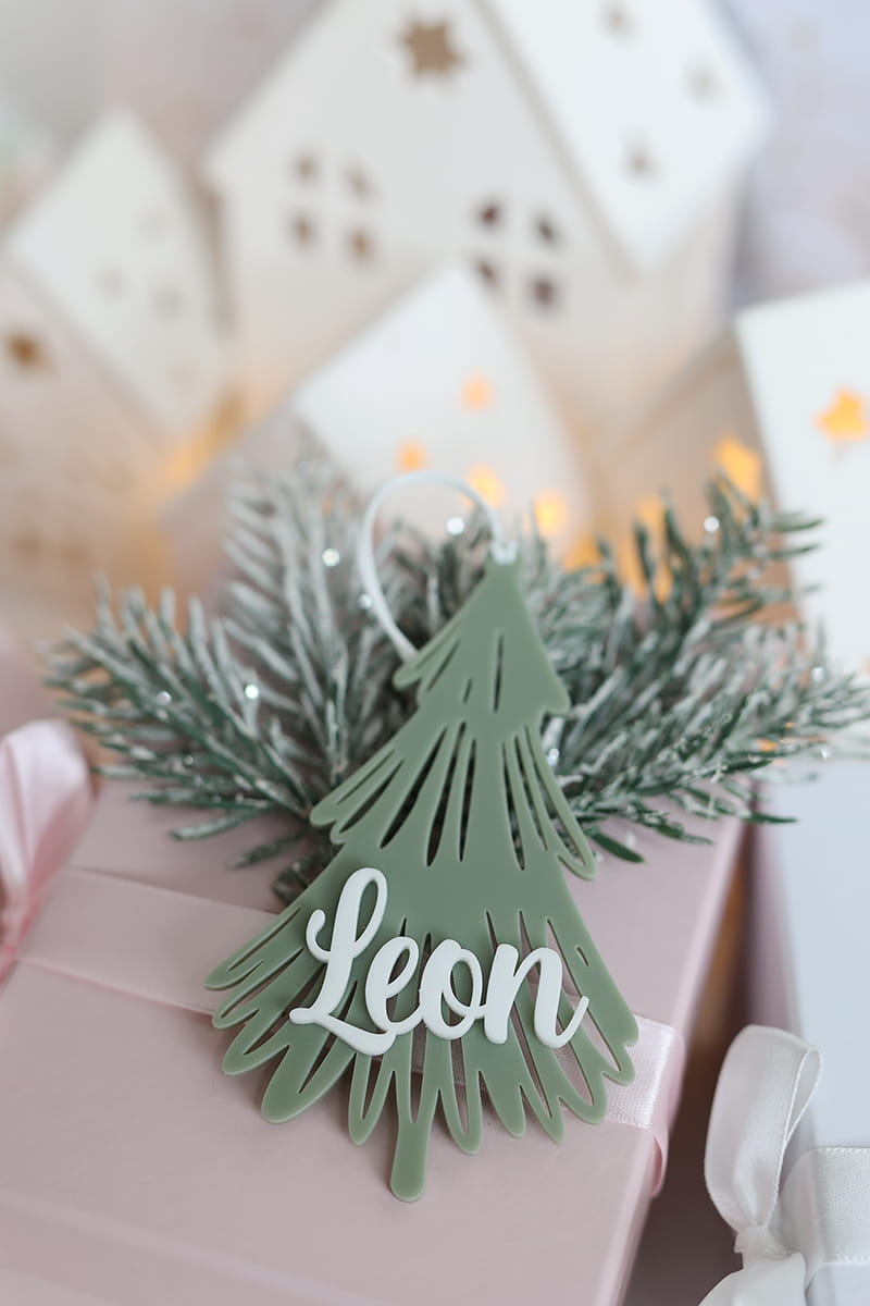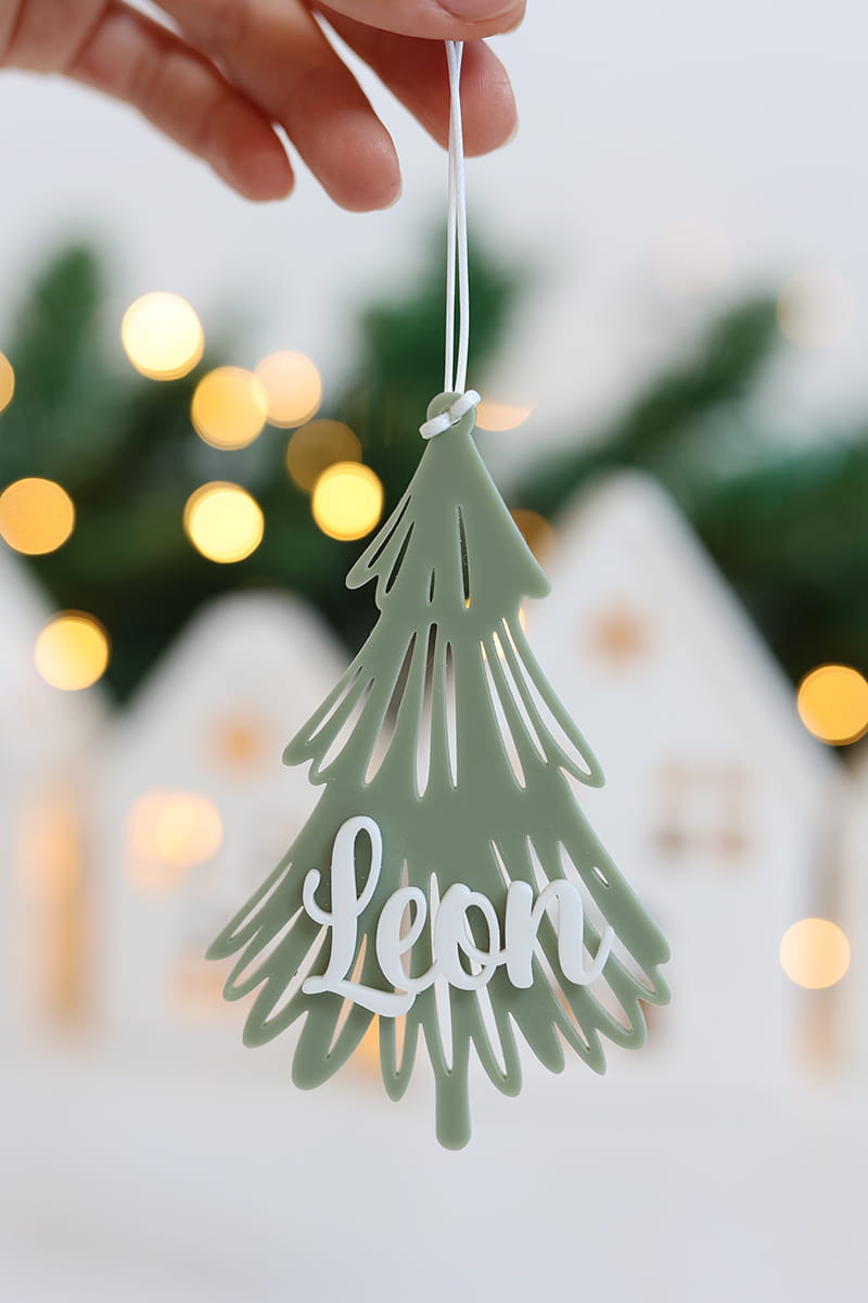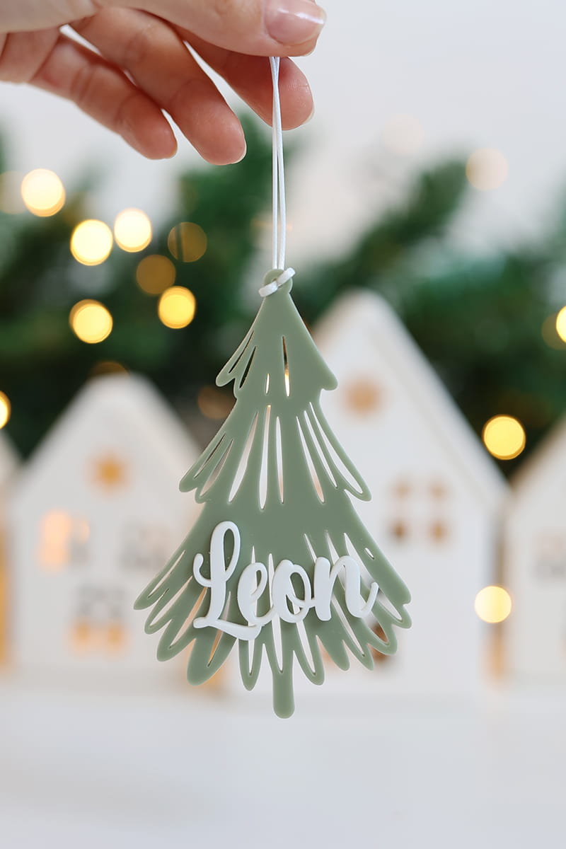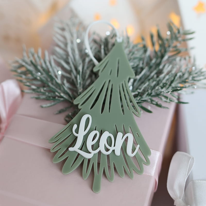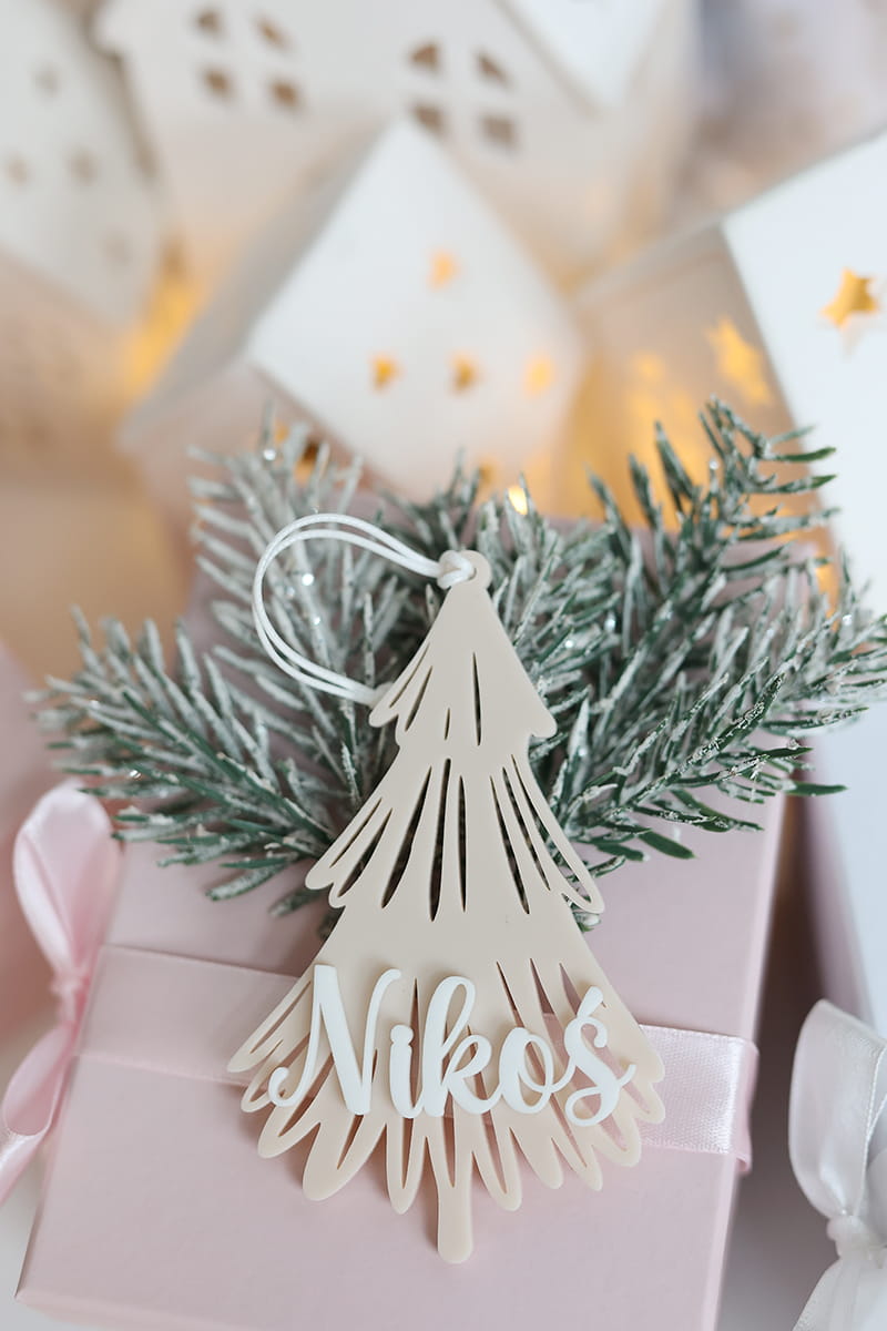 Bombka w kształcie kolorowej choinki z dowolnym, jednym imieniem w białym kolorze.