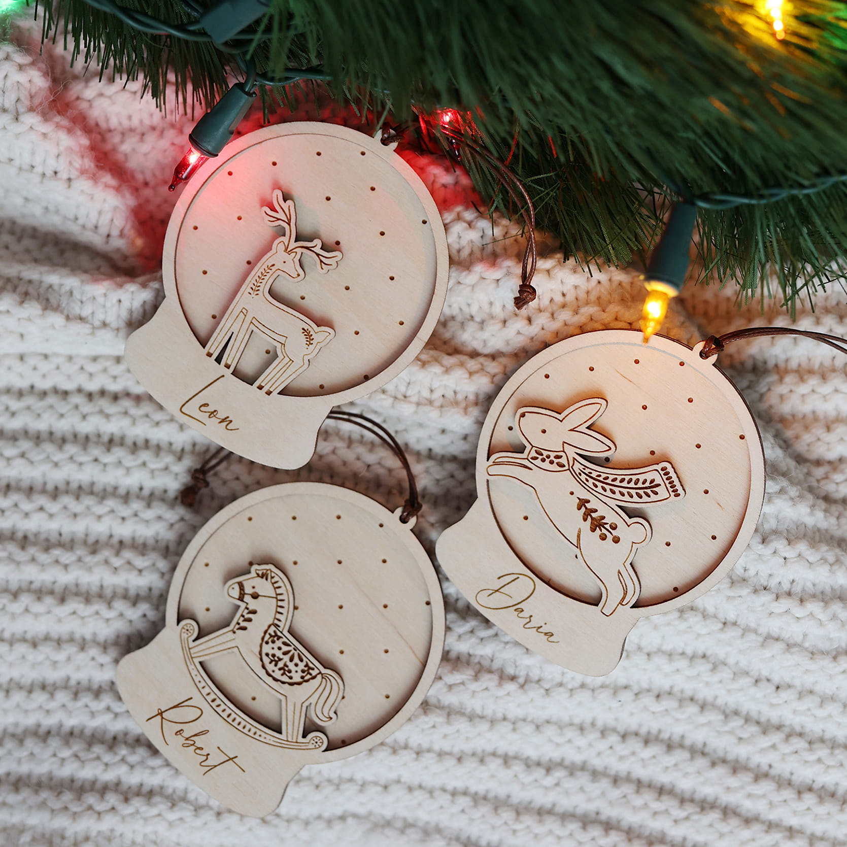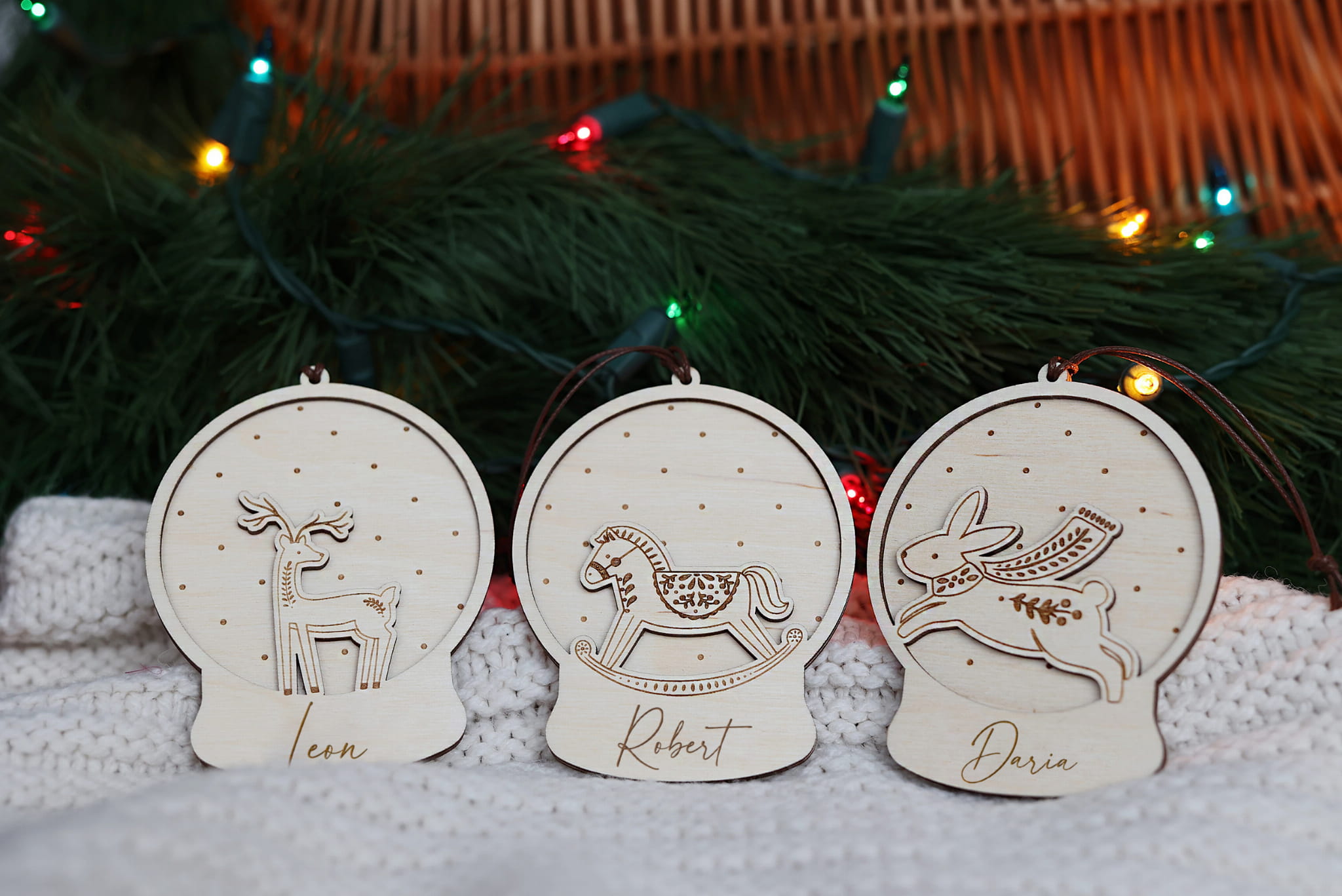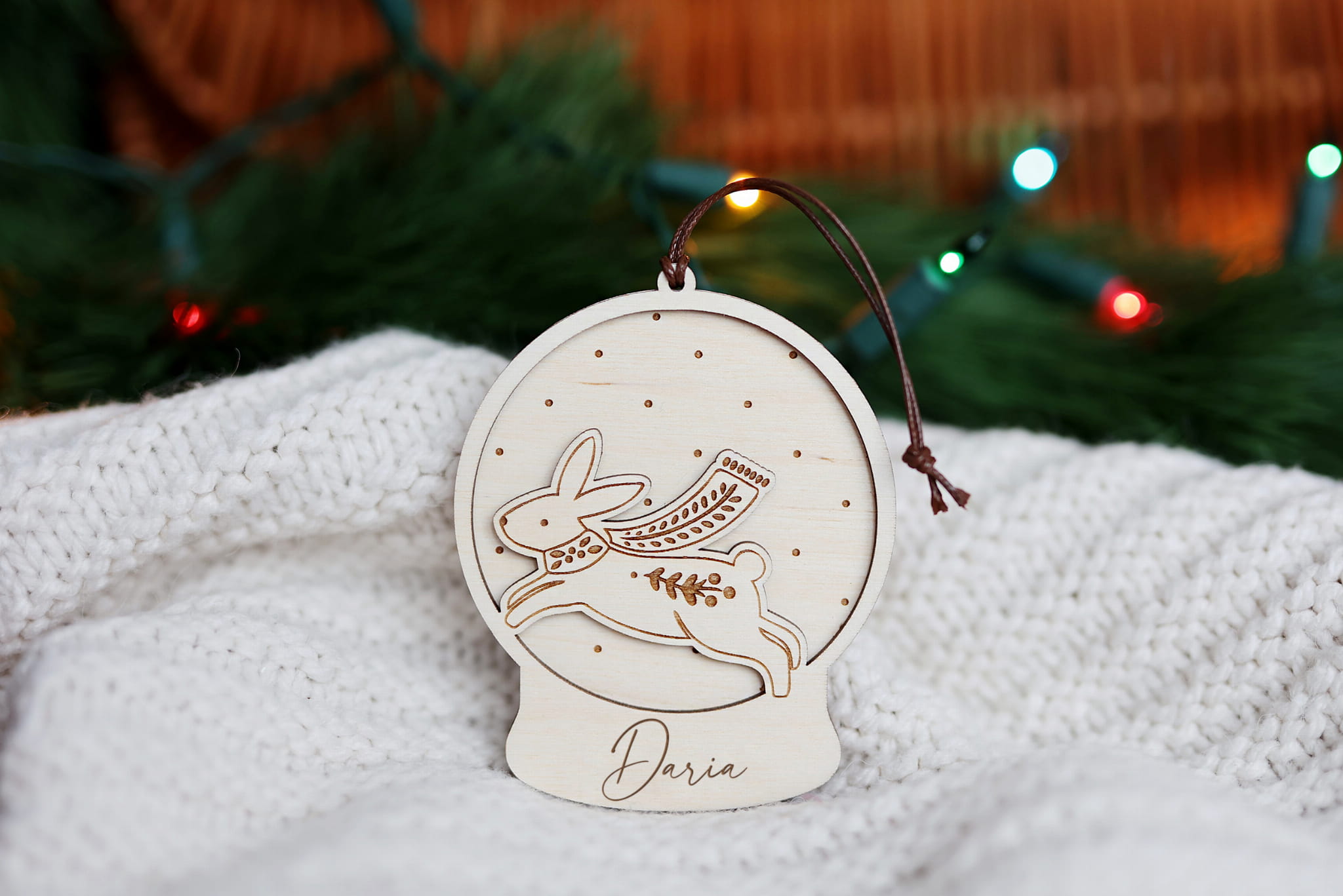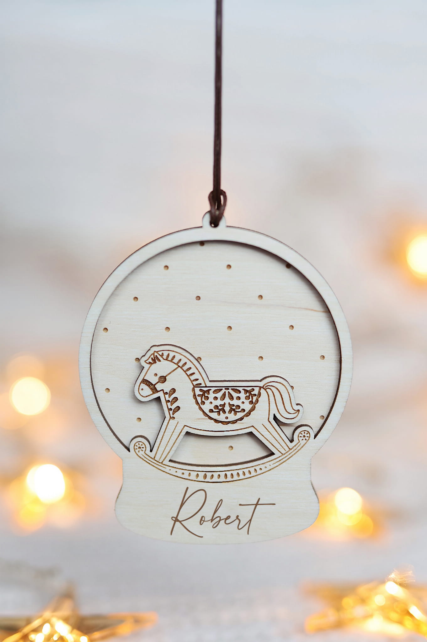 Personalizowana drewniana bombka w kształcie kuli śnieguli z wybranym motywem ozdobnym i dowolnym imieniem.
