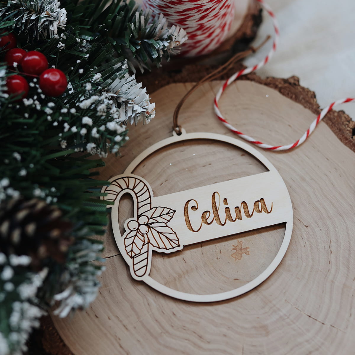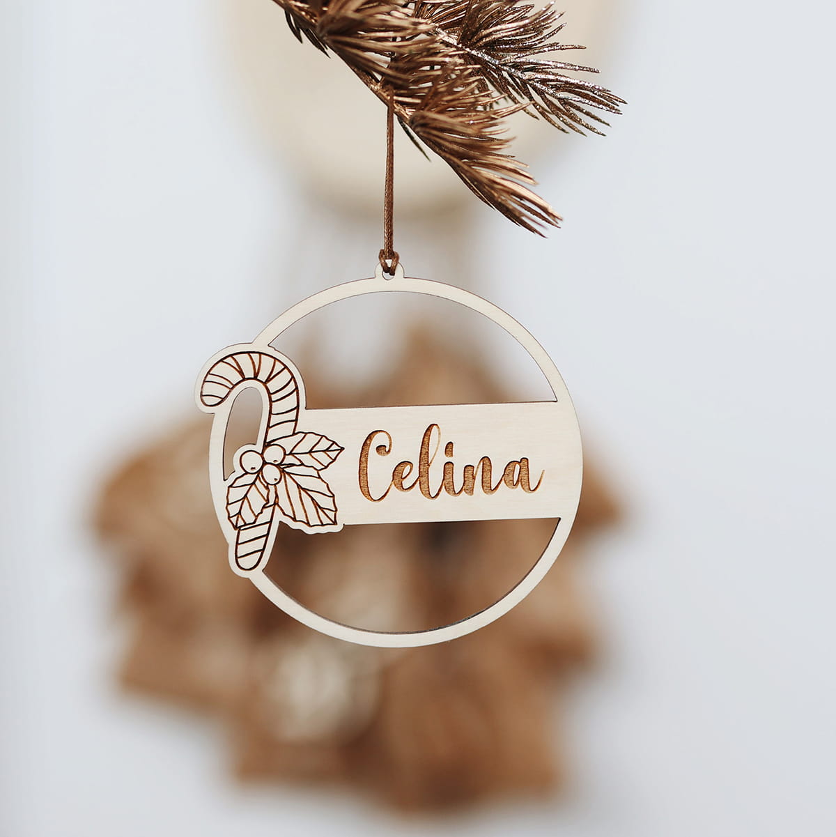 Drewniana, personalizowana bombka z motywem laski cukrowej i dowolnym imieniem.