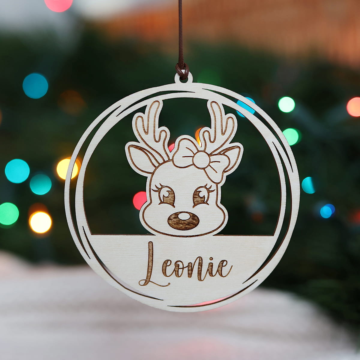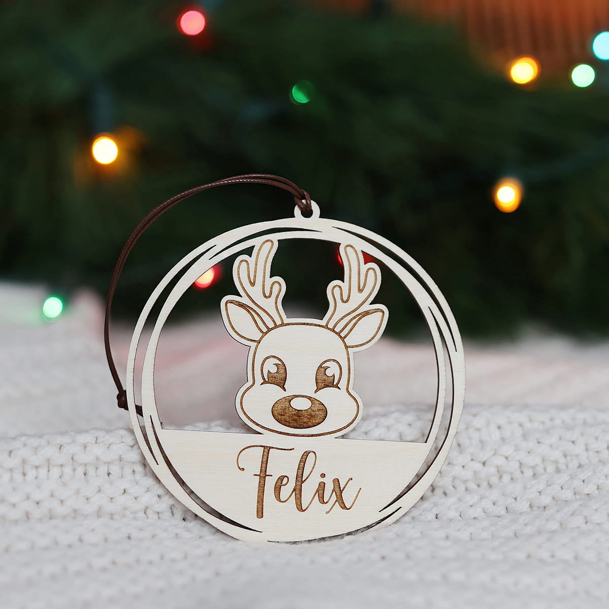 Personalizowana drewniana bombka z motywem renifera i dowolnym imieniem.