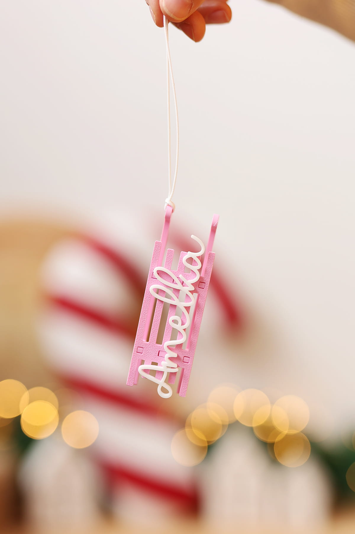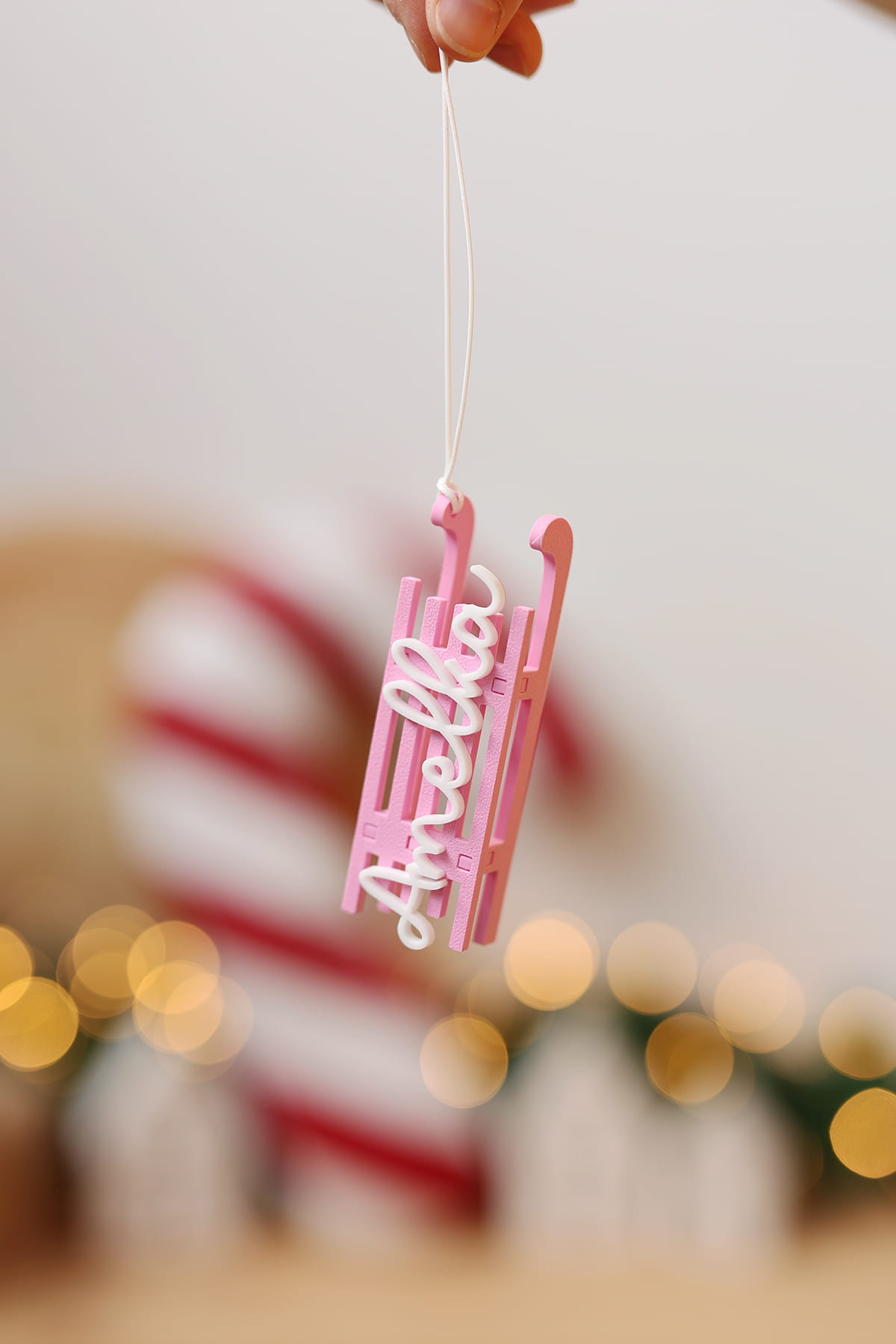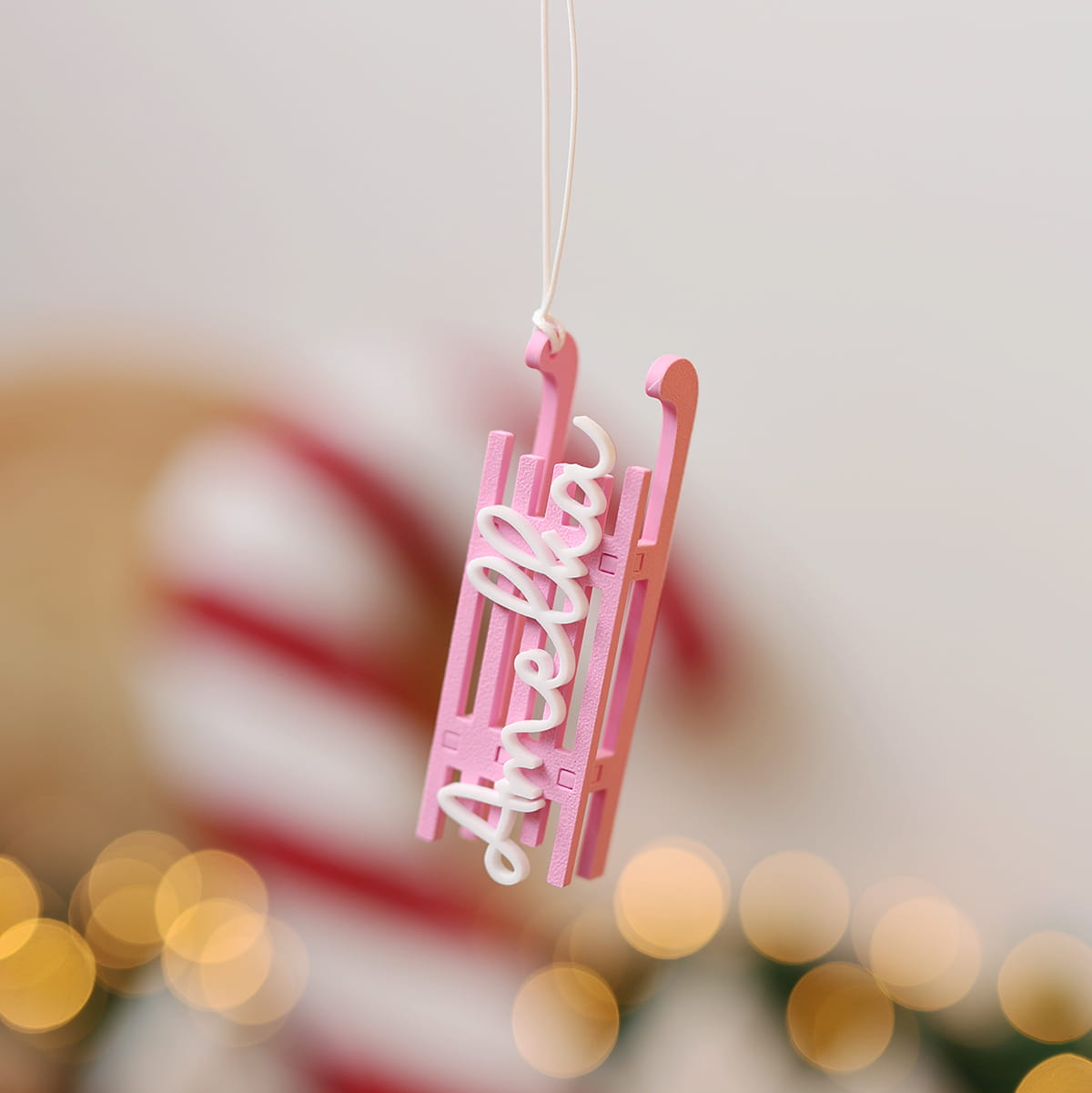 Bombka w kształcie kolorowych sanek z wybranym imieniem.