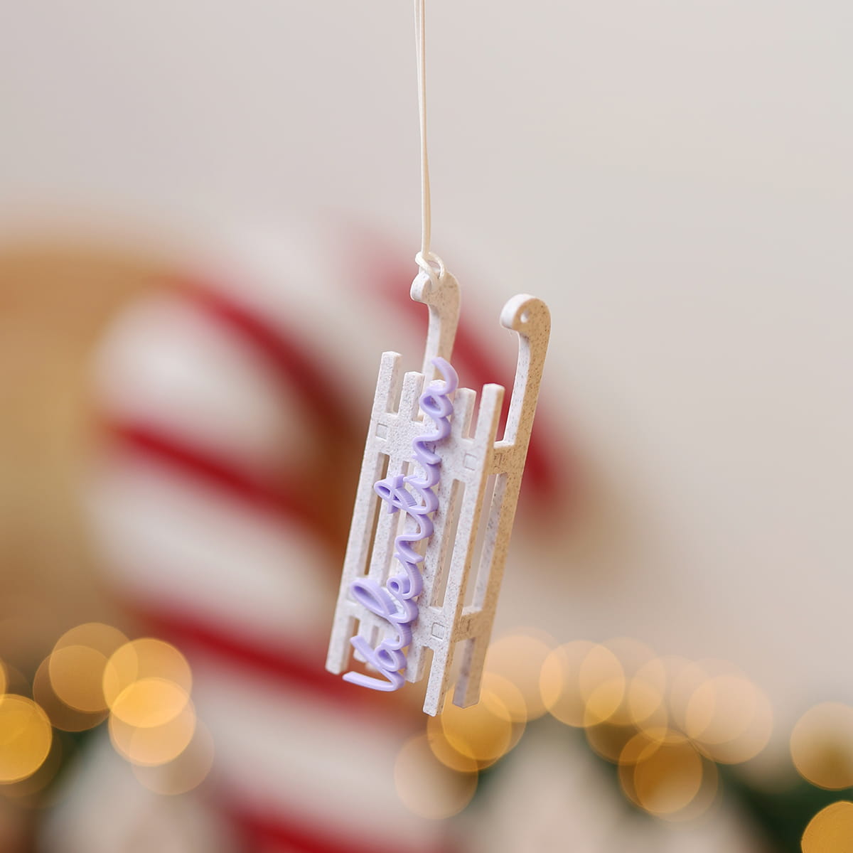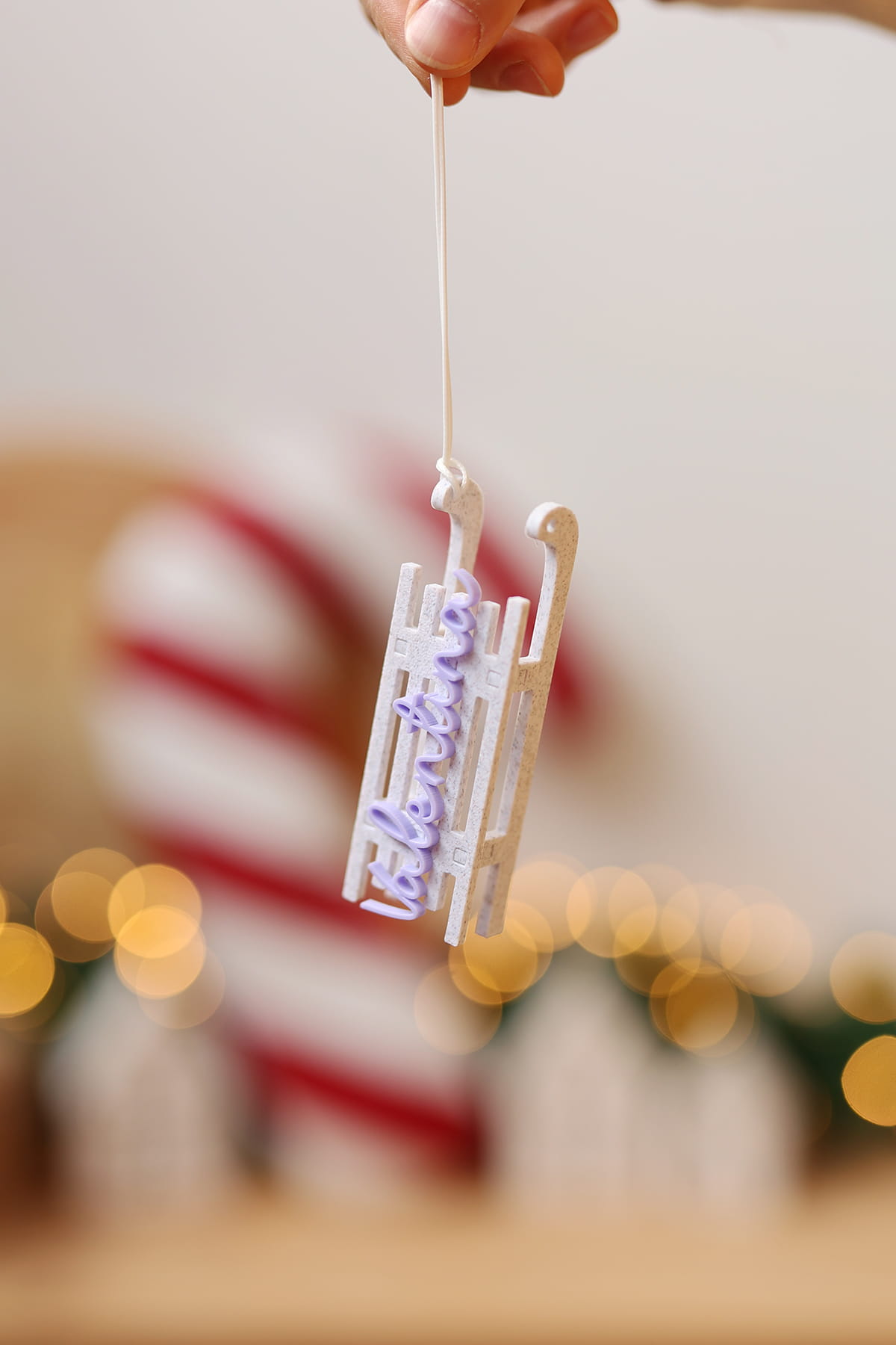 Bombka w kształcie sanek z motywem marmuru i wybranym imieniem.
