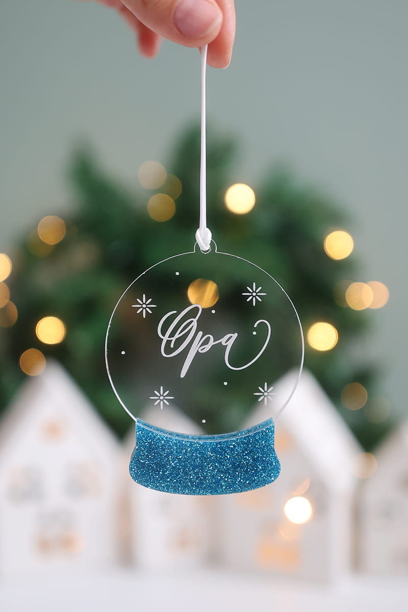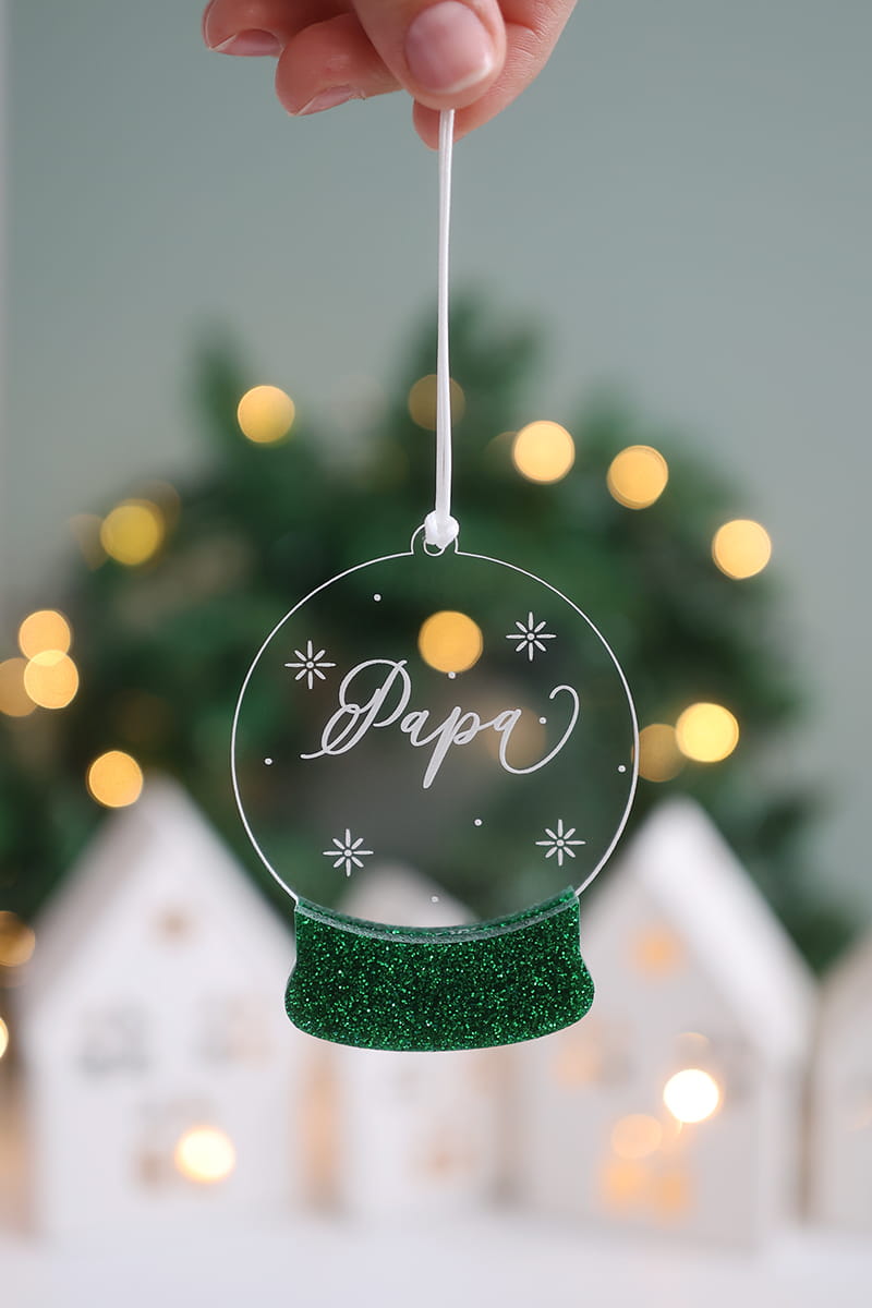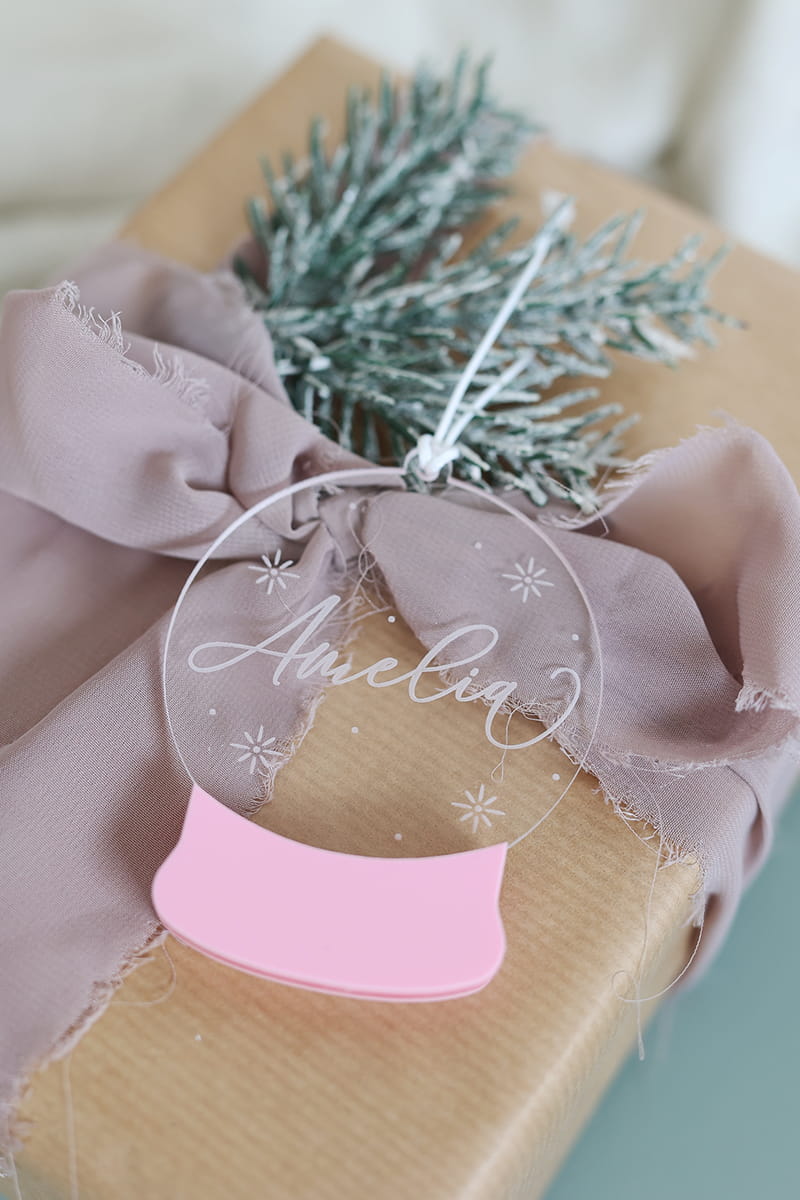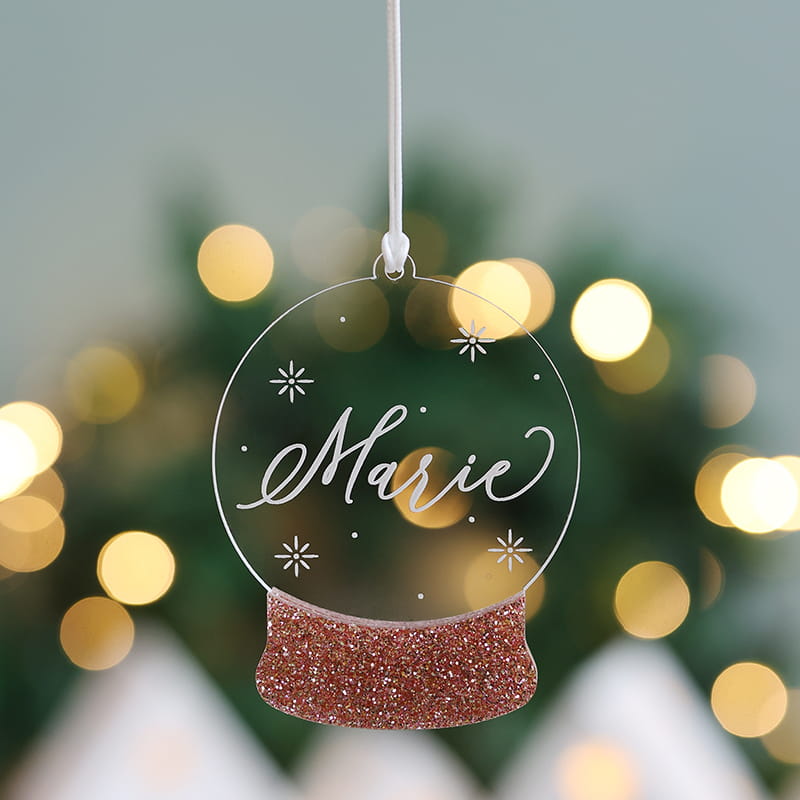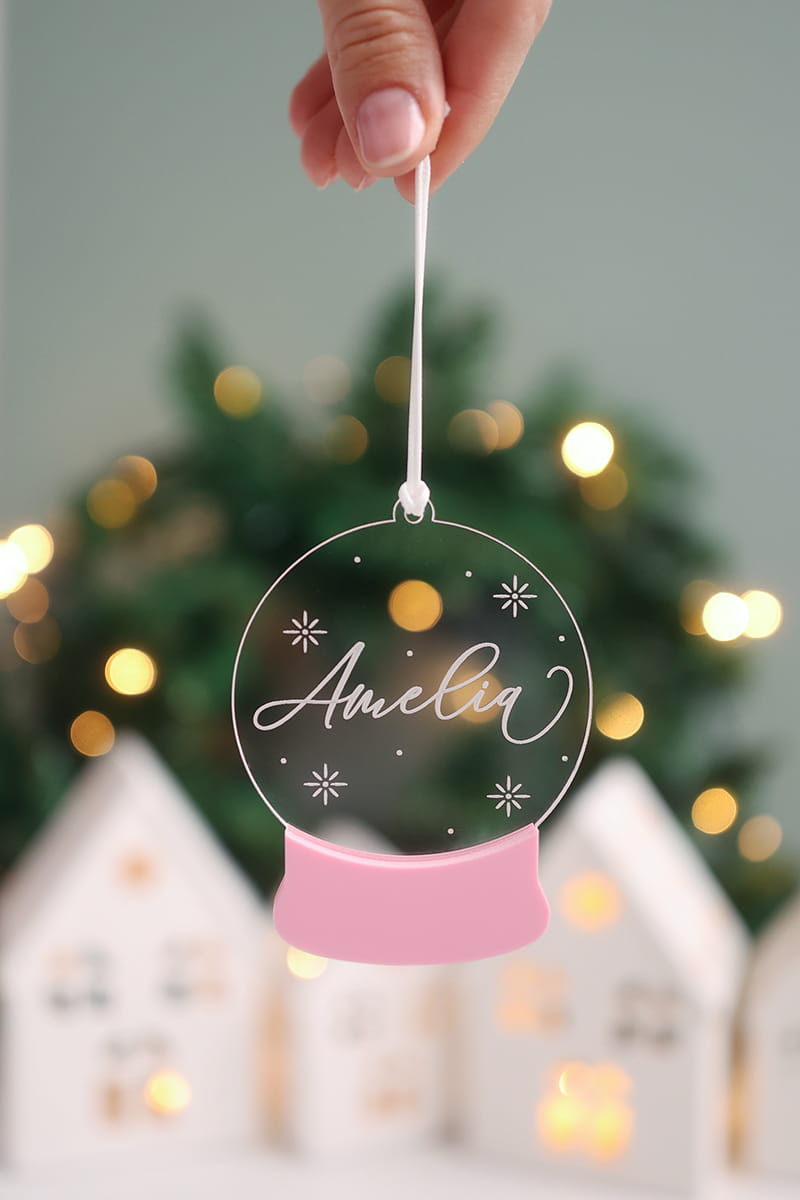 Bombka w kształcie świątecznej kuli śnieguli stworzona z transparentnej, grawerowanej pleksi i kolorowego akcentu w wybranym kolorze.