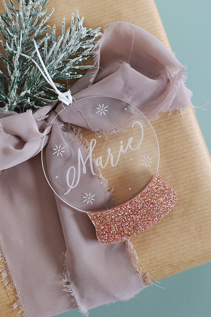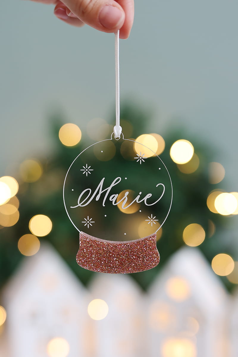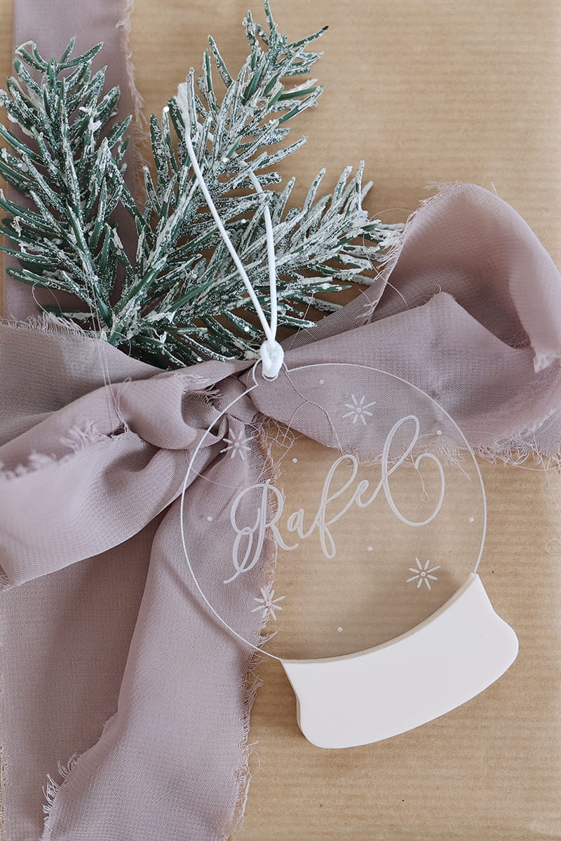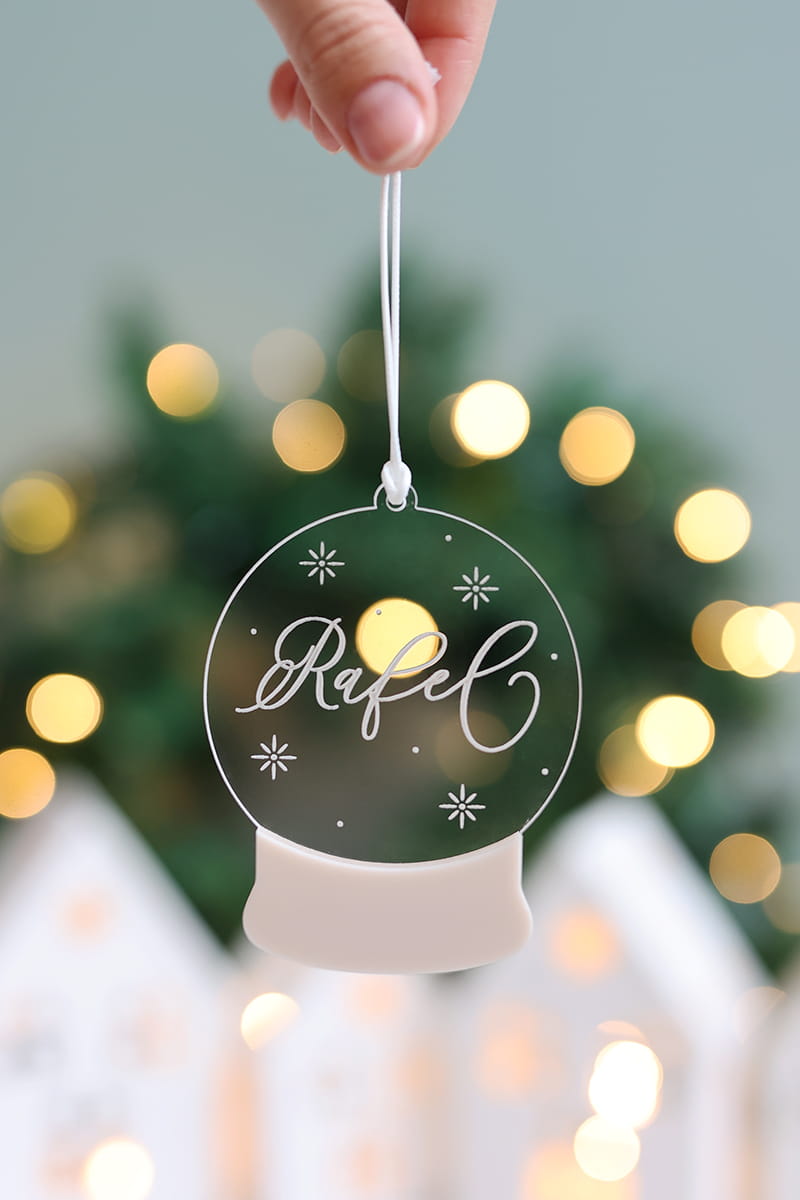 Bombka w kształcie świątecznej kuli śnieguli stworzona z transparentnej, grawerowanej pleksi i kolorowego akcentu w wybranym kolorze.