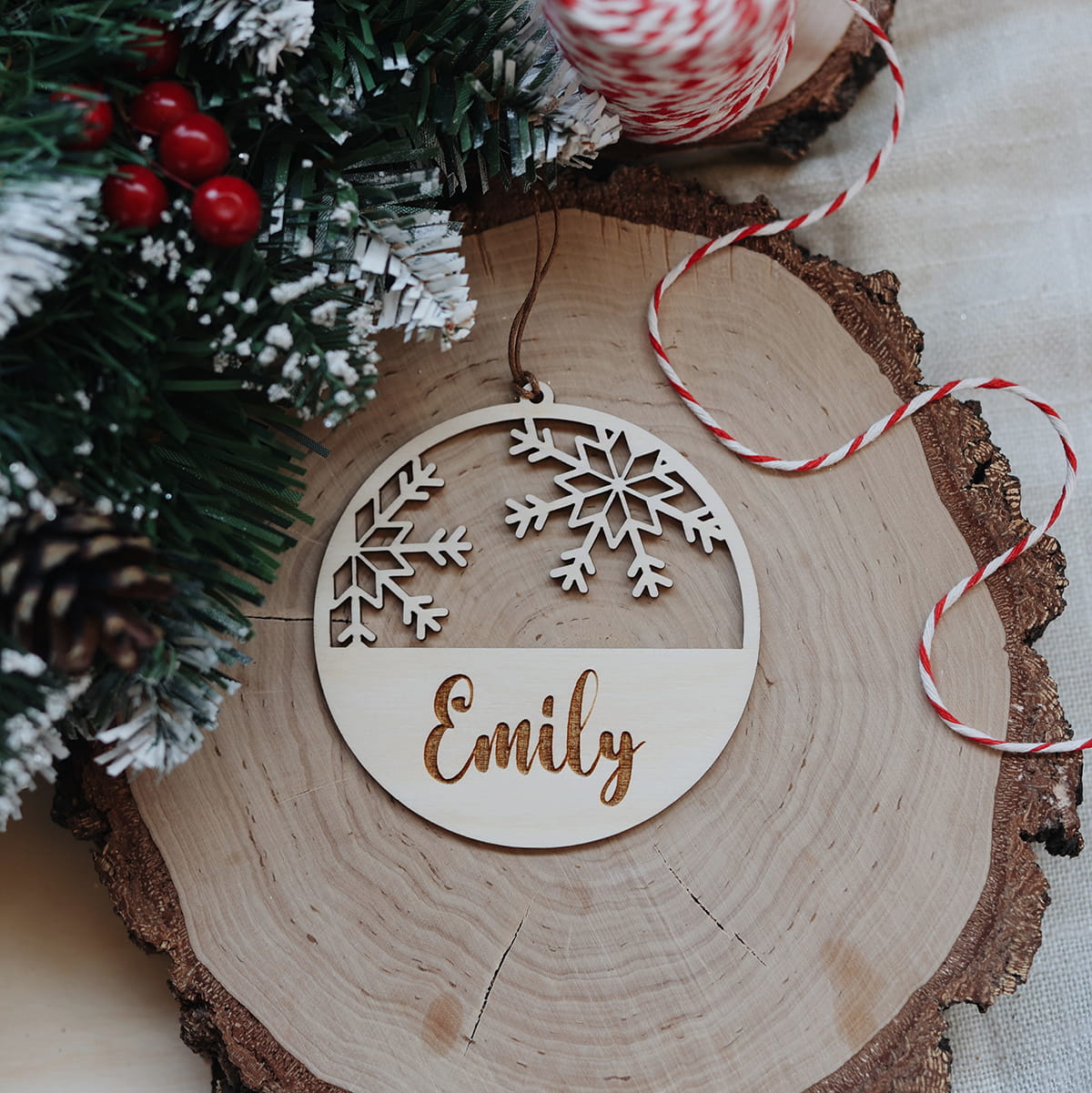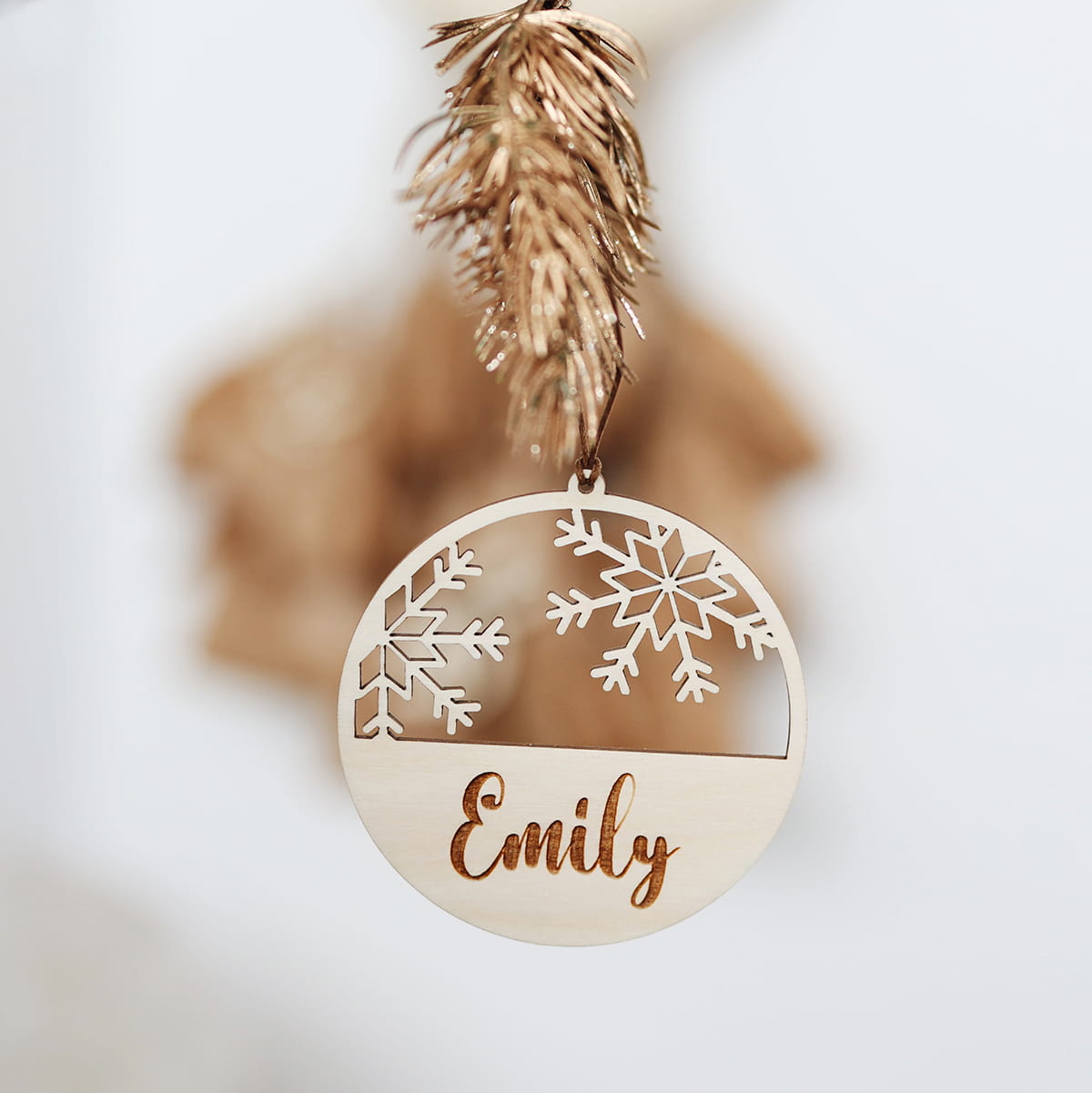 Drewniana, personalizowana bombka z ażurowymi śnieżynkami i dowolnym imieniem.