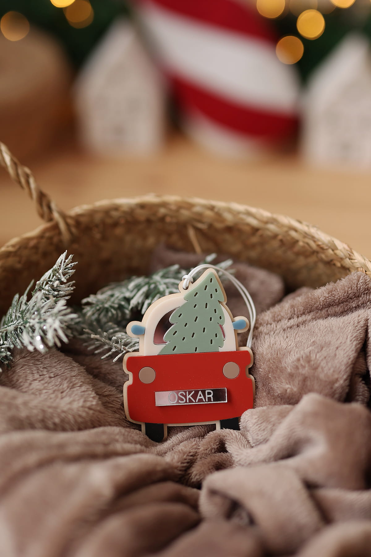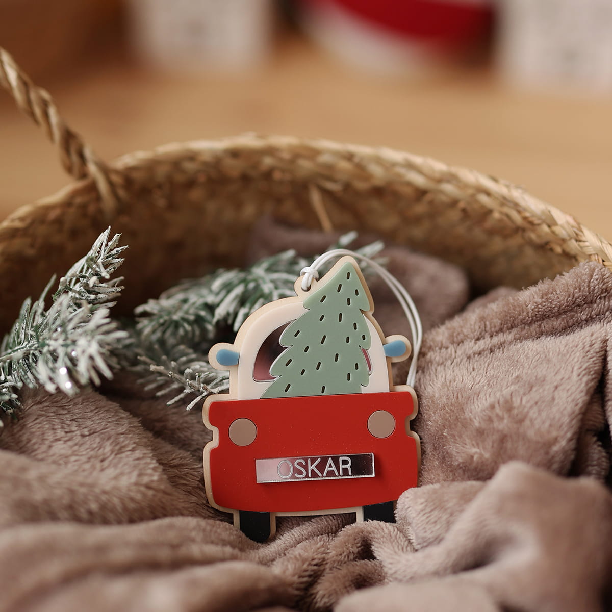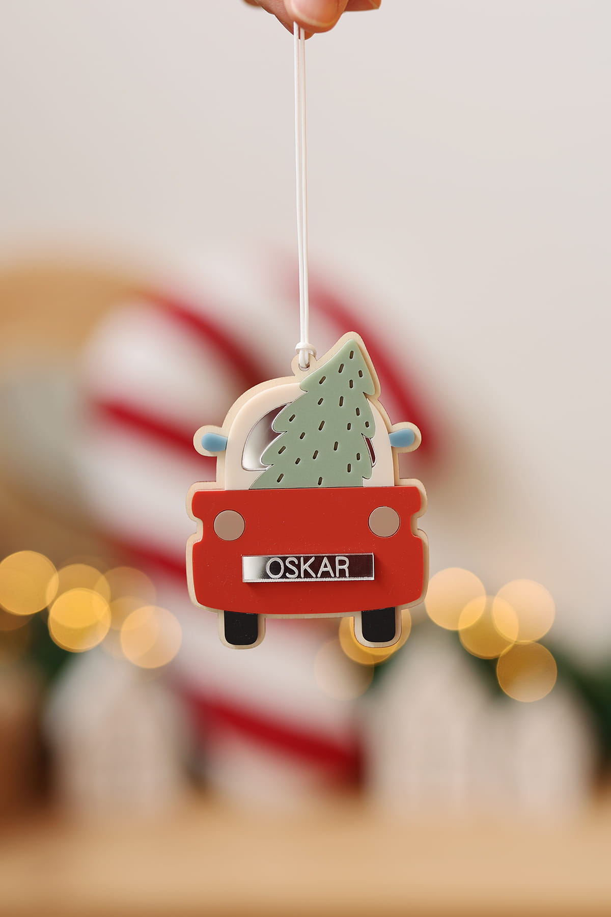 Kolorowa, personalizowana bombka w kształcie świątecznego samochodu z dowolnym imieniem grawerowanym na tablicy rejestracyjnej.