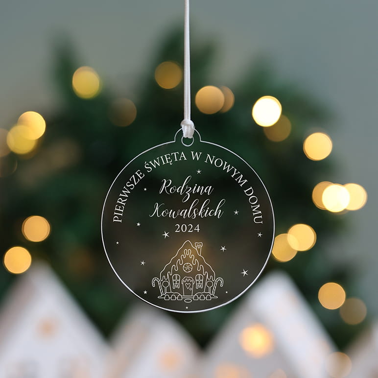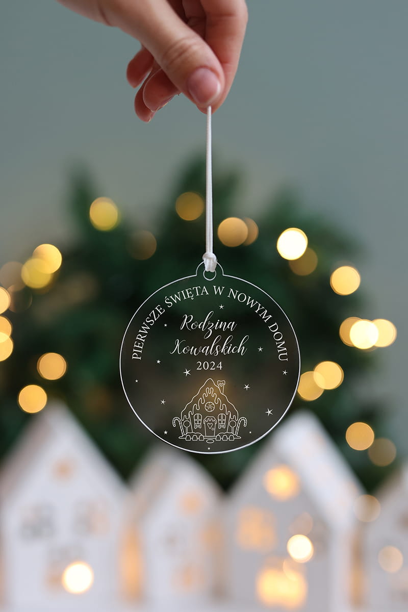 Transparentna bombka z motywem piernikowego domku oraz dowolną personalizacją.