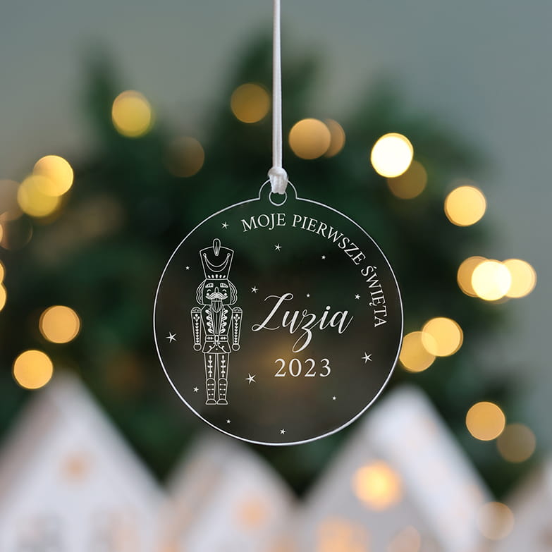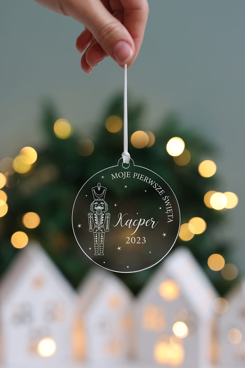 Transparentna bombka z dziadkiem do orzechów oraz dowolną personalizacją.