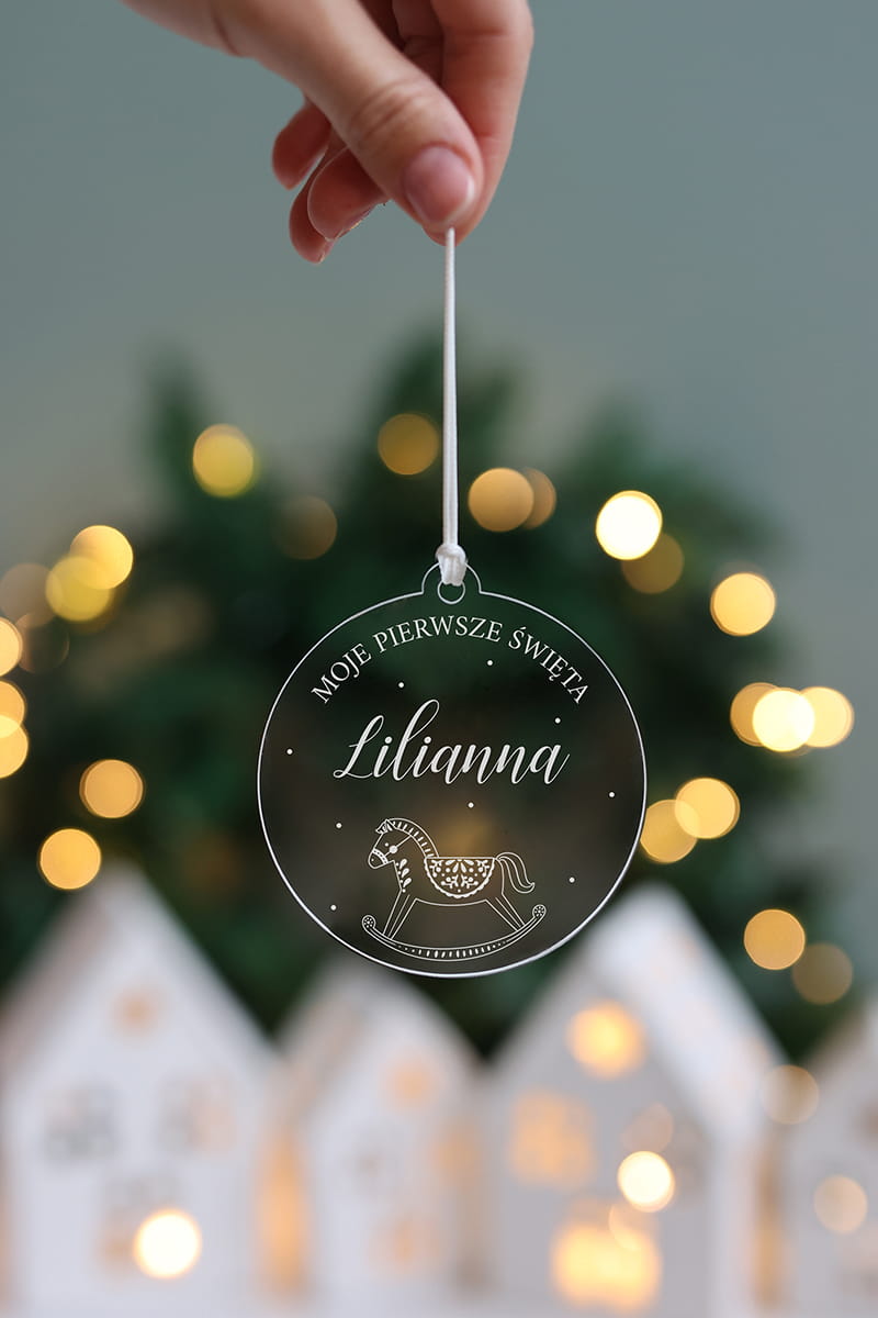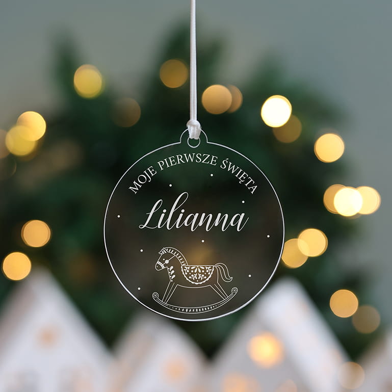 Transparentna bombka z konikiem na biegunach oraz dowolną personalizacją.