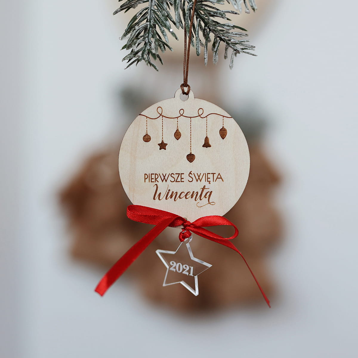 Drewniana, personalizowana bombka z dowolnym napisem oraz zawieszką w kształcie gwiazdki. Całość połączona jest czerwoną wstążką.
