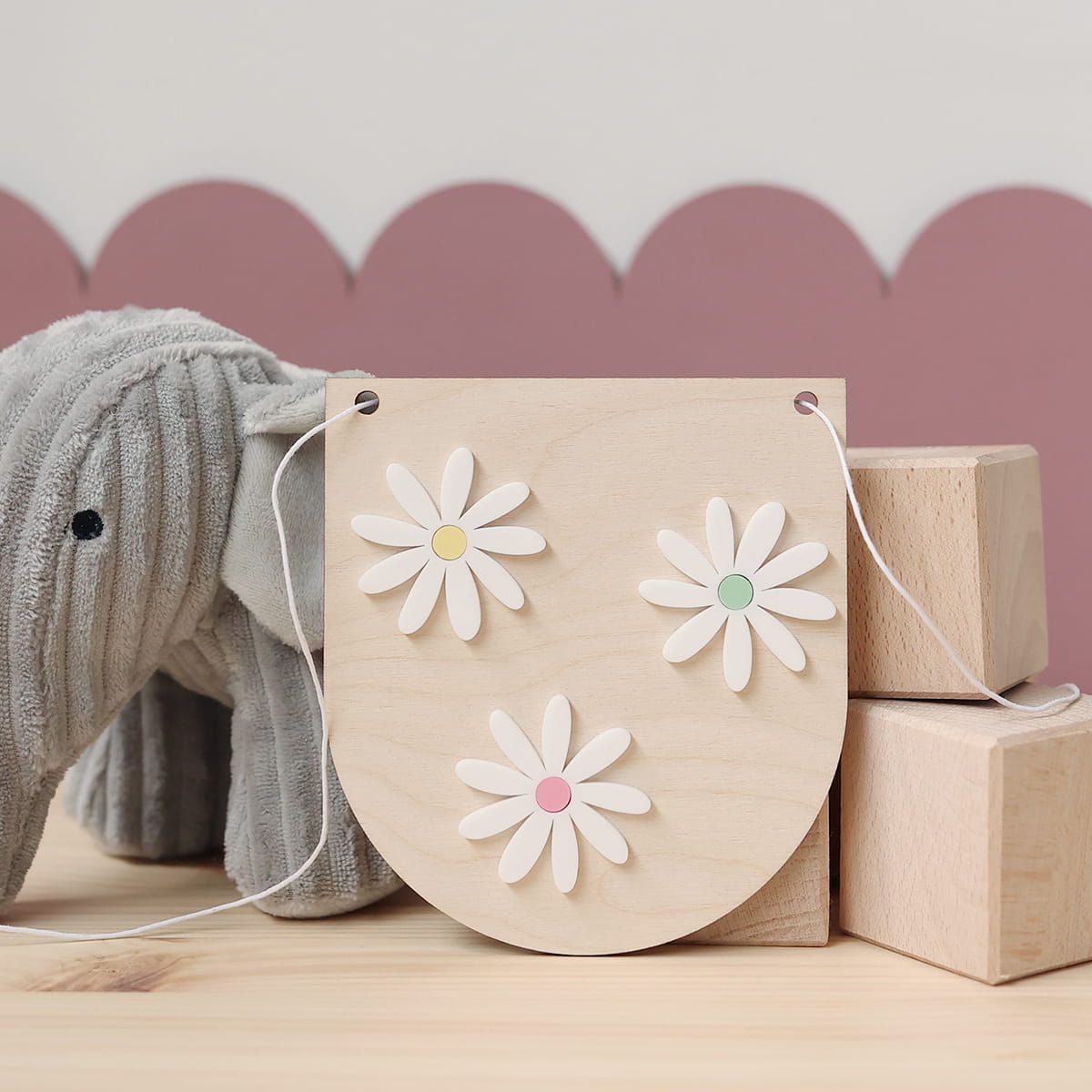 Dekor do girlandy w kształcie płatków z motywem stokrotek.