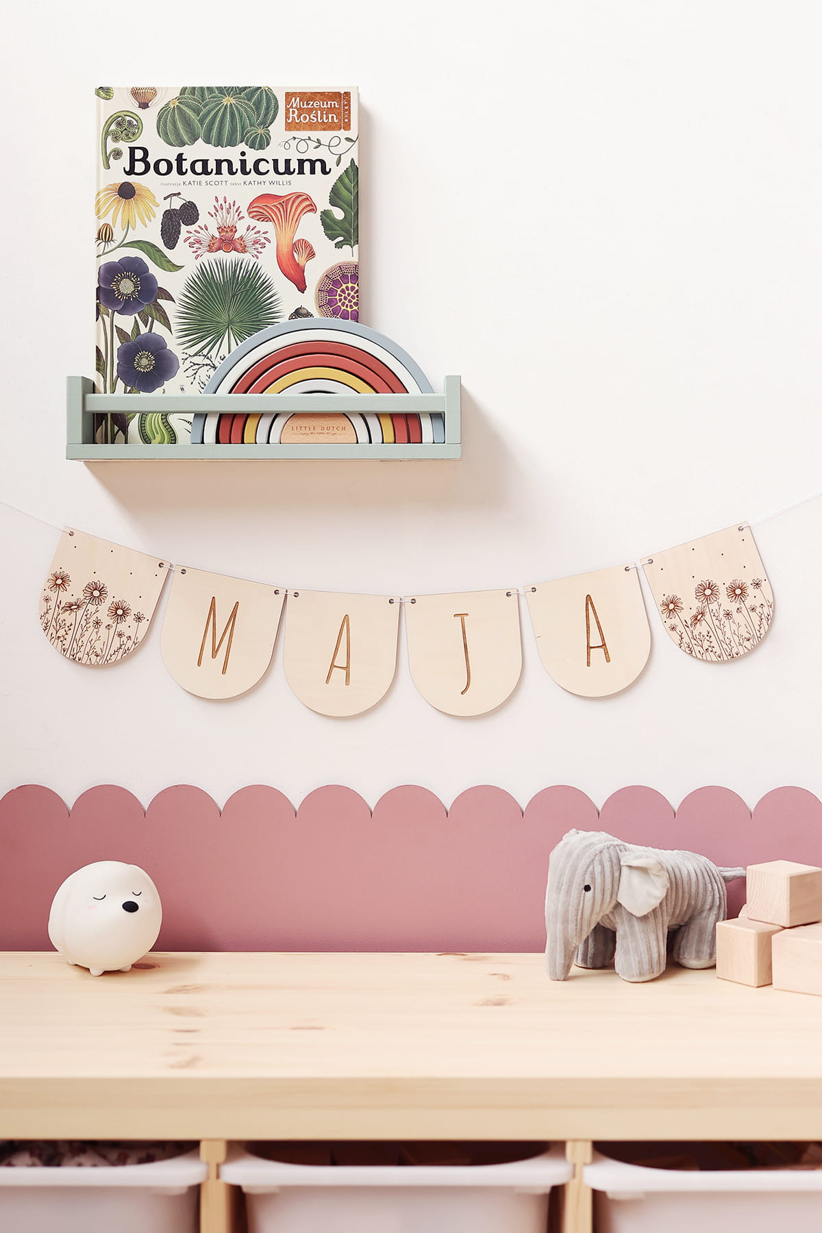 Drewniana, ozdobna girlanda w kształcie płatków.