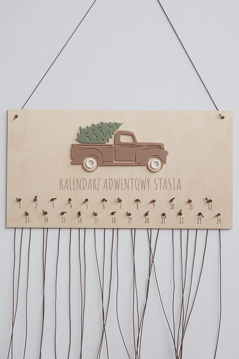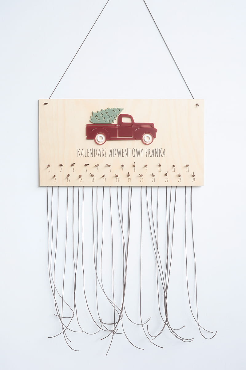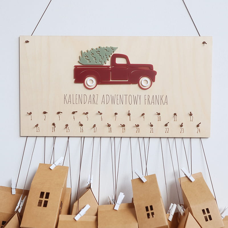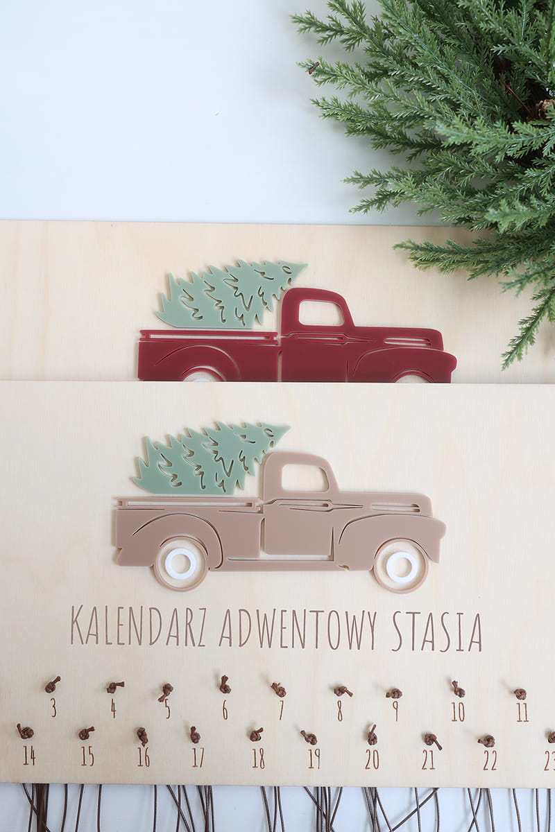 Personalizowany kalendarz adwentowy z motywem świątecznego samochodu w jednym z wybranych kolorów.
