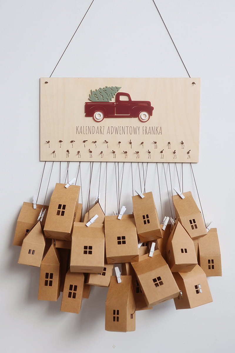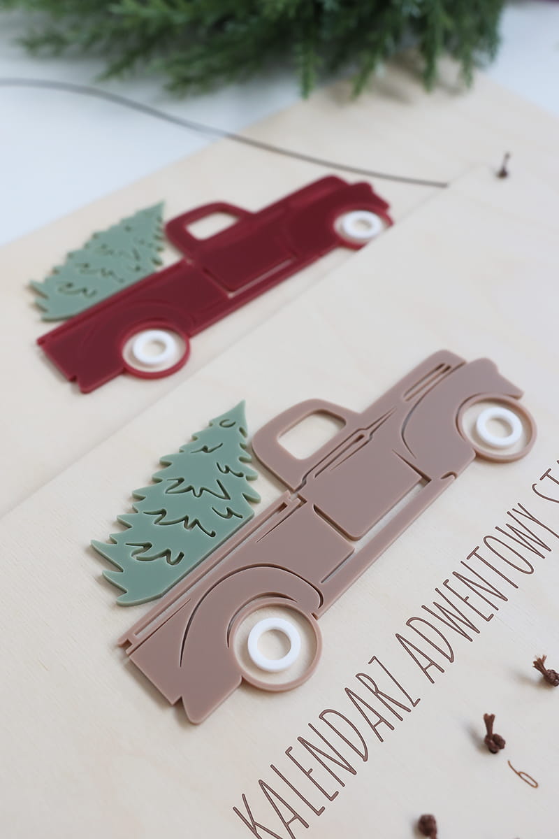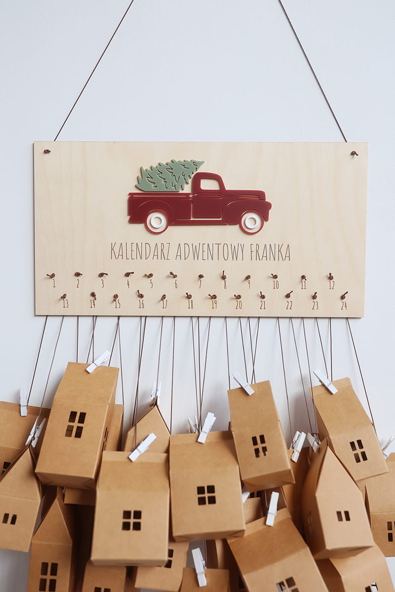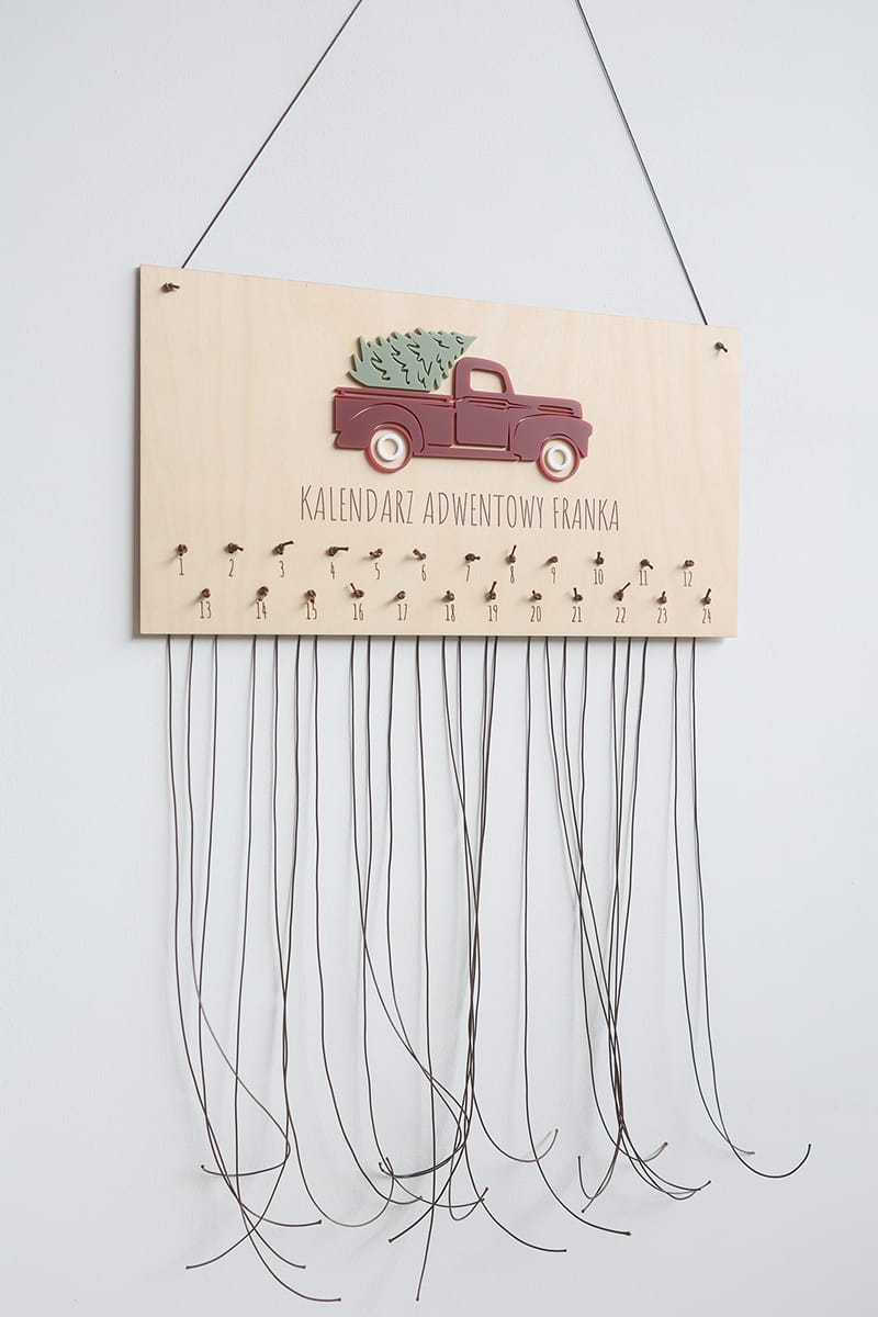 Personalizowany kalendarz adwentowy z motywem świątecznego samochodu w jednym z wybranych kolorów.