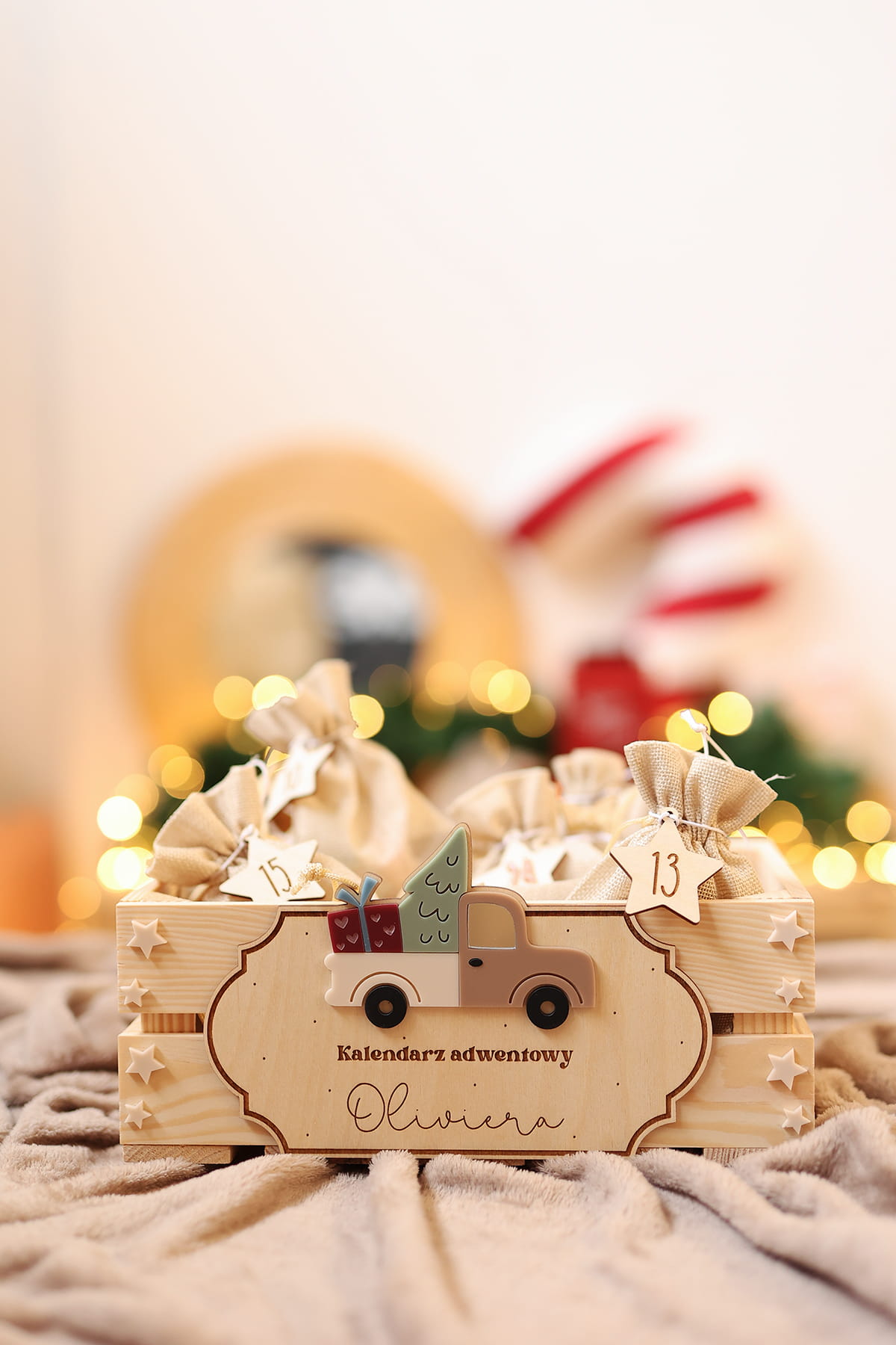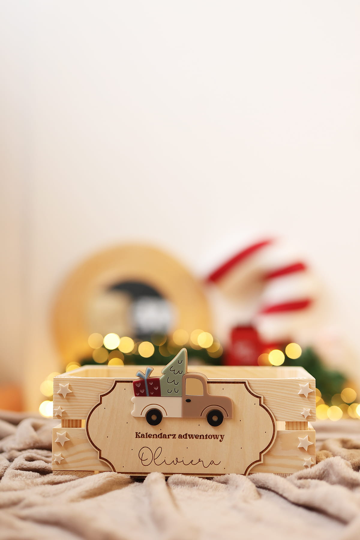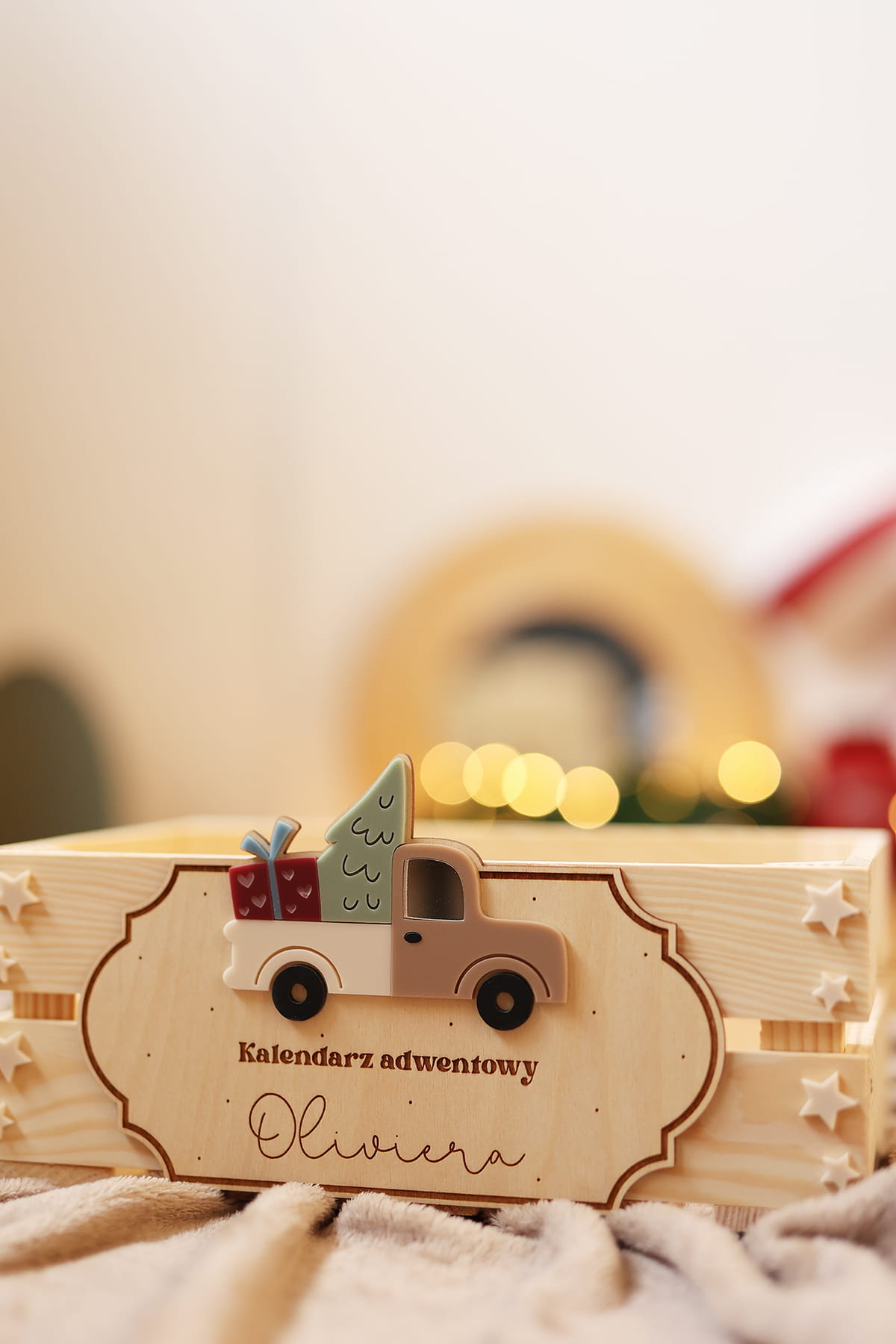 Skrzynia na kalendarz adwentowy z personalizowaną tabliczką z motywem świątecznego samochodu.