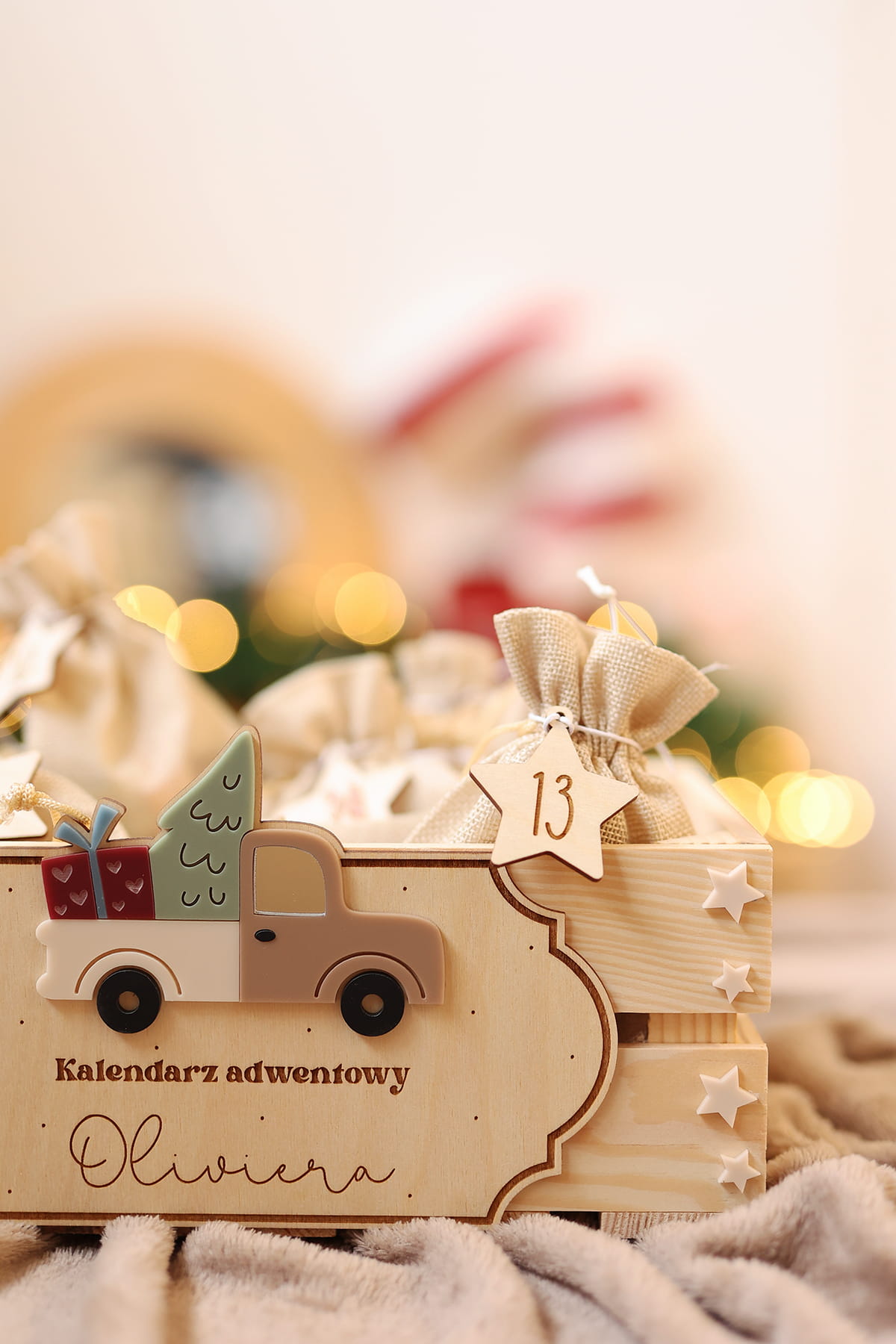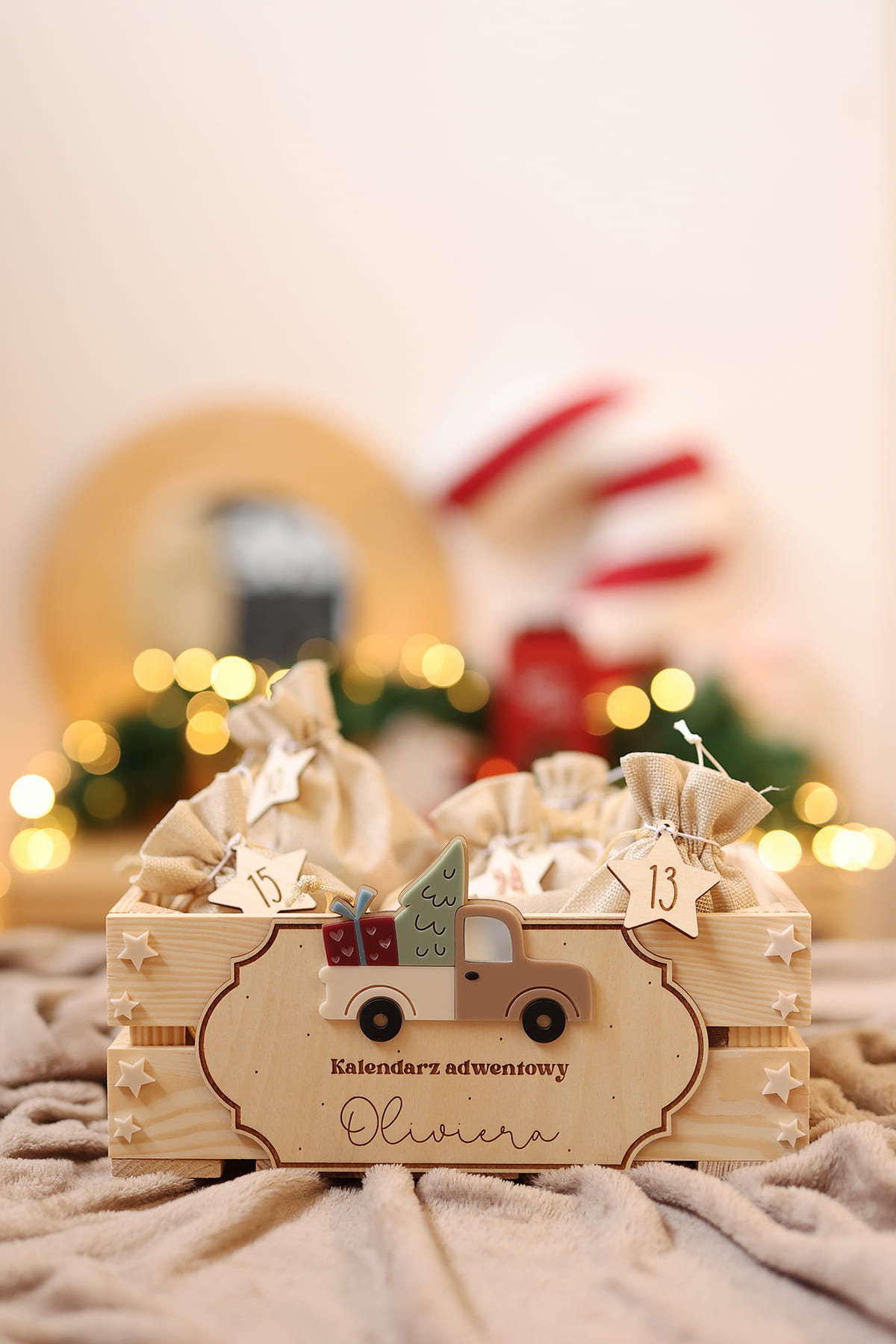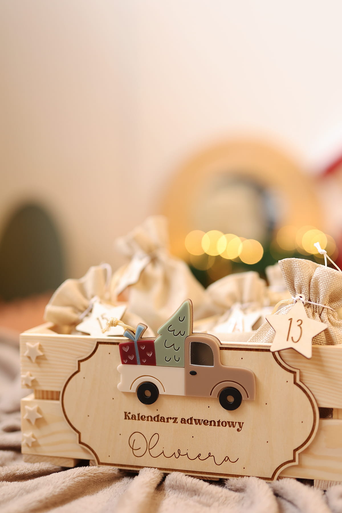 Skrzynia na kalendarz adwentowy z personalizowaną tabliczką z motywem świątecznego samochodu.