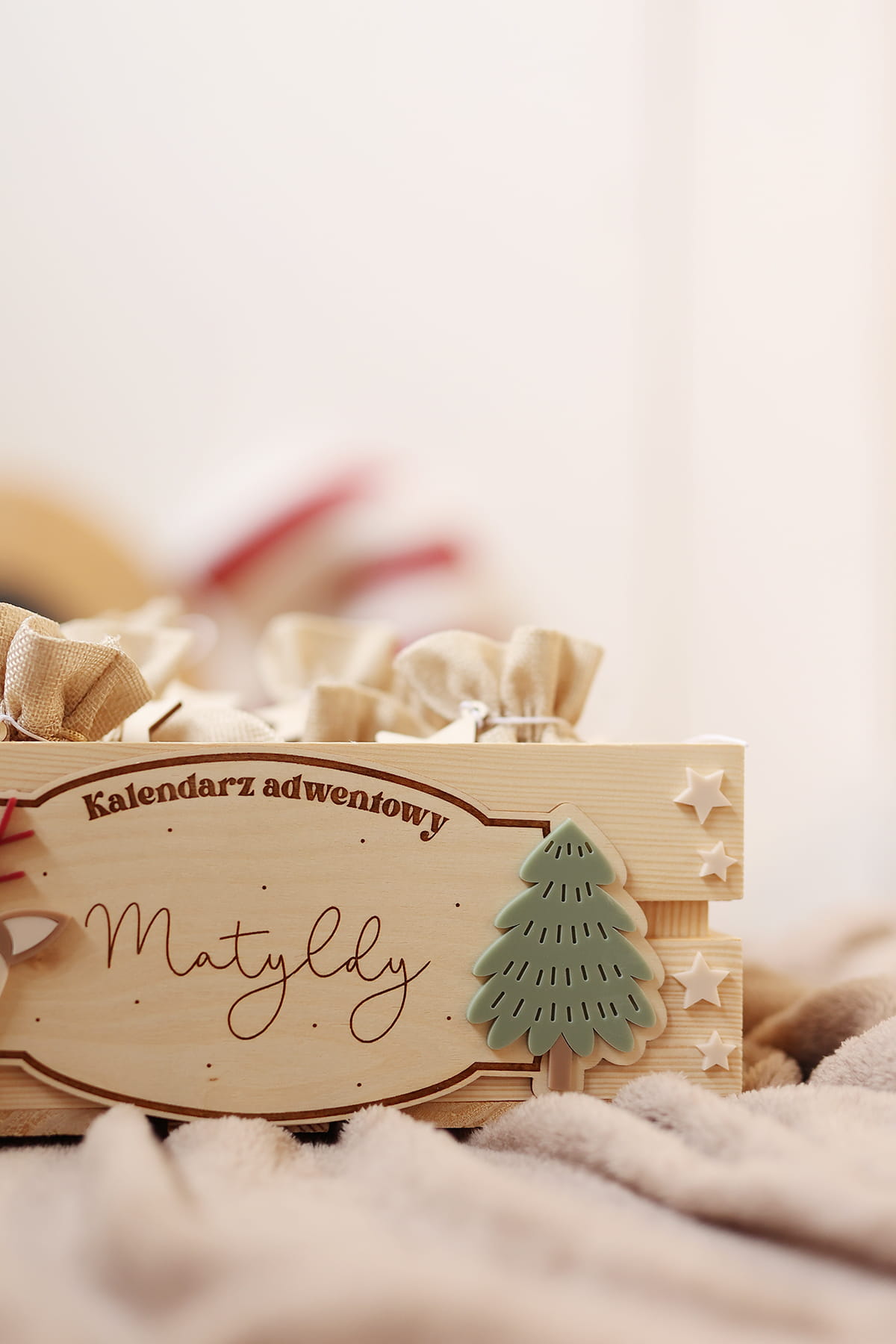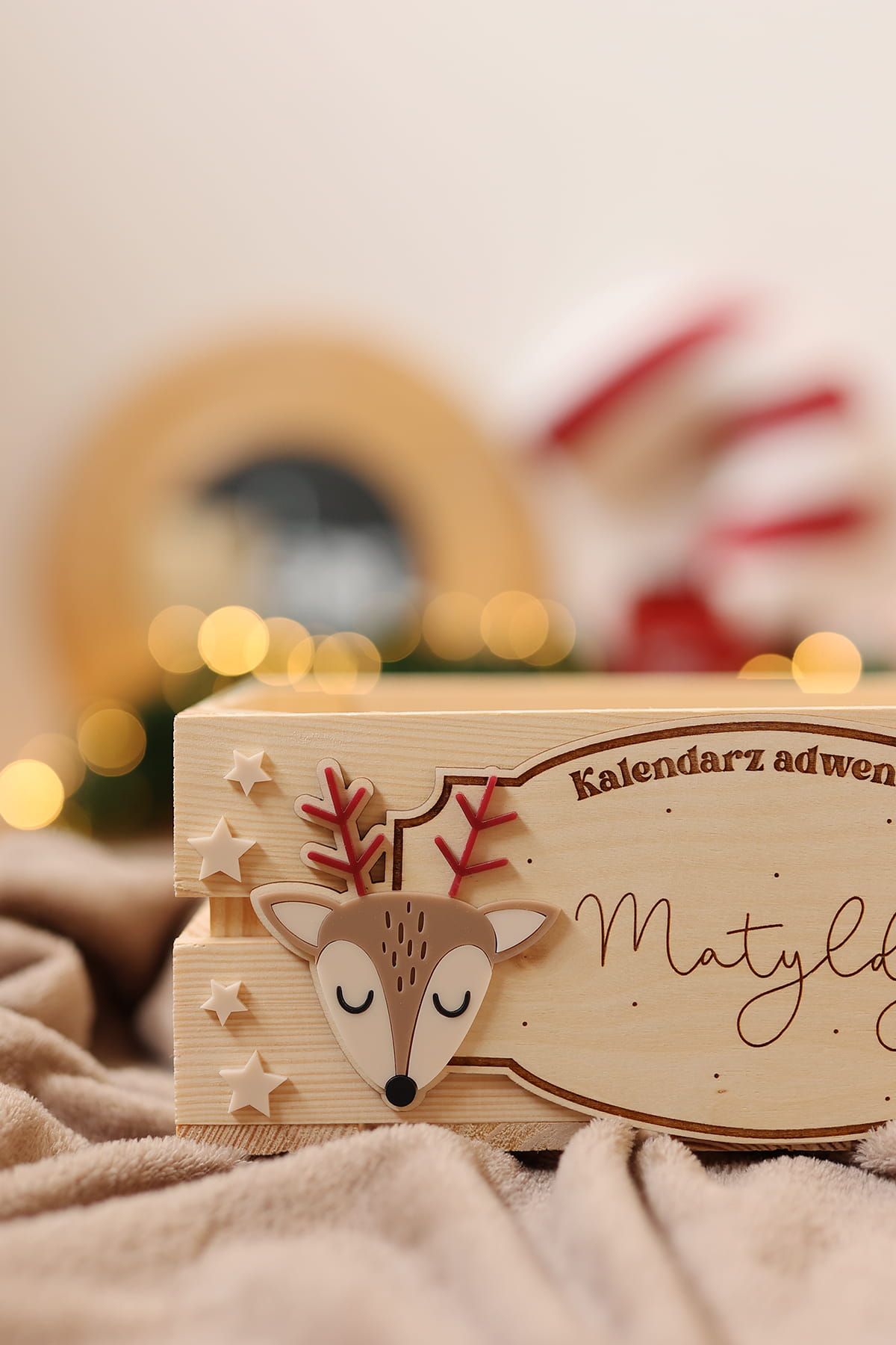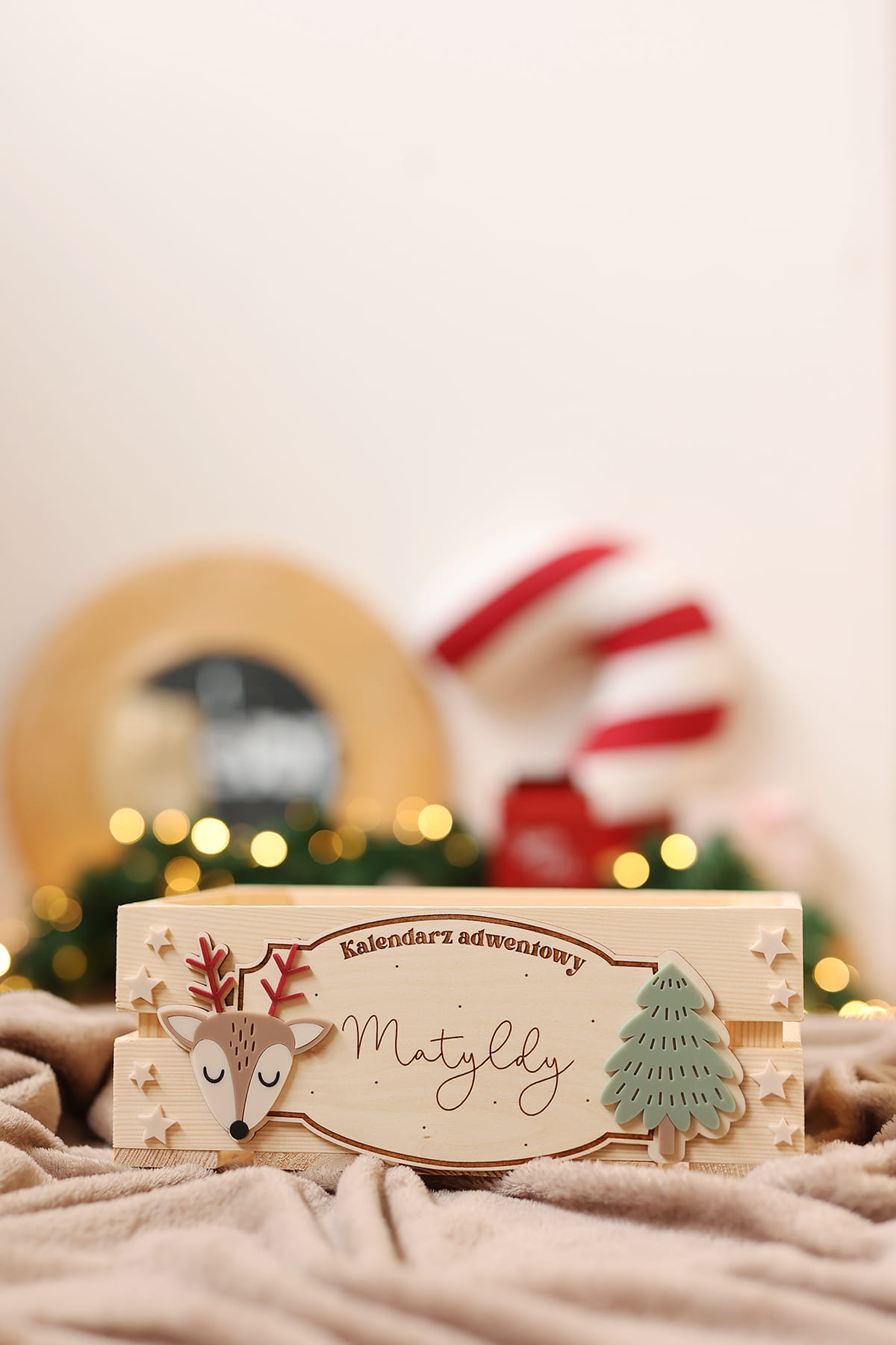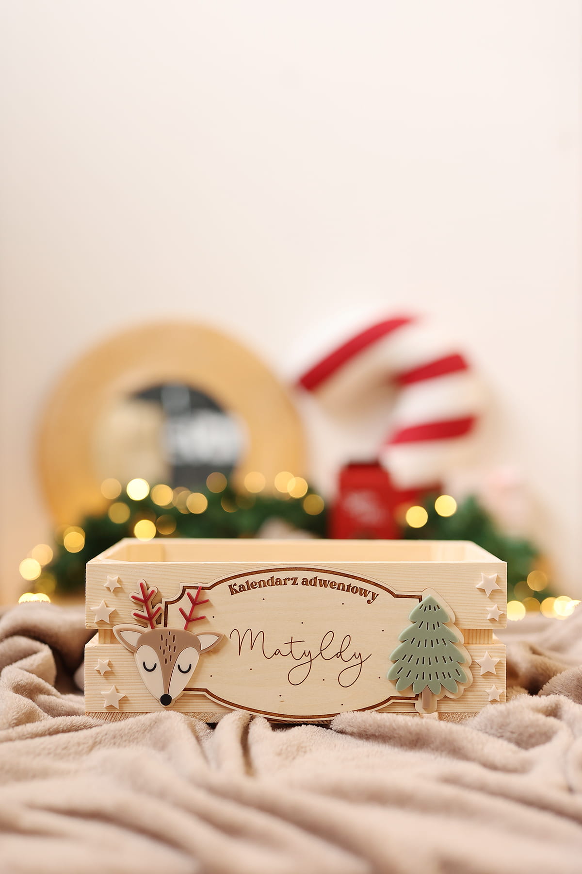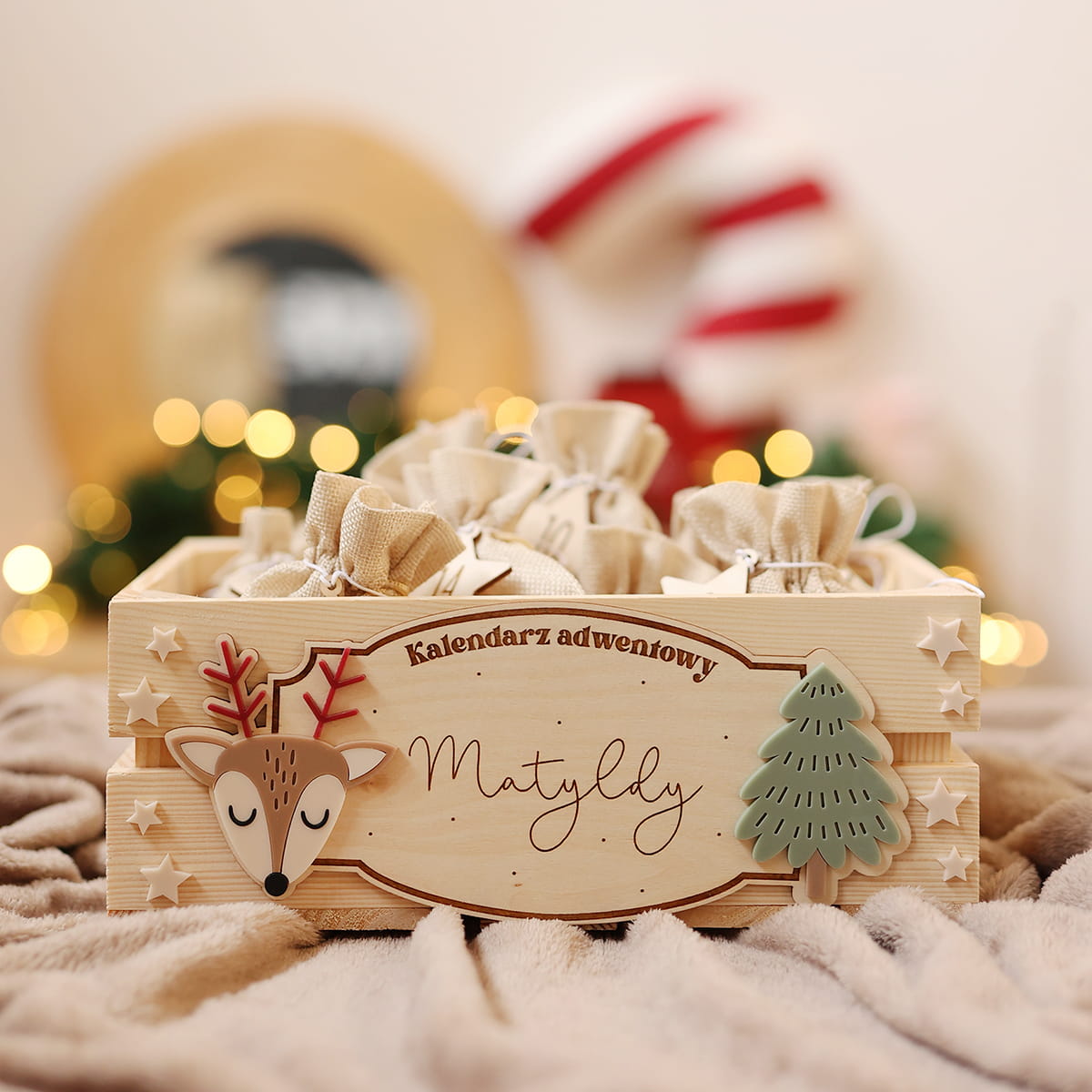 Skrzynia na kalendarz adwentowy z personalizowaną tabliczką z motywem sarenki i choinki.