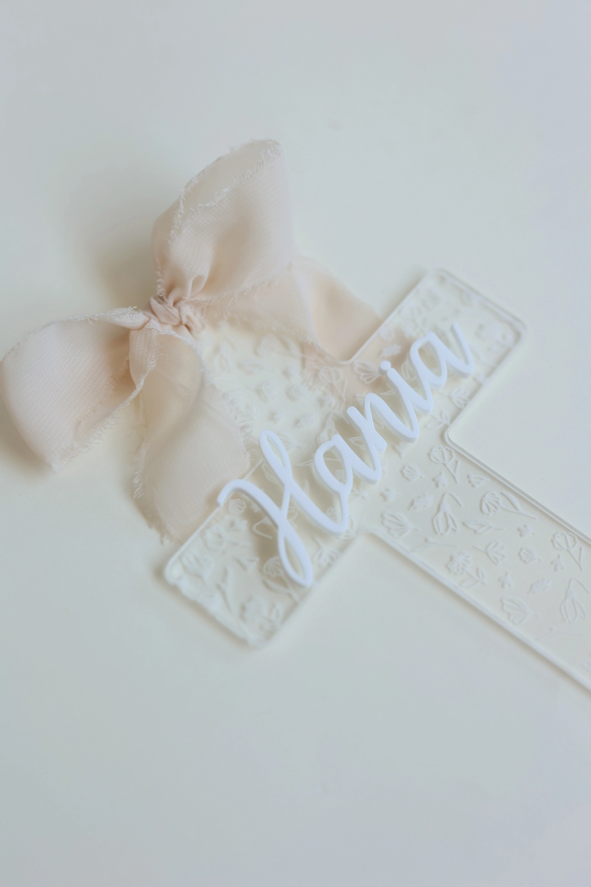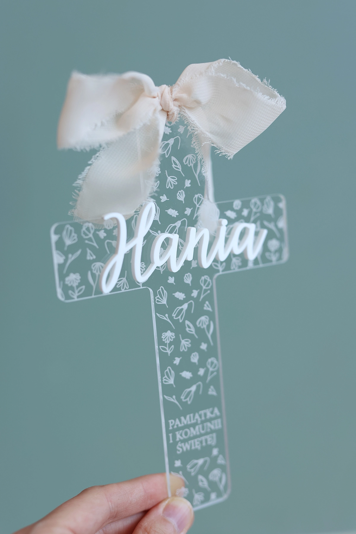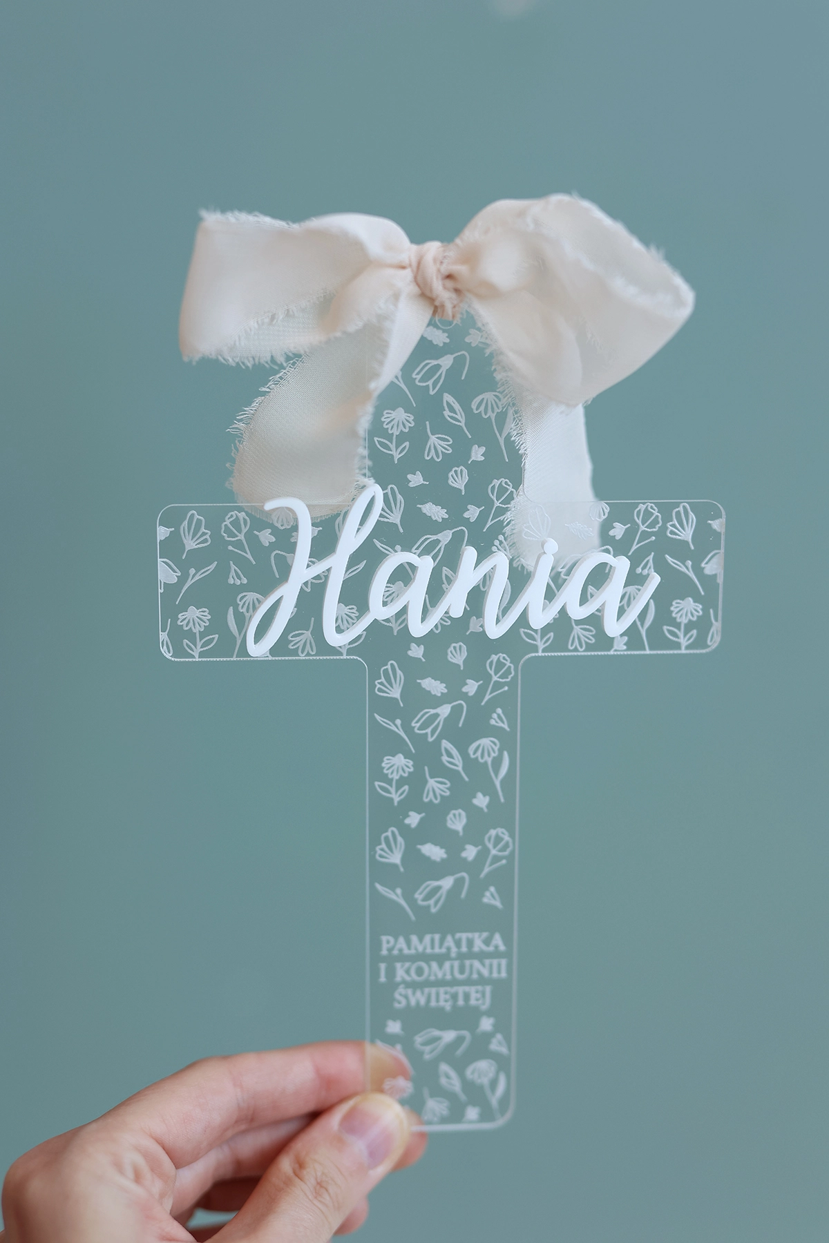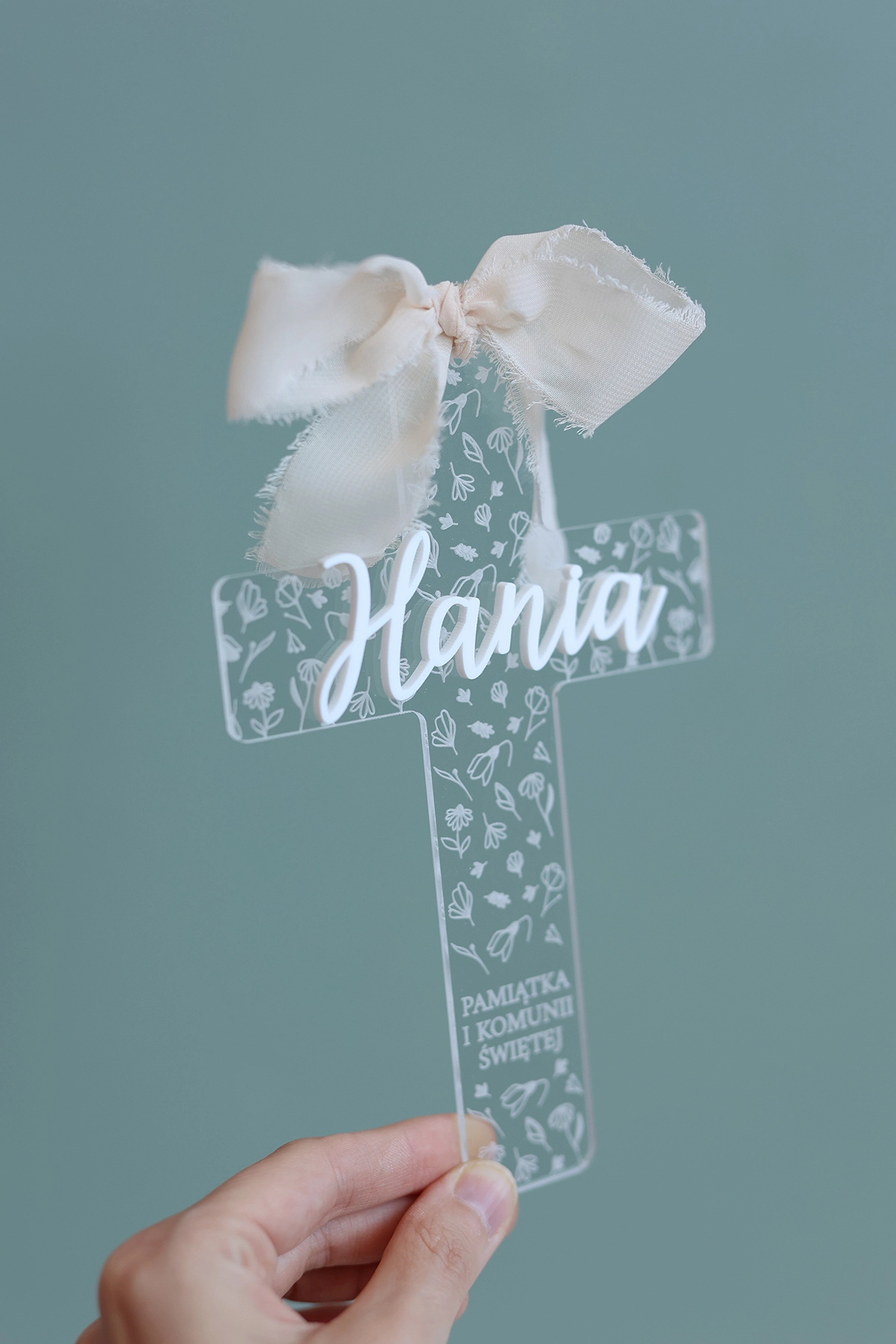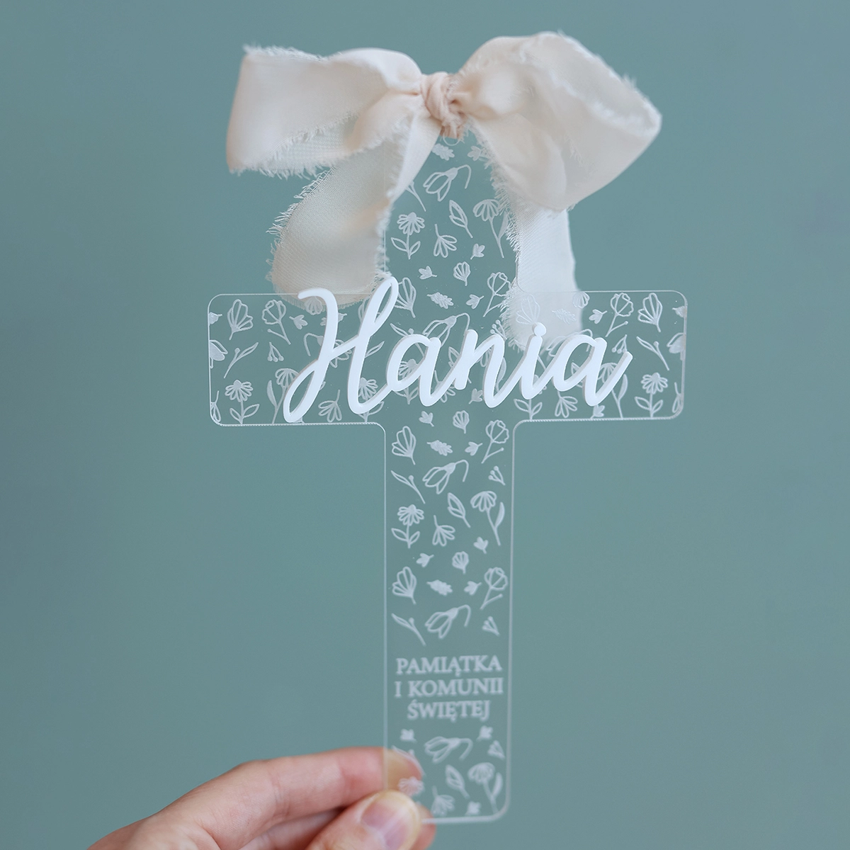 Elegancki transparentny krzyż na komunię z imieniem to wyjątkowa pamiątka Pierwszej Komunii Świętej, która łączy w sobie delikatność, symbolikę i nowoczesny design. Subtelny motyw kwiatowy oraz lekka, szyfonowa wstążka nadają całości wyjątkowo uroczysty i ponadczasowy charakter.