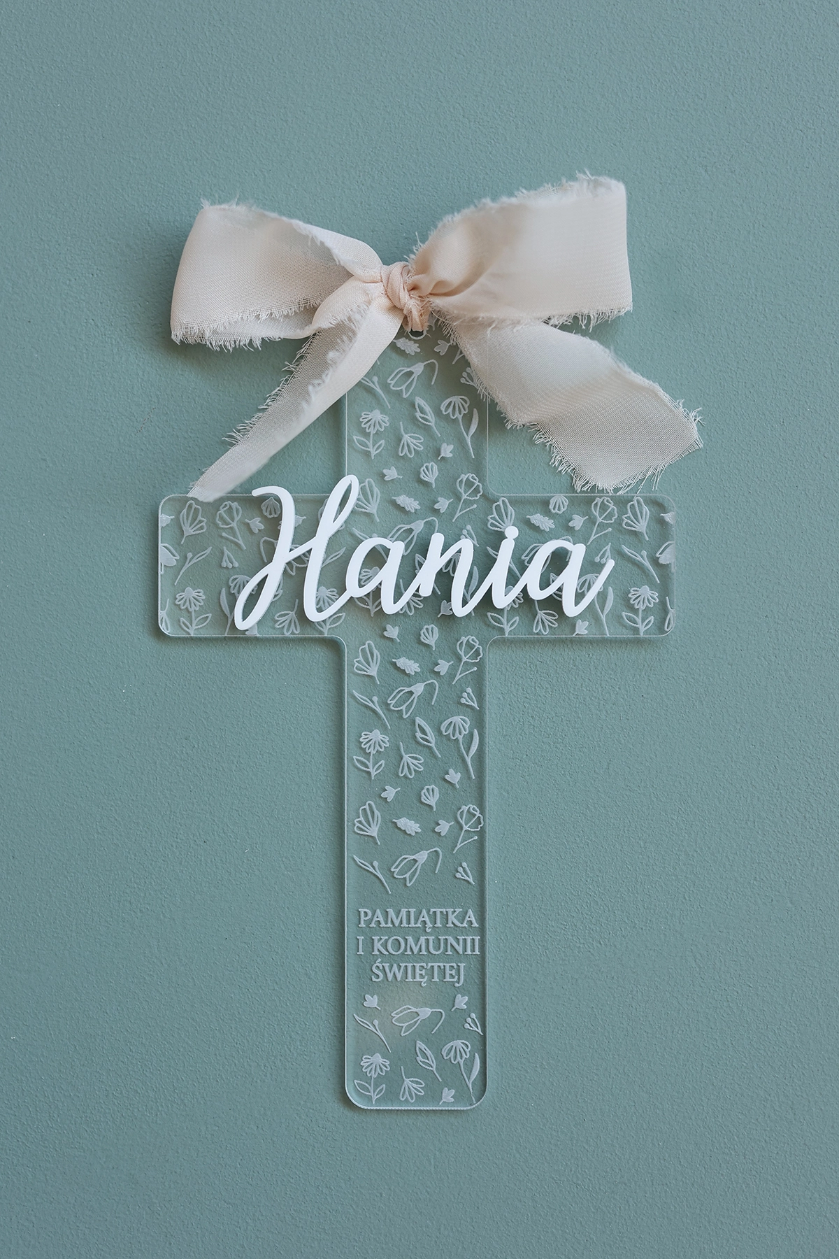 Krzyż wykonany jest z transparentnej pleksi, dzięki czemu prezentuje się lekko i elegancko. Personalizowane imię w wybranym kolorze sprawia, że każdy egzemplarz jest unikalny i tworzony specjalnie na tę wyjątkową okazję.