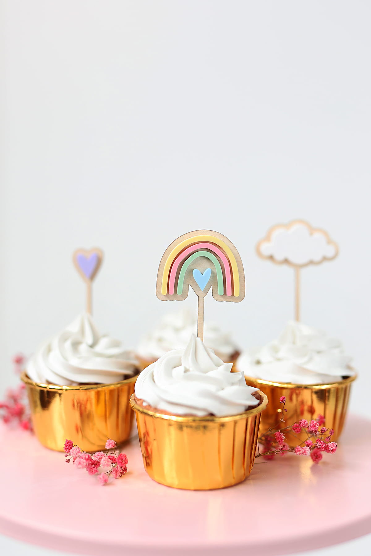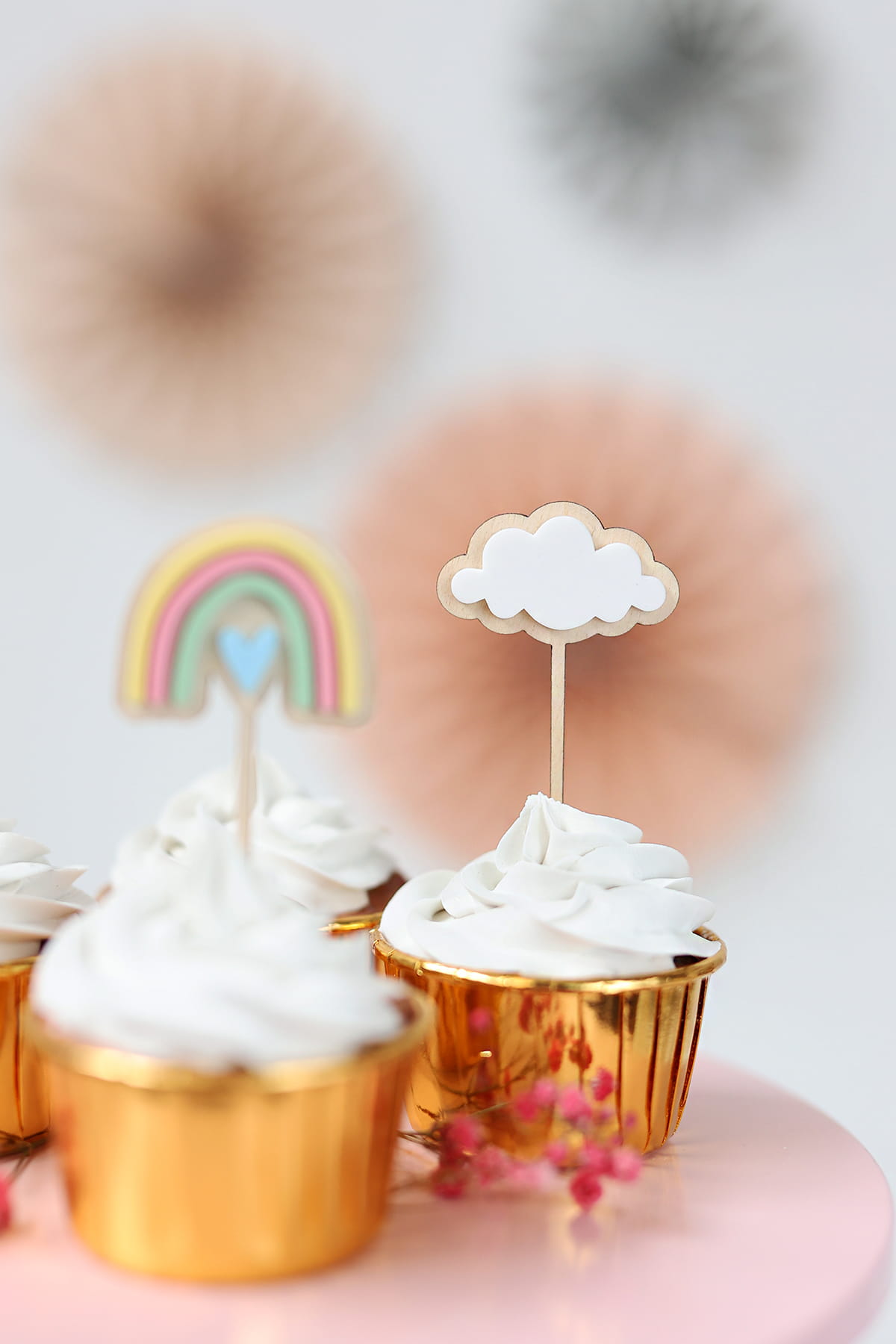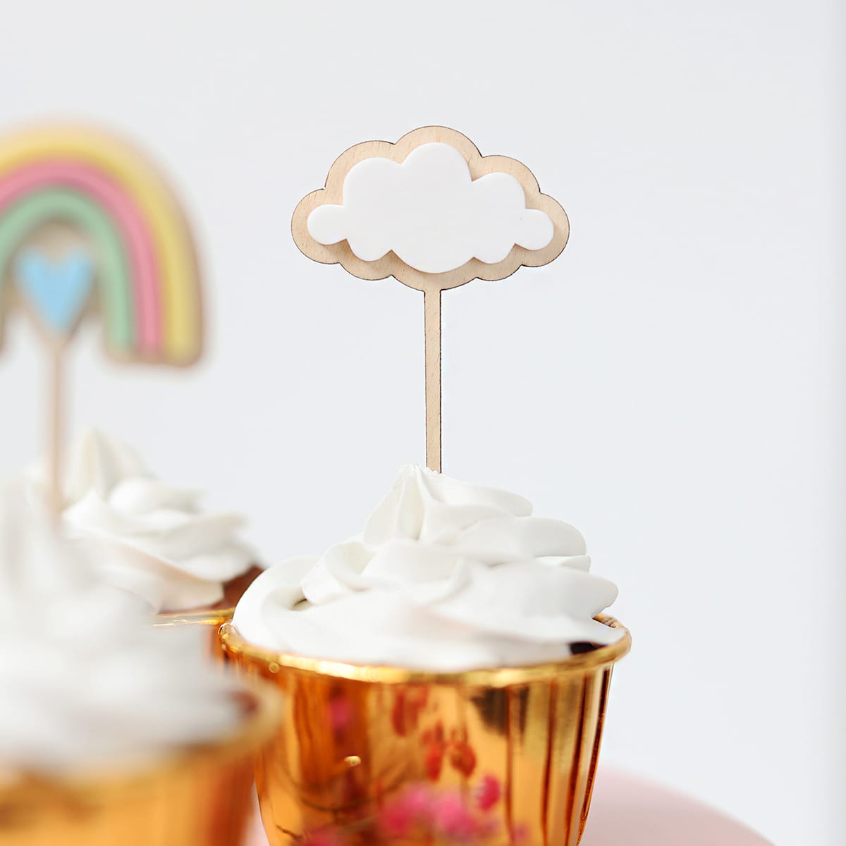 Mini topper w kształcie chmurki składający się z drewnianej bazy i białej chmurki.