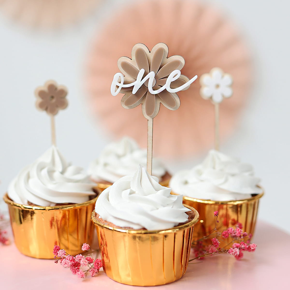 Mini topper w kształcie stokrotki w naturalnym odcieniu, ozdobiony napisem "one". Topper ozdobi babeczki lub inne deserki na pierwszych urodzinach.