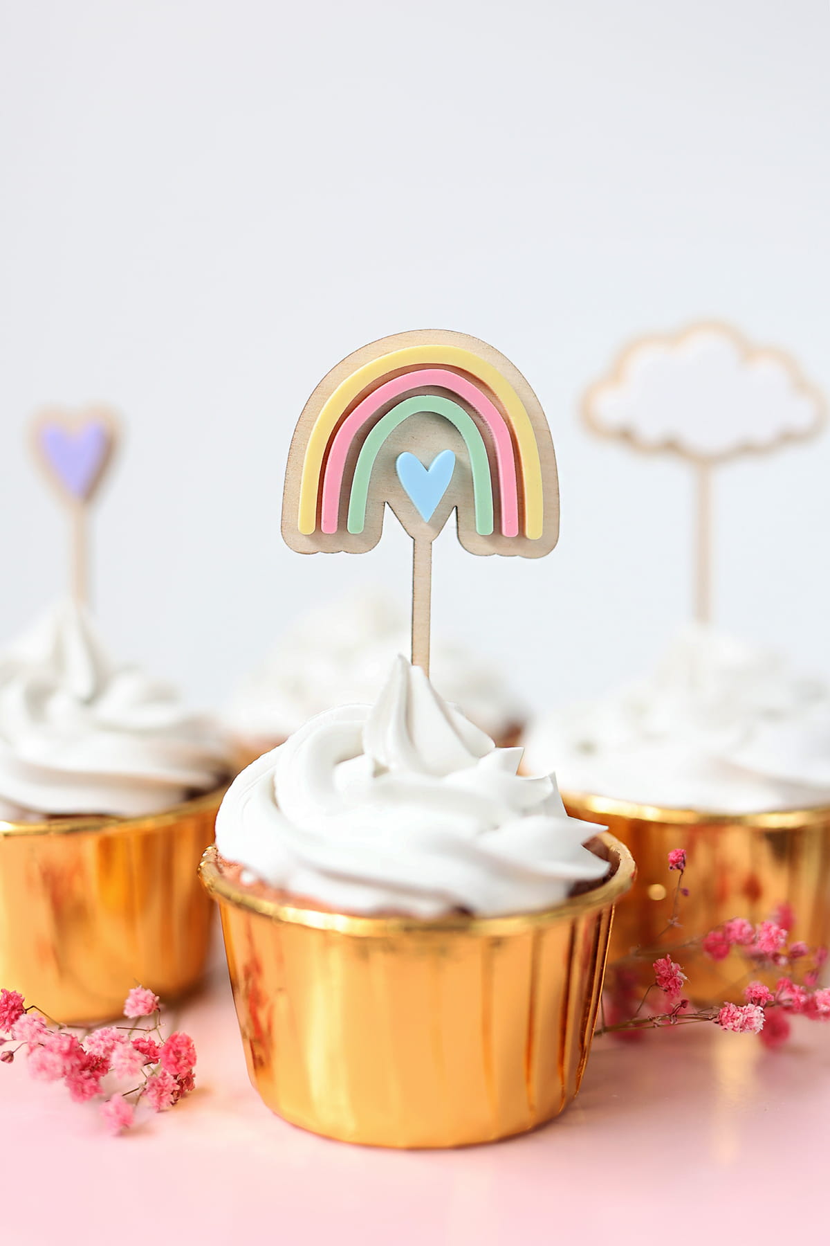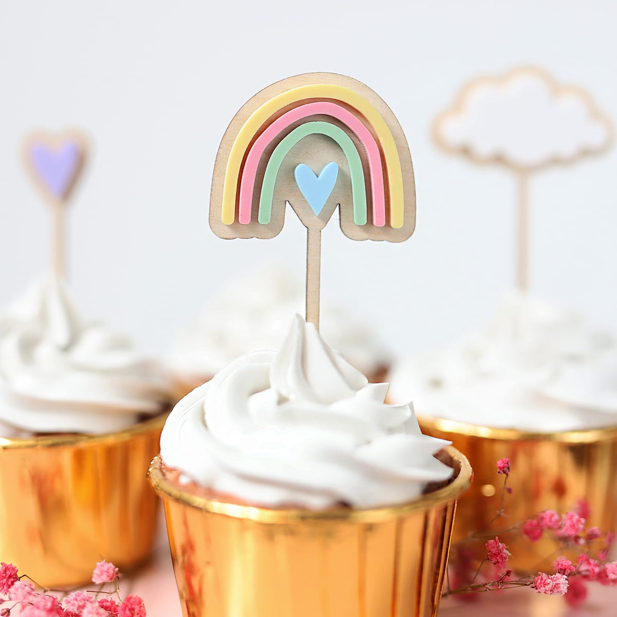 Mini topper w kształcie tęczy z kolorowymi, naklejanymi łukami i uroczym serduszkiem.