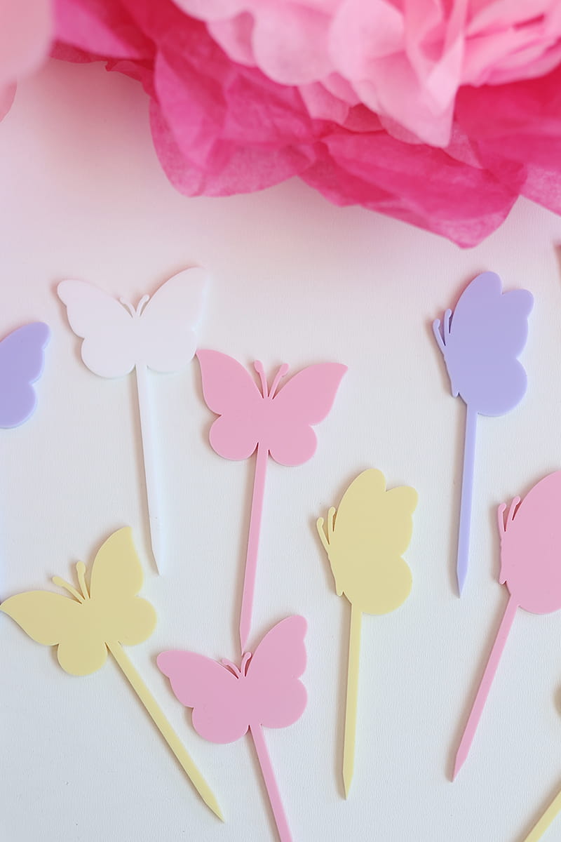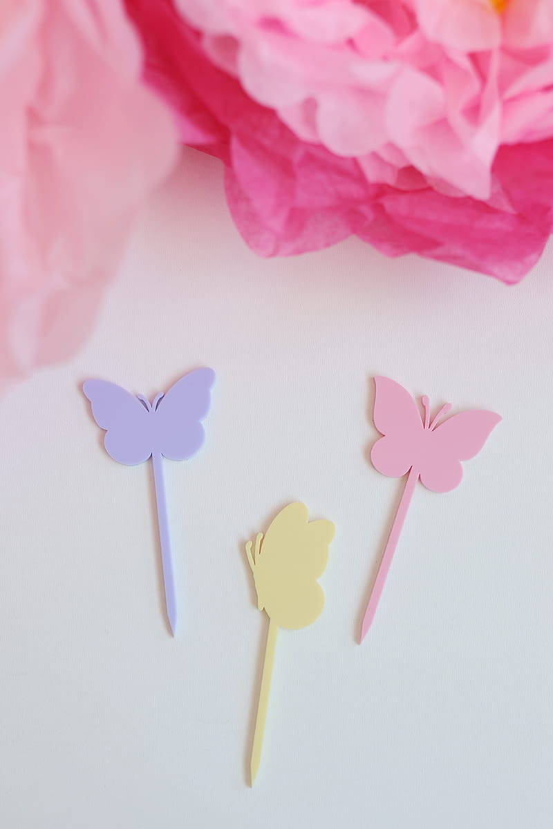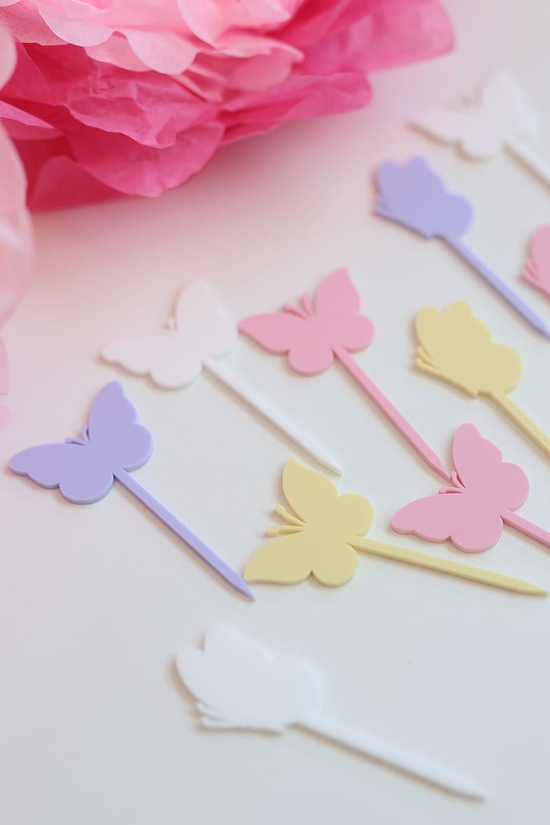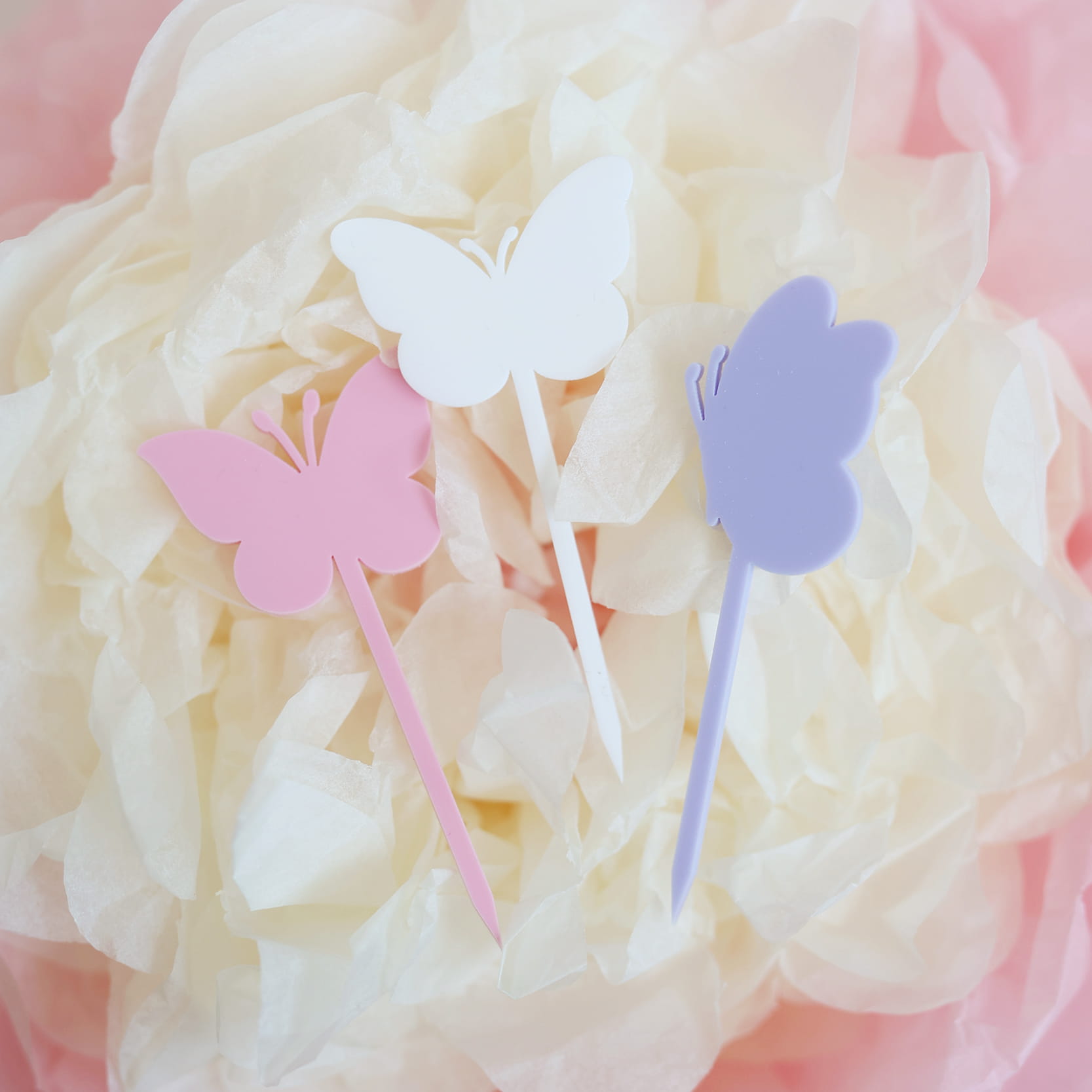 Zestaw 3 kolorowych mini topperów w kształcie motylków.