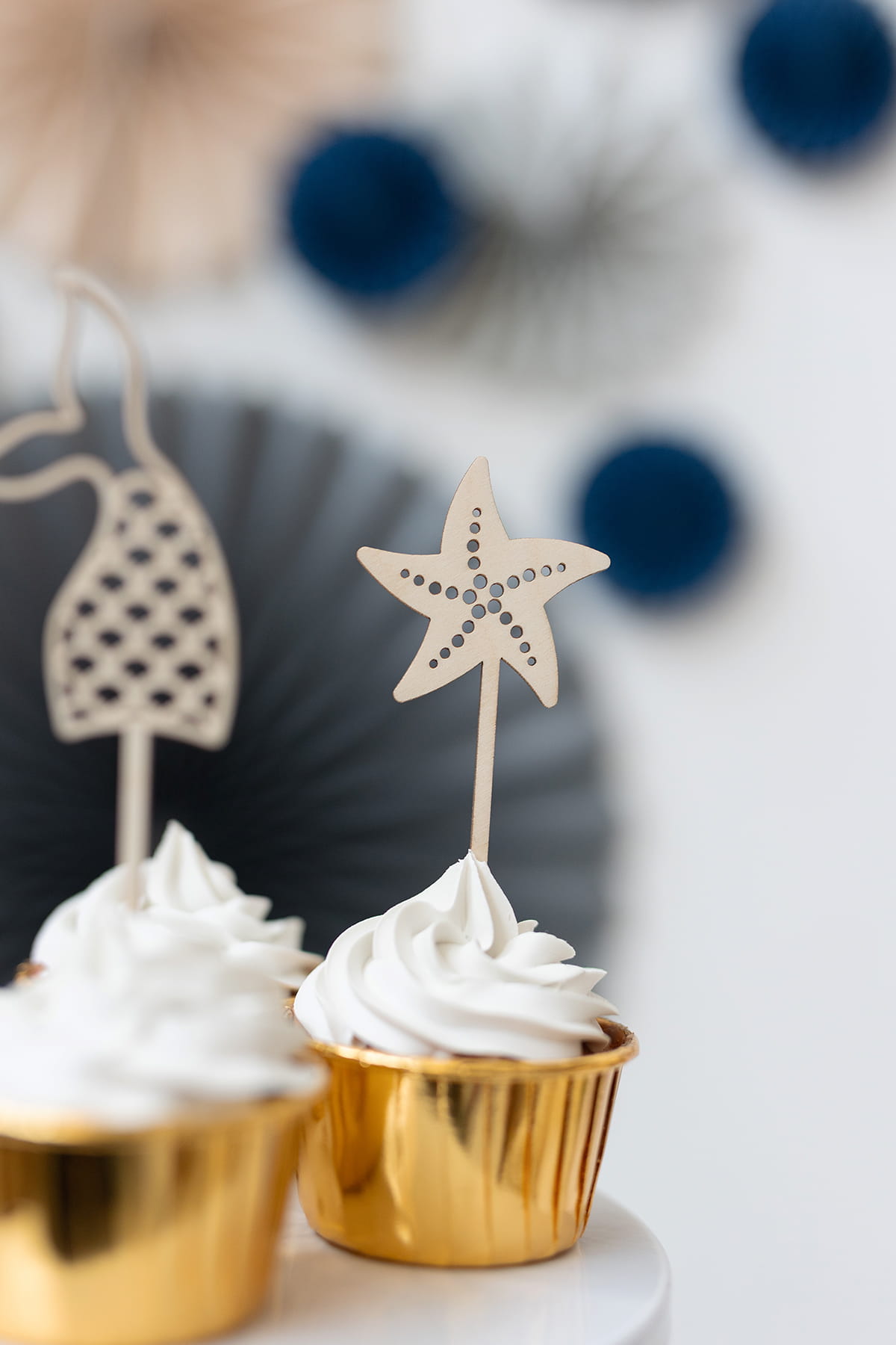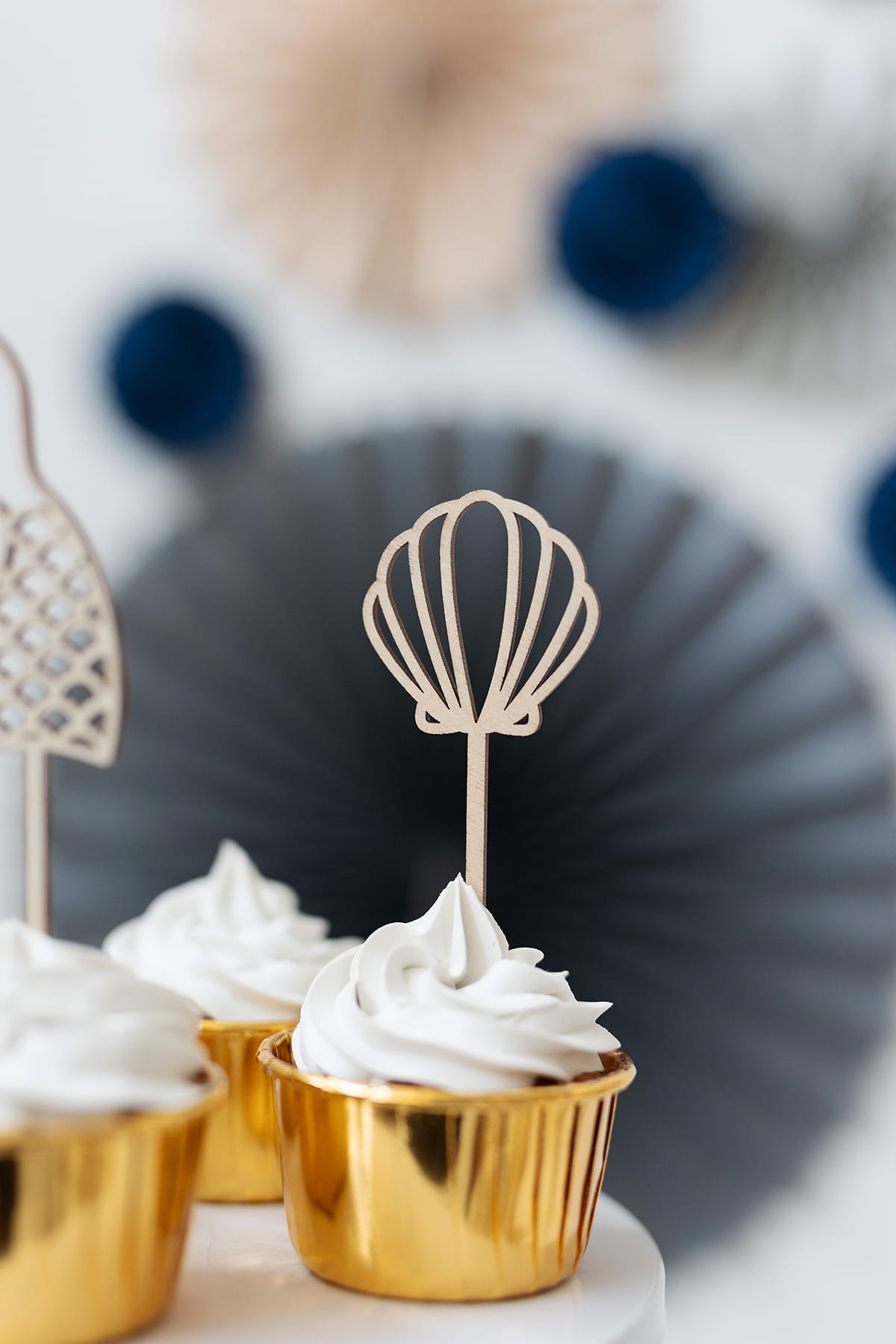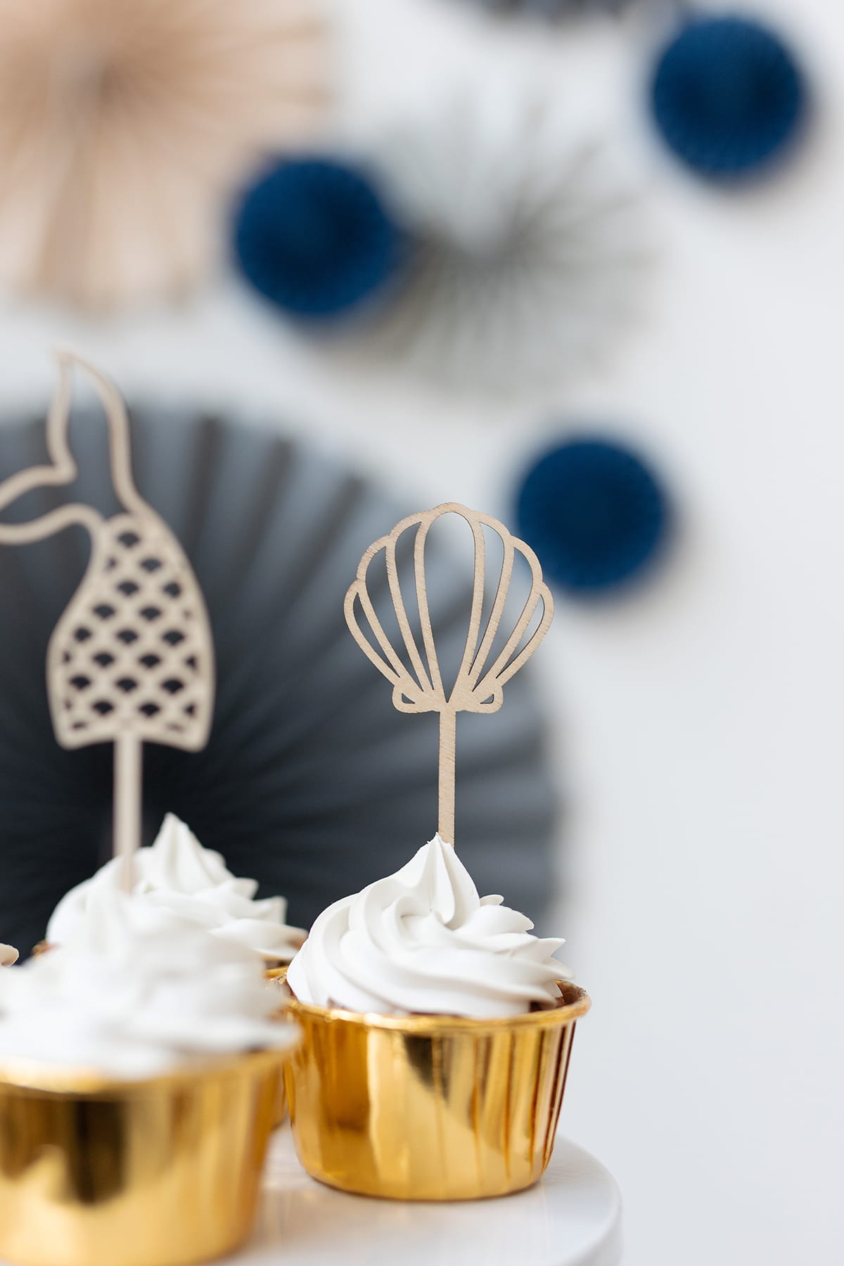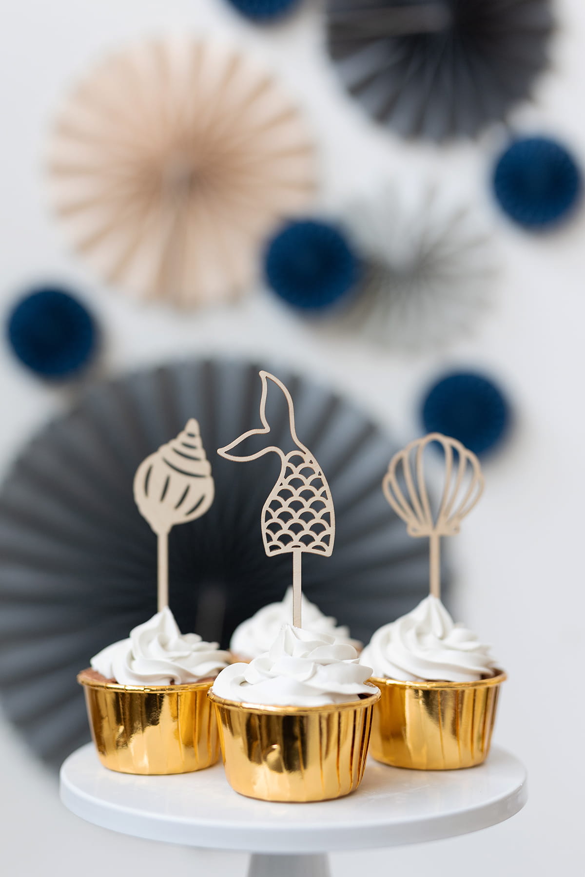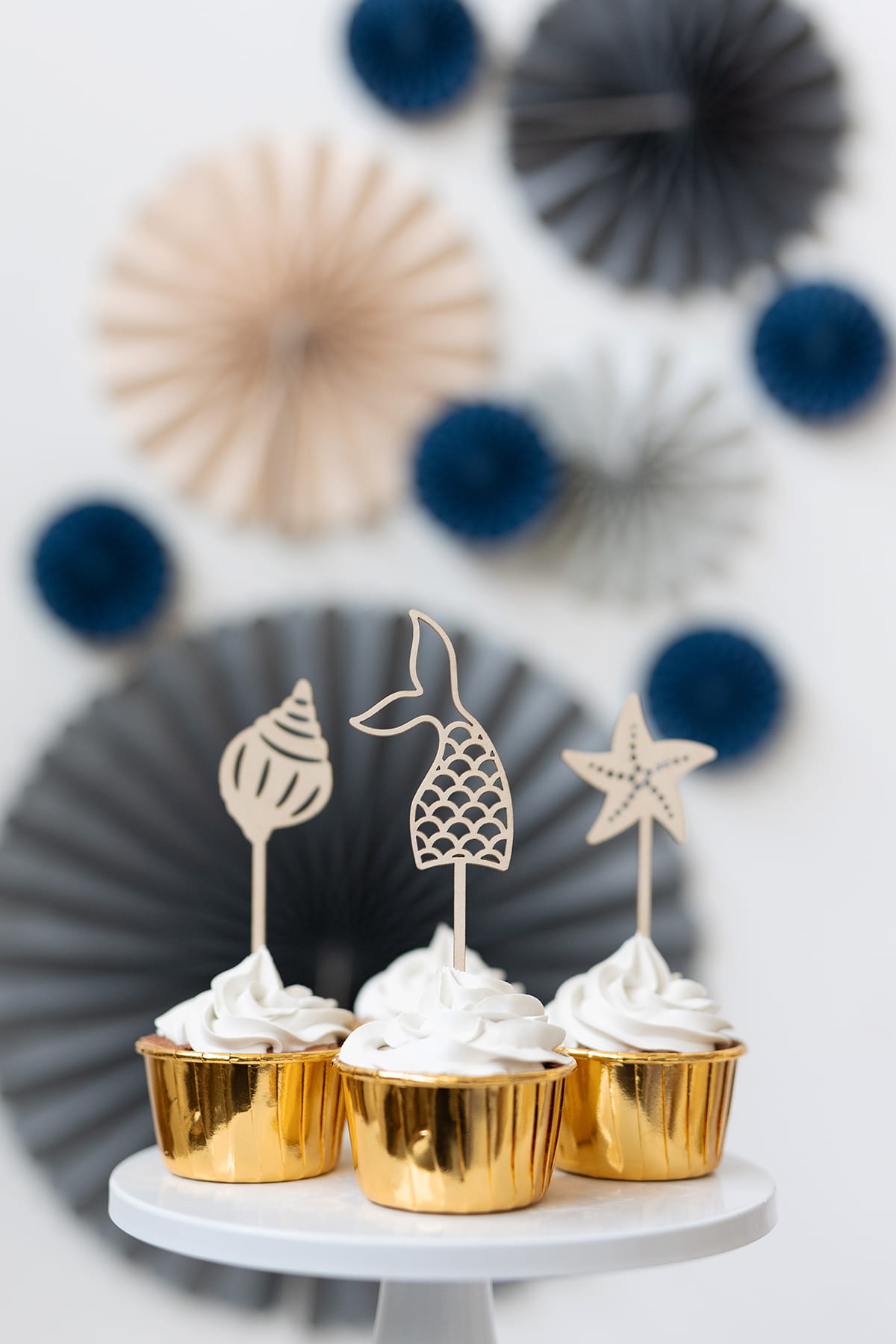 Zestaw 4 drewnianych mini topperów z motywem morskiego świata syrenki.