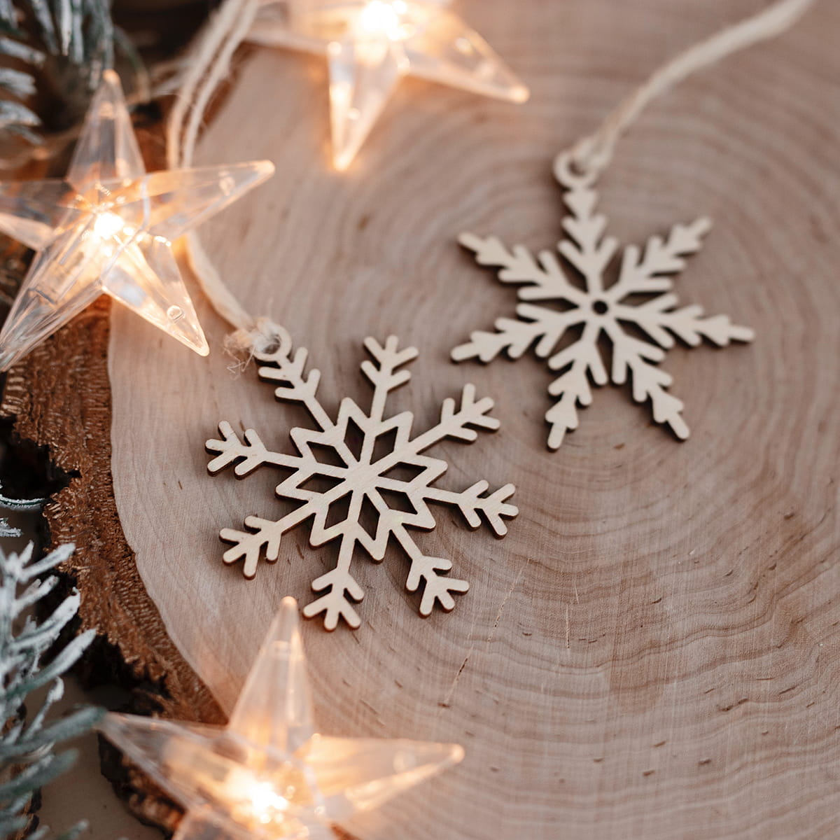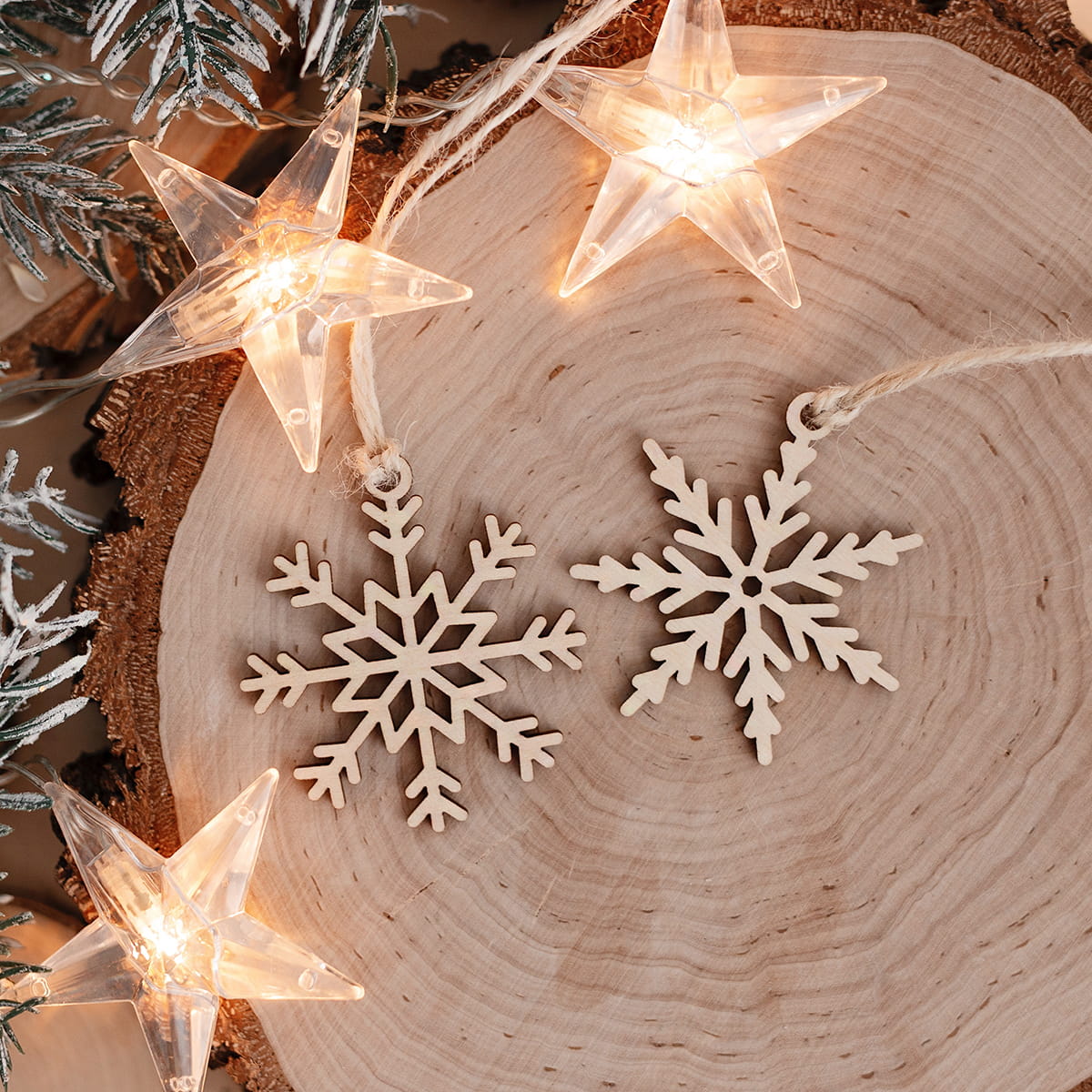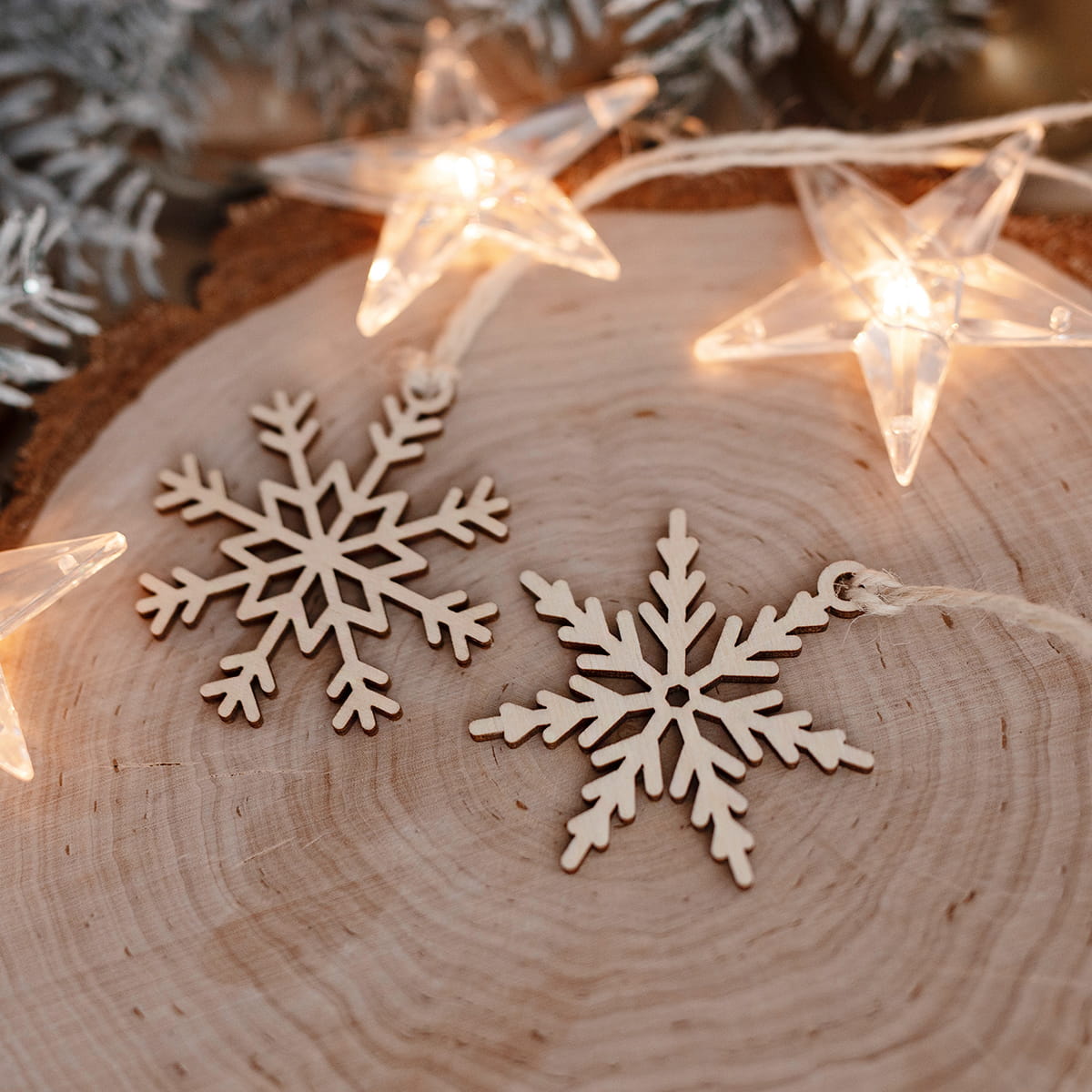 Zestaw dwóch drewnianych mini zawieszek w kształcie śnieżynek. Ciekawa alternatywa dla tradycyjnych ozdób choinkowych, dekoracji prezentowych czy zdobień kalendarza adwentowego.