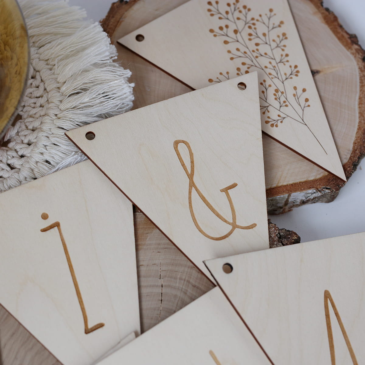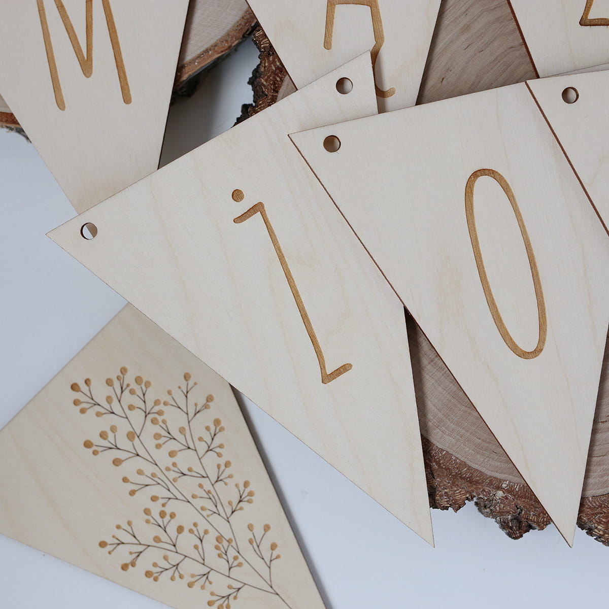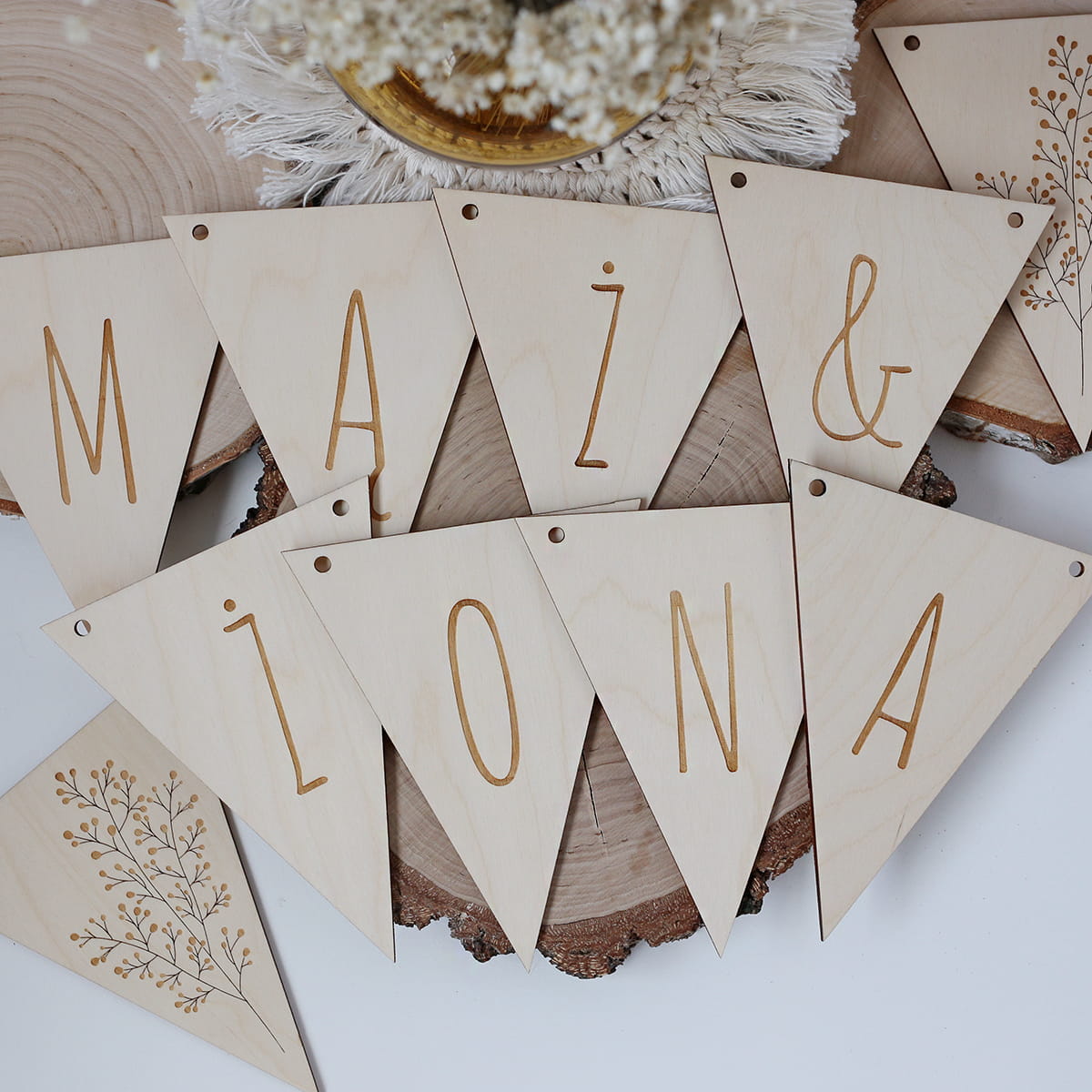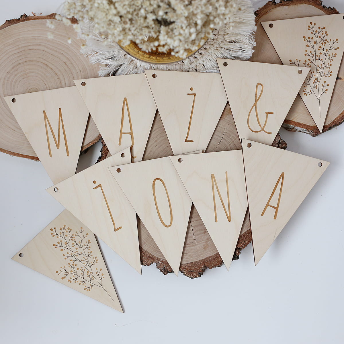 Drewniana, trójkątna girlanda "MĄŻ&ŻONA" z dwoma dekorami z kwiatowym motywem. Zestaw zawiera 10 elementów + jutowy sznureczek.