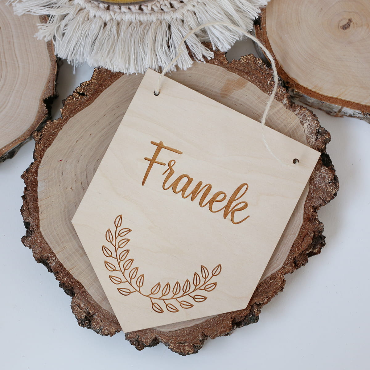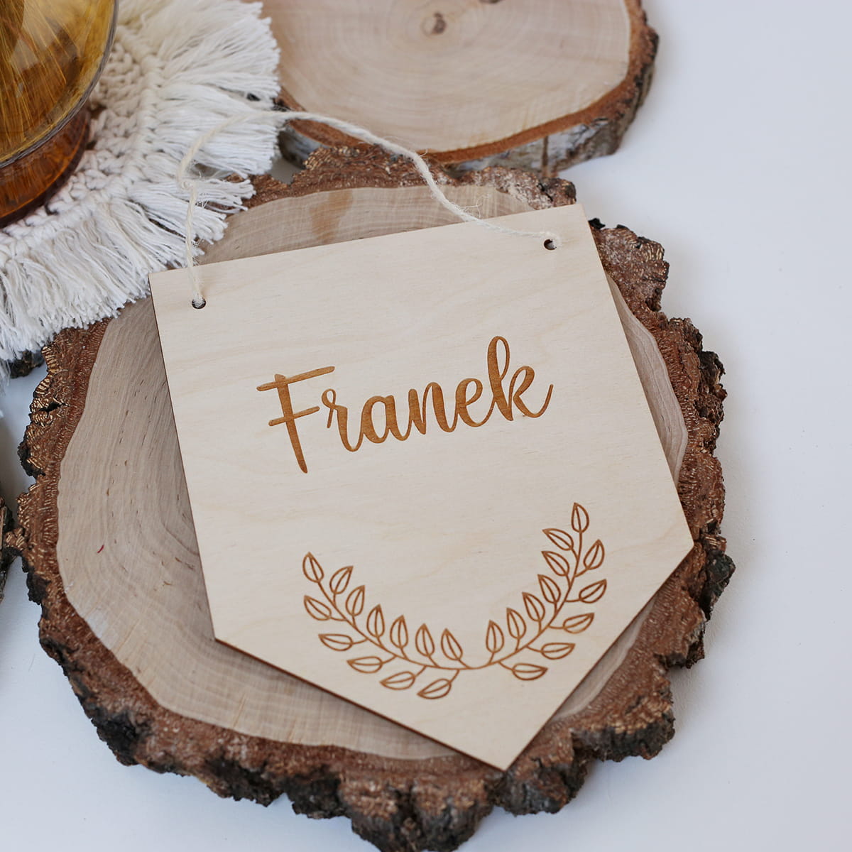 Drewniana tabliczka w kształcie proporczyka z motywem listków i imieniem "Franek". W zestawie jutowy sznureczek.