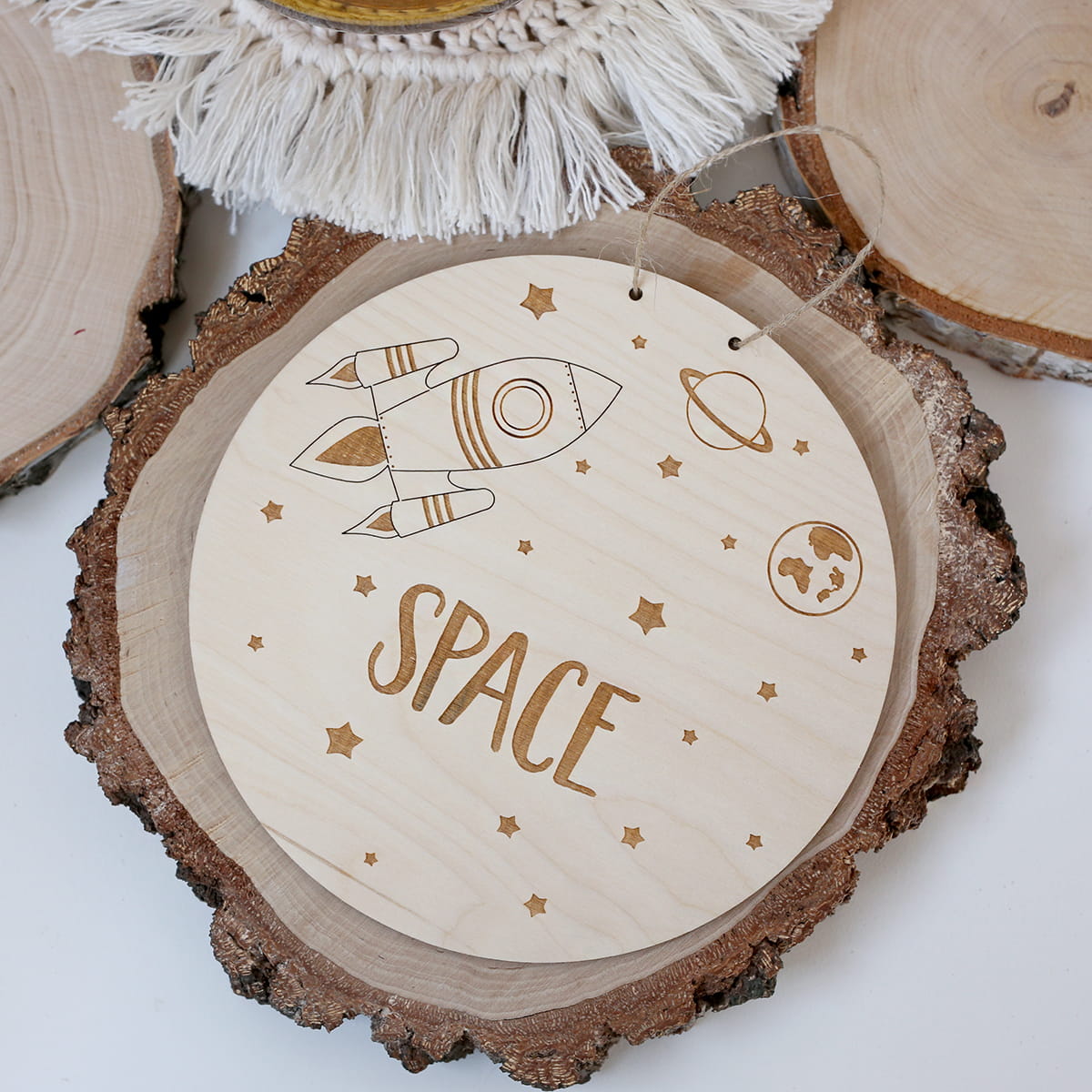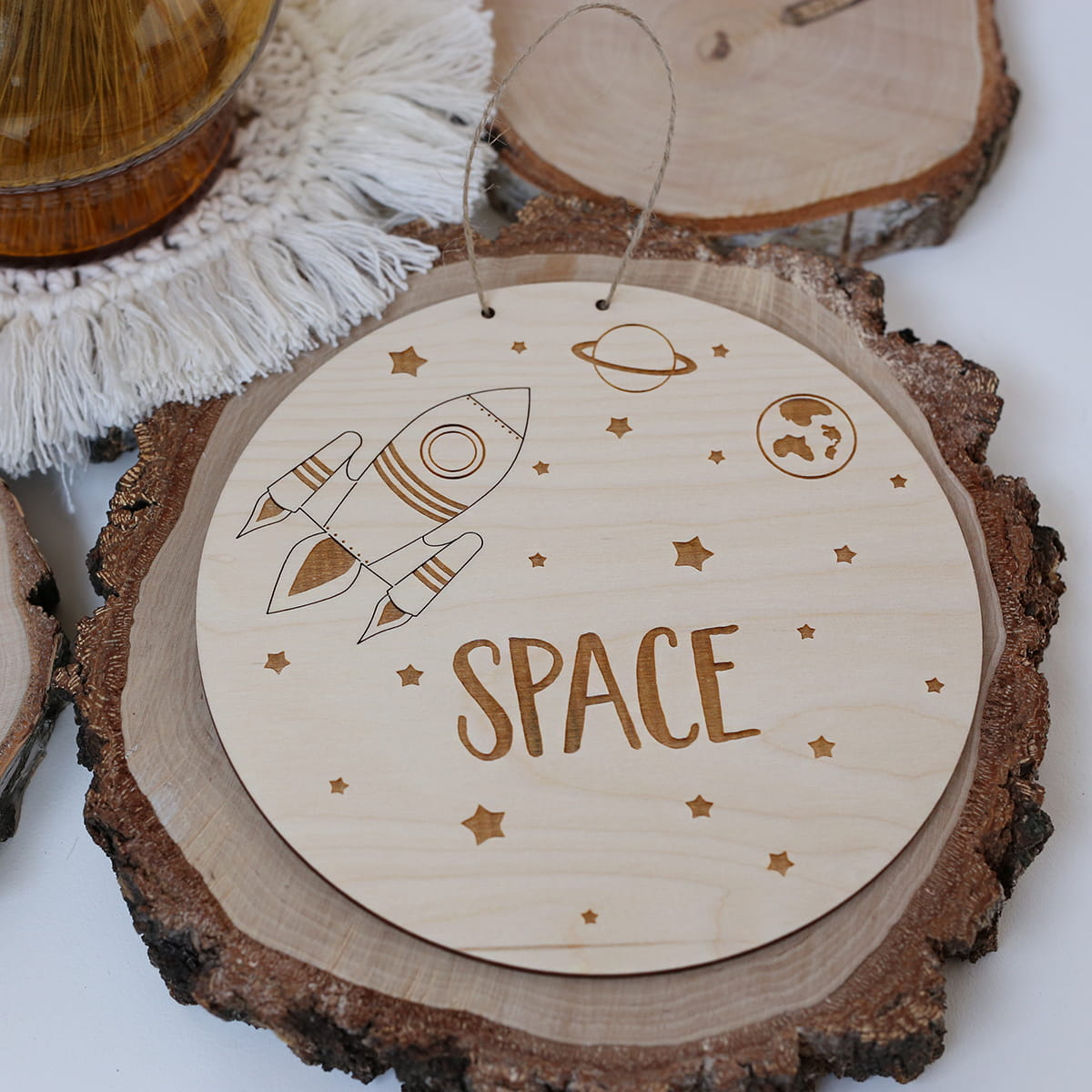 Drewniana tabliczka z motywem kosmosu i napisem "SPACE". W zestawie sznureczek jutowy.