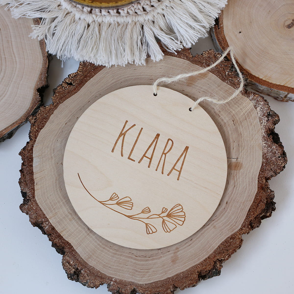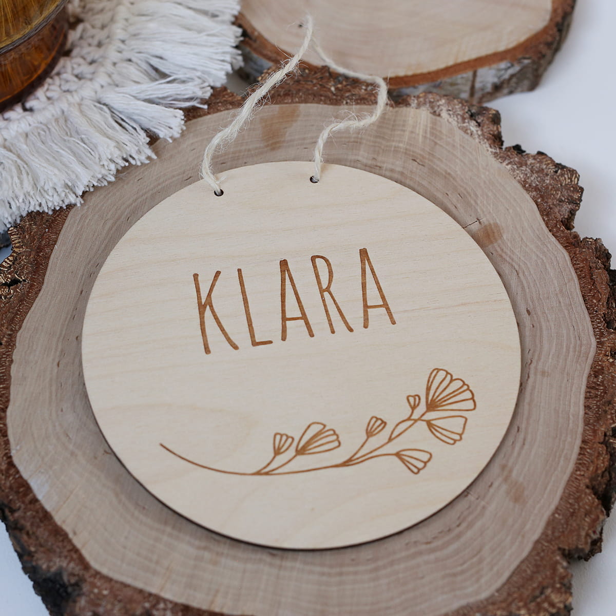 Drewniana tabliczka z delikatnym motywem kwiatowym i imieniem "KLARA". W zestawie jutowy sznureczek.