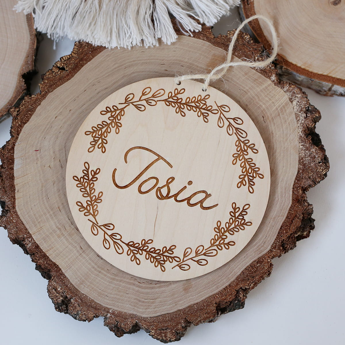 Drewniana tabliczka z motywem roślinnym i imieniem "Tosia". W zestawie sznureczek jutowy.