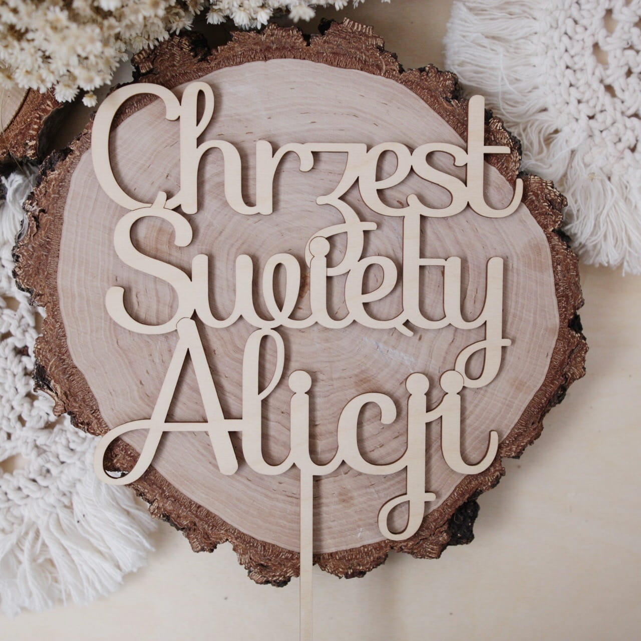 Drewniany topper z napisem "Chrzest Święty Alicji"