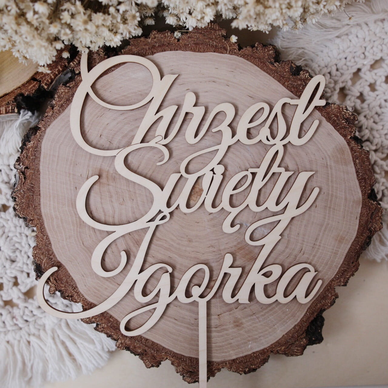 Drewniany topper z napisem "Chrzest Święty Igorka"